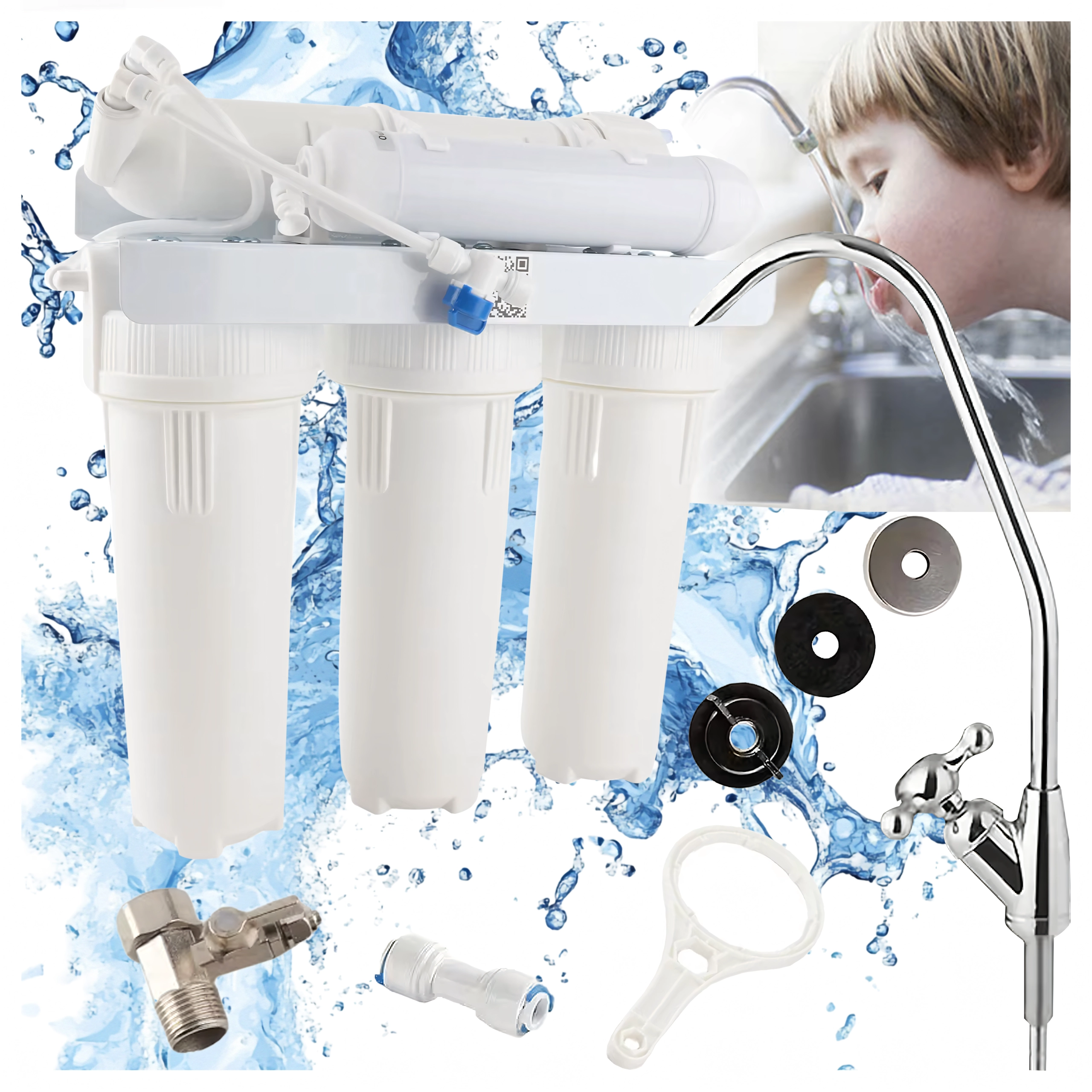 Modern ivóvízkezelő rendszer fordított ozmózissal, amely akár 99% szennyeződést eltávolít, beleértve a klórt, a nehézfémeket, a baktériumokat, a mikroműanyagokat és a peszticideket. Áram nélkül működik – elegendő a víznyomás. A 5 fokozatú szűrésnek és a mineralizátornak köszönhetően tiszta, egészséges és ízletes vizet kap közvetlenül a csapból – ideális iváshoz, főzéshez és italok készítéséhez. Pénzt takarít meg, környezetbarát és kényelmes – vége a palackozott víznek!