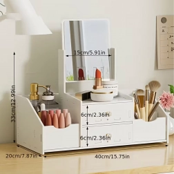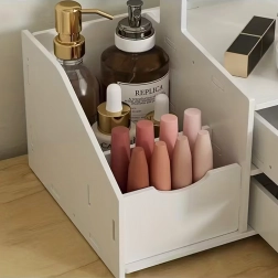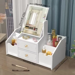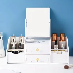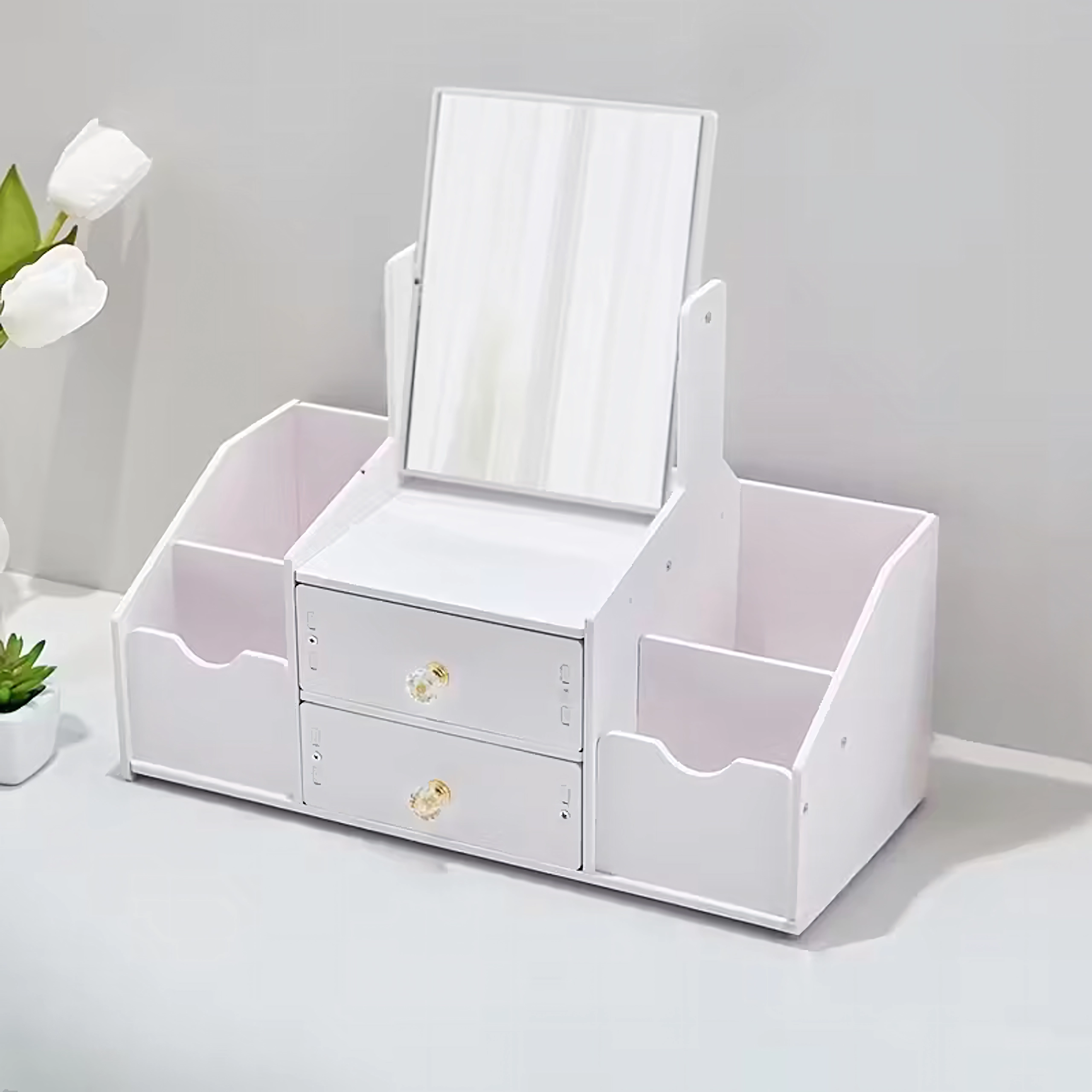 A praktikus, több szekciós kialakítás lehetővé teszi az ápoló kozmetikumok, a dekor smink és az ékszerek elkülönítését. A két fiók elnyeli az apróságokat, az oldalsó rekeszek ideálisak a magasabb üvegcséknek és ecseteknek, az elülső rész pedig kézközelben tartja a rúzsokat és ceruzákat. A kompakt méretek helyet takarítanak meg a fésülködőn és a komódon.