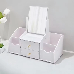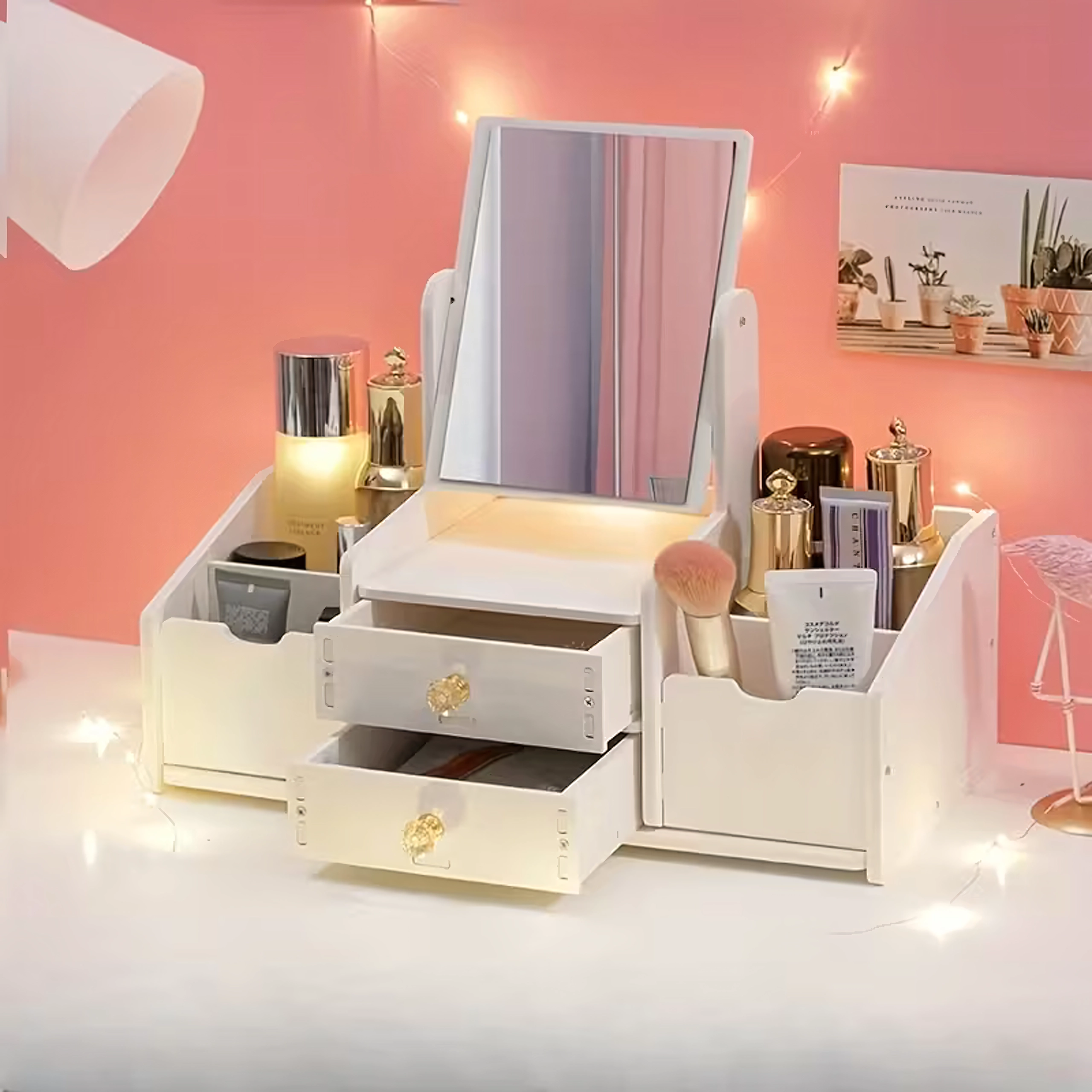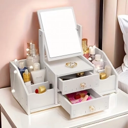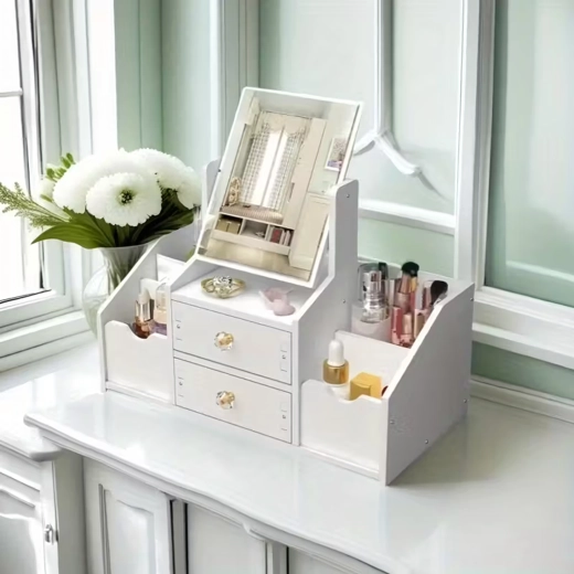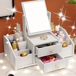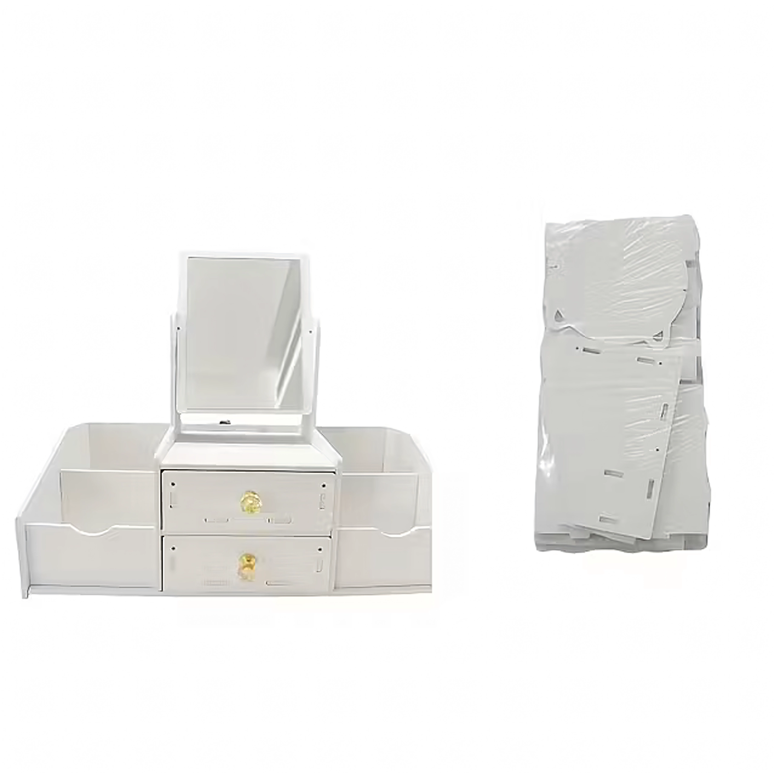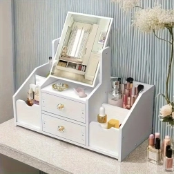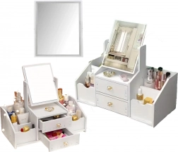 Ez a mini fésülködőasztal egyesíti az ékszerdobozt és a kozmetikai rendszerezőt. A dönthető tükör megkönnyíti a mindennapi sminkelést és ápolást, míg az átgondolt tagolás gondoskodik róla, hogy az üvegcsék, rúzsok és kiegészítők biztonságosan és átláthatóan legyenek elrendezve. A letisztult fehér dizájn könnyedén illeszkedik a modern és a klasszikus enteriőrökhöz is.