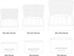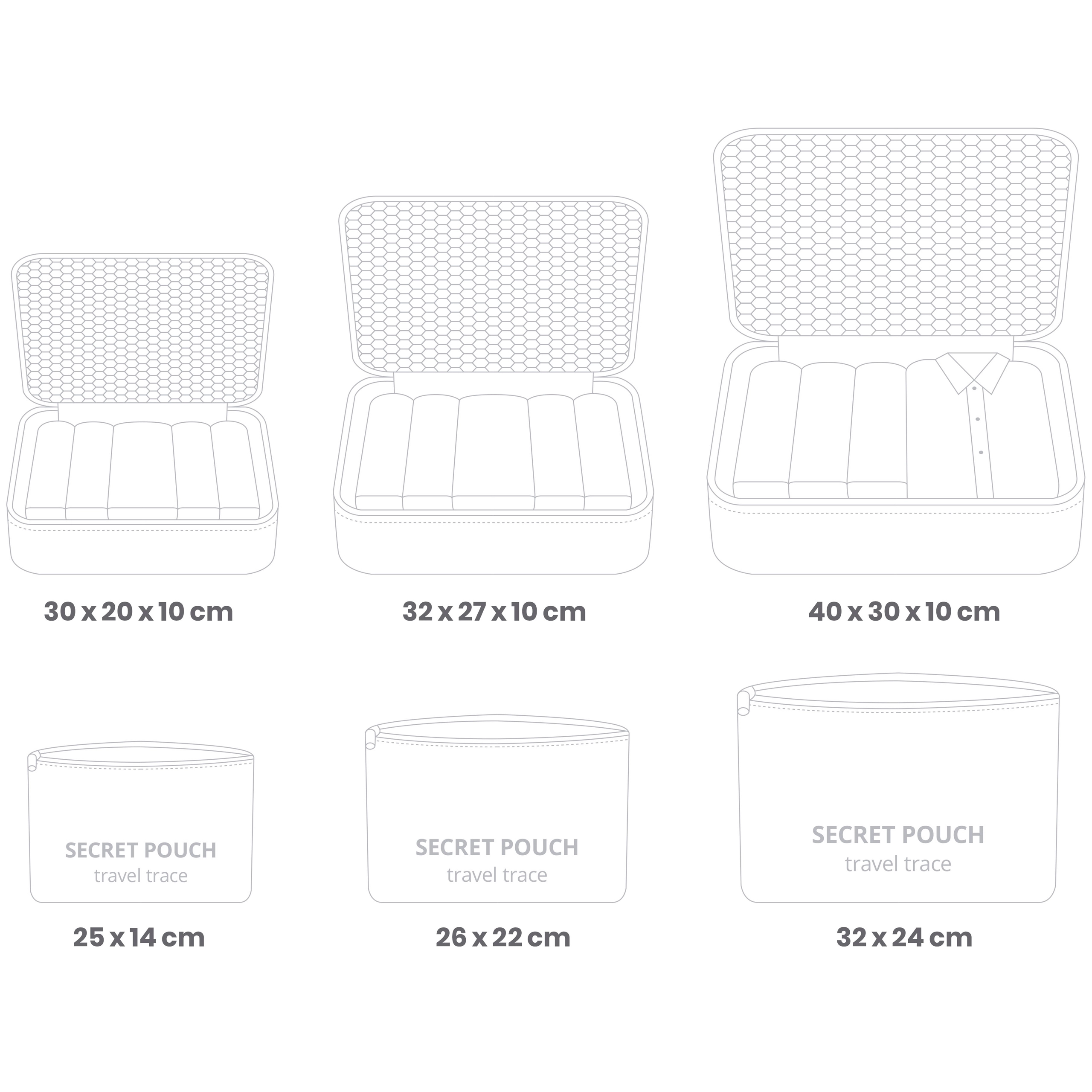A szett három tágas kockát tartalmaz légáteresztő hálóval, valamint három lapos tasakot „Laundry Pouch” felirattal a szennyes számára. A könnyű textilanyag és az erős cipzárak kényelmes pakolást, átláthatóságot és a holmik védelmét biztosítják utazás közben.