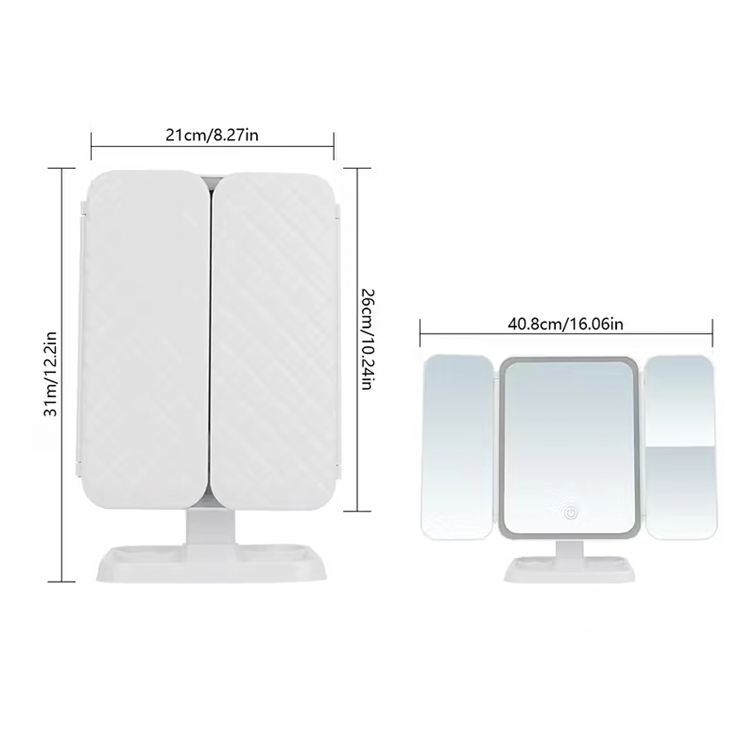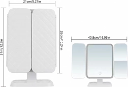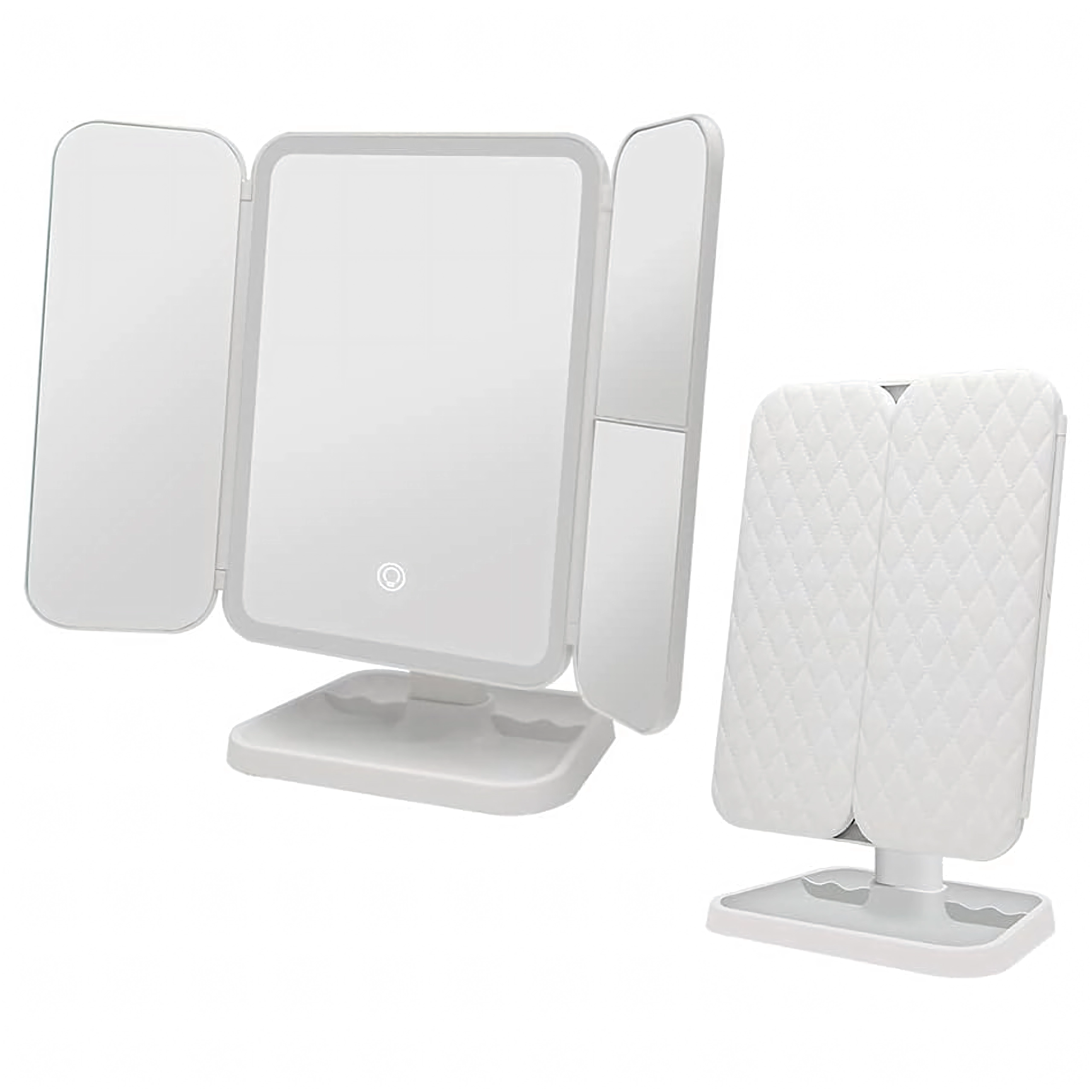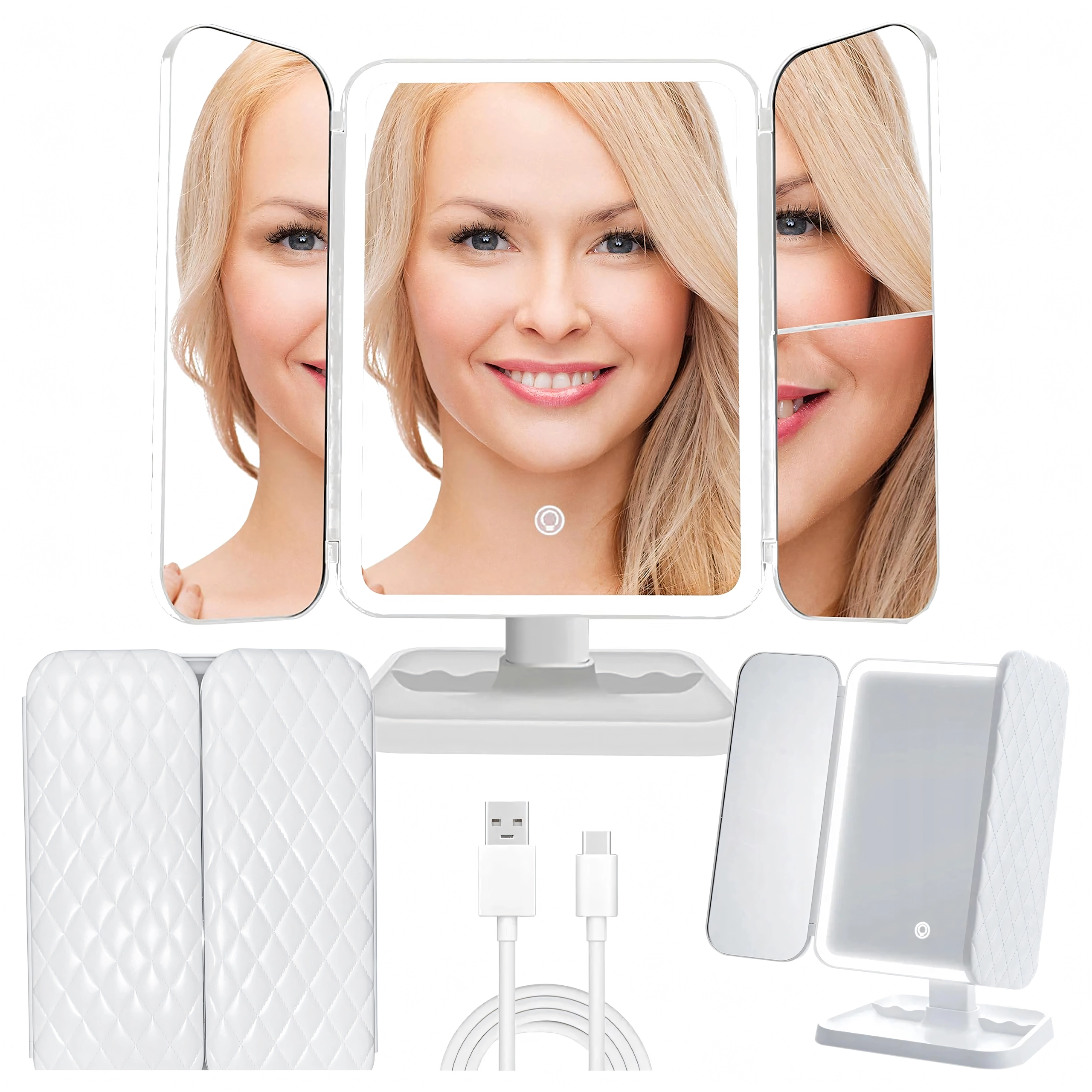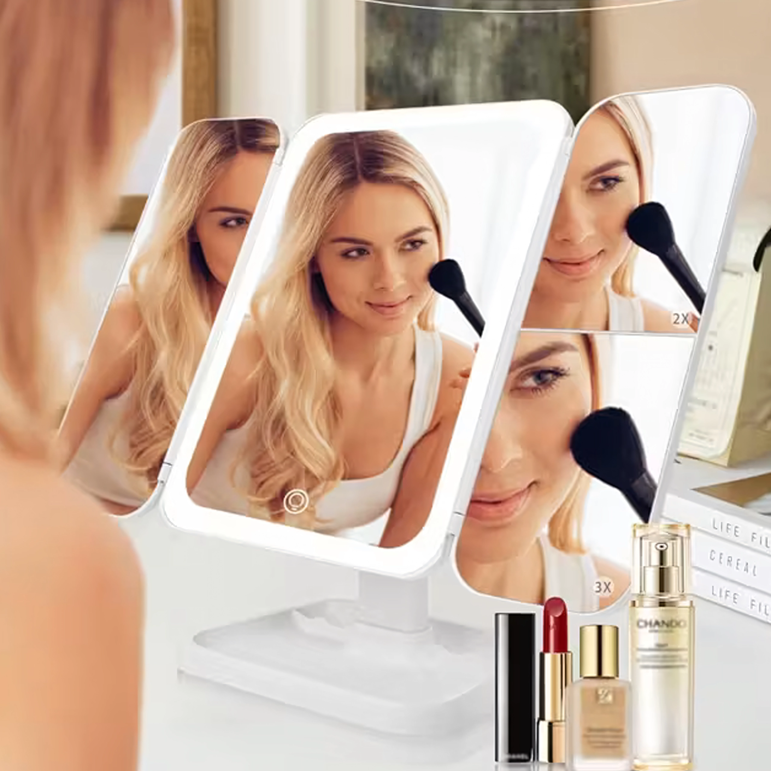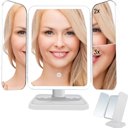 Fedezze fel a praktikus kozmetikai tükröt beépített LED világítással, amely tiszta és egyenletes képet ad sminkeléshez, szemöldökigazításhoz vagy borotválkozáshoz. A három panel különböző nagyításokkal, köztük a 3×-os közelítéssel, segít minden részletet tökéletes pontossággal kidolgozni.