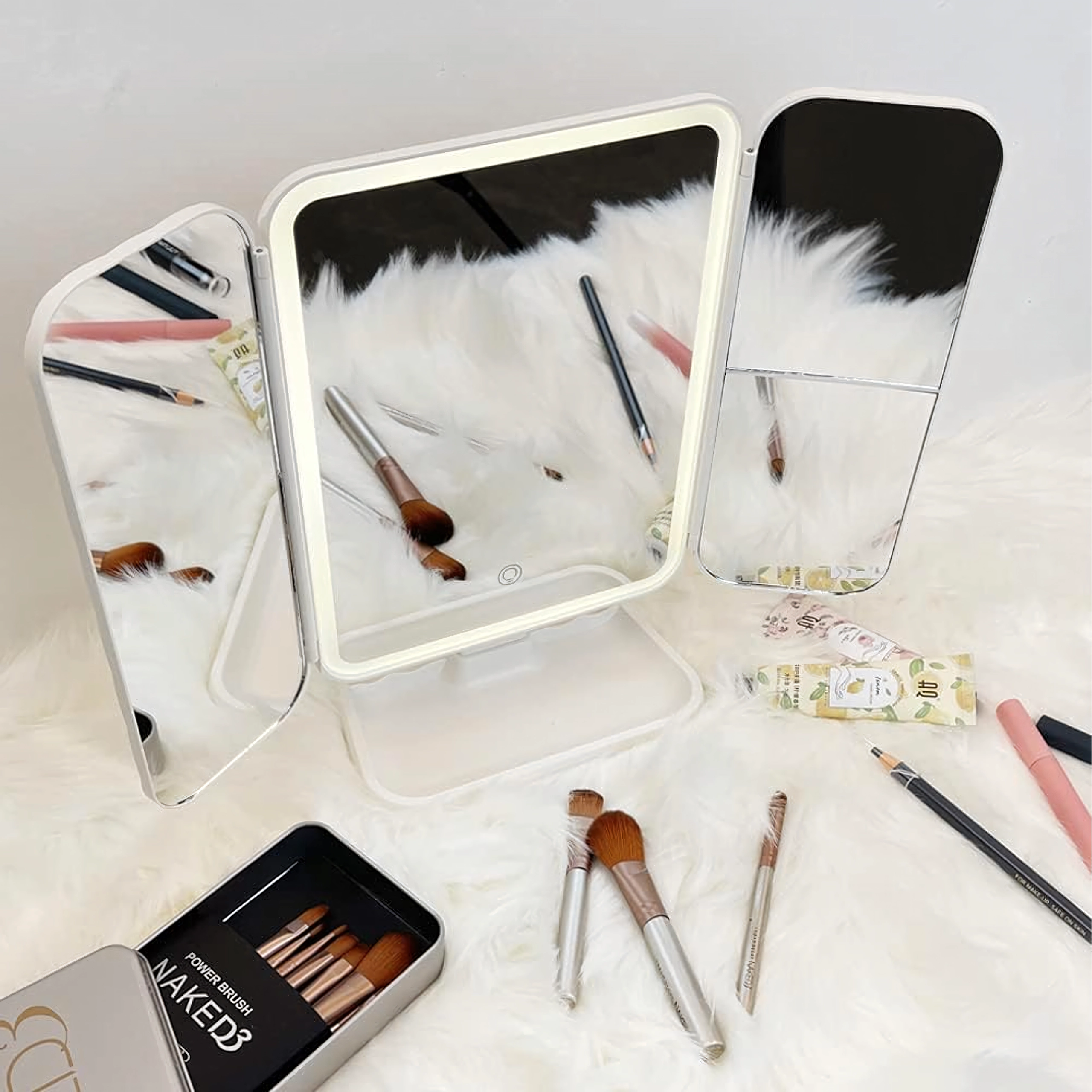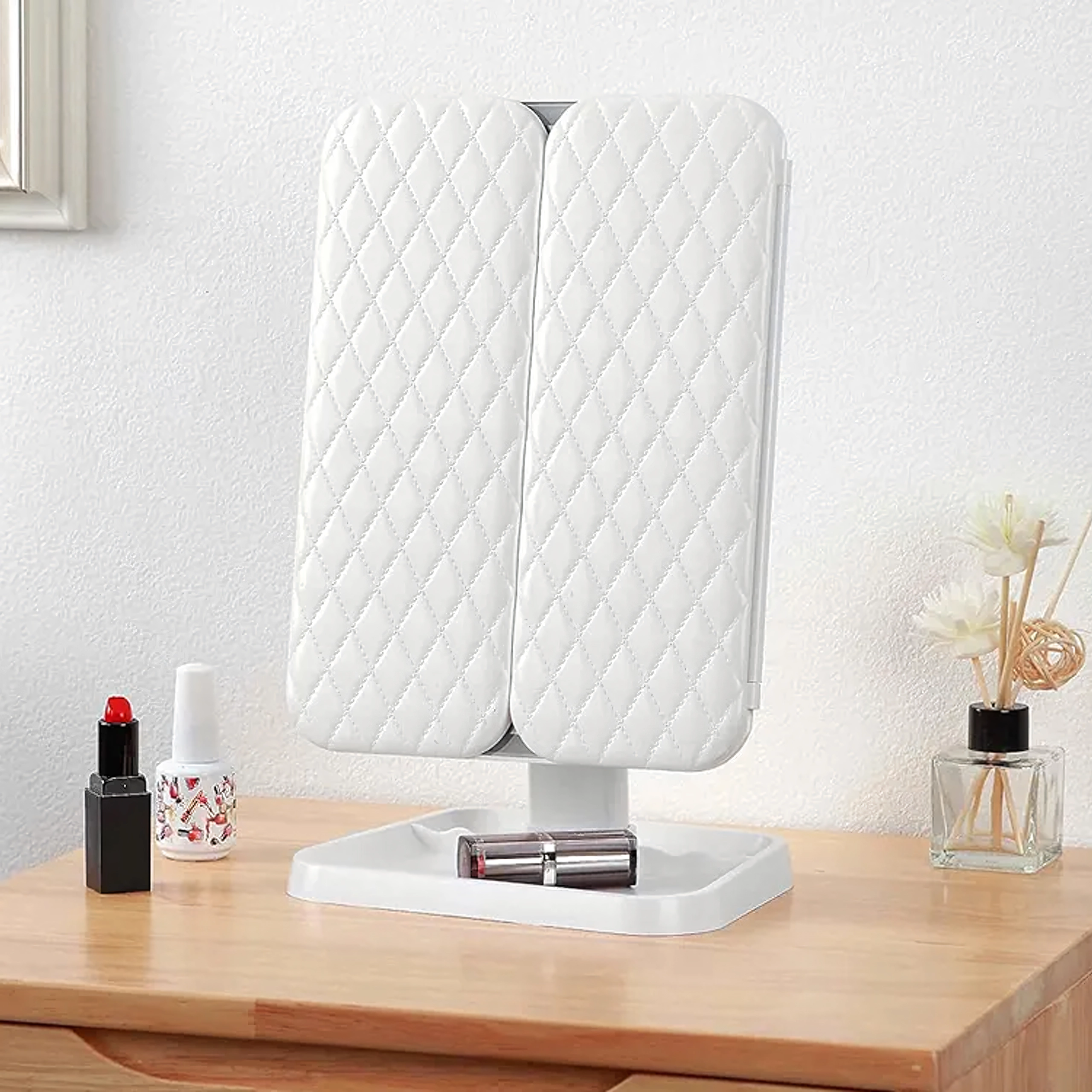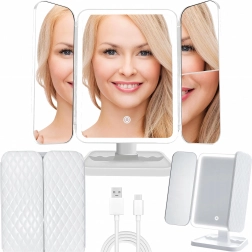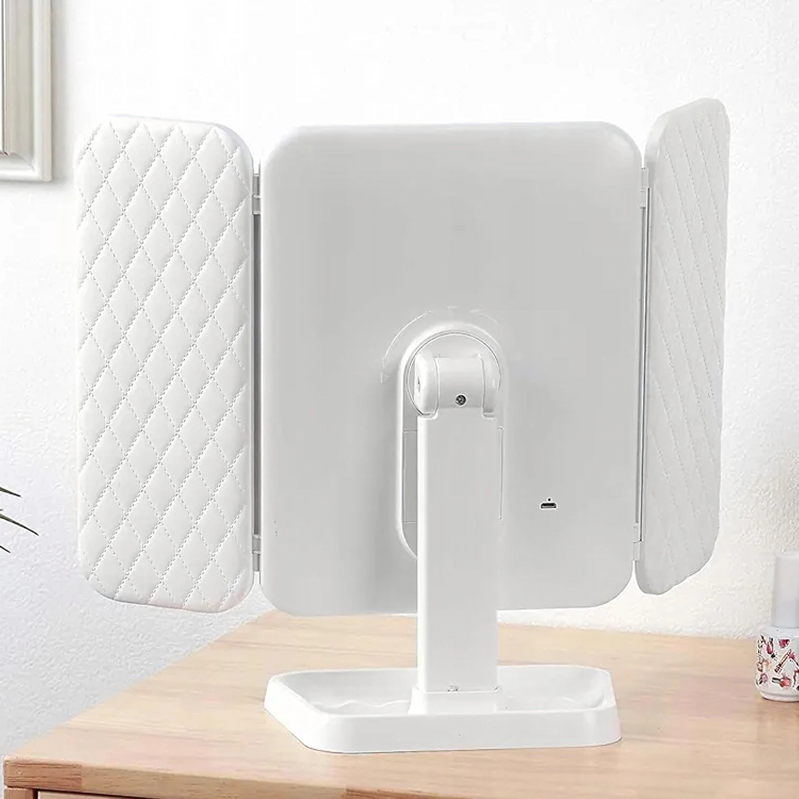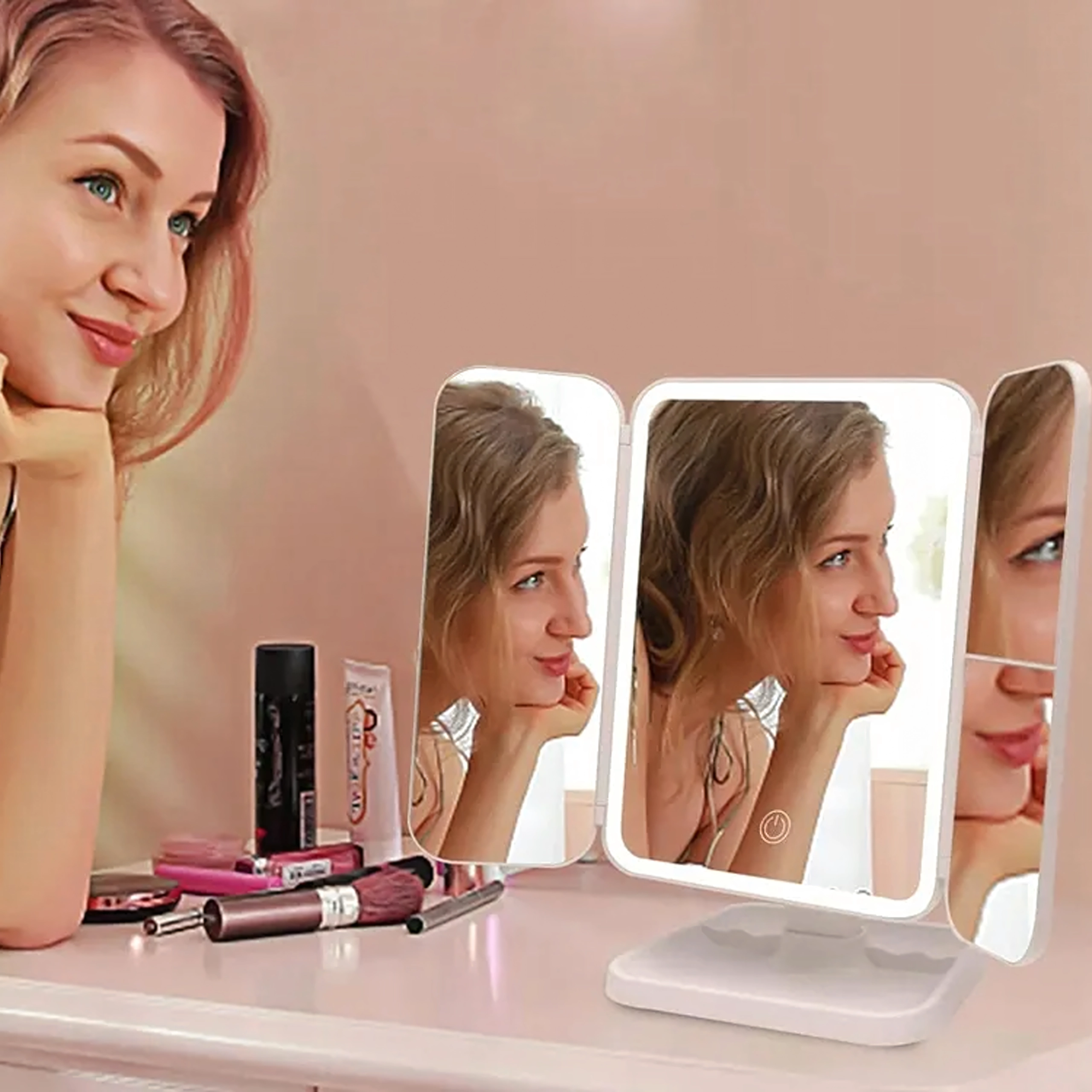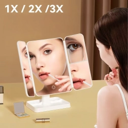 Fedezze fel a praktikus kozmetikai tükröt beépített LED világítással, amely tiszta és egyenletes képet ad sminkeléshez, szemöldökigazításhoz vagy borotválkozáshoz. A három panel különböző nagyításokkal, köztük a 3×-os közelítéssel, segít minden részletet tökéletes pontossággal kidolgozni.