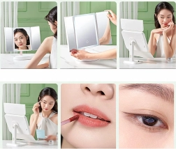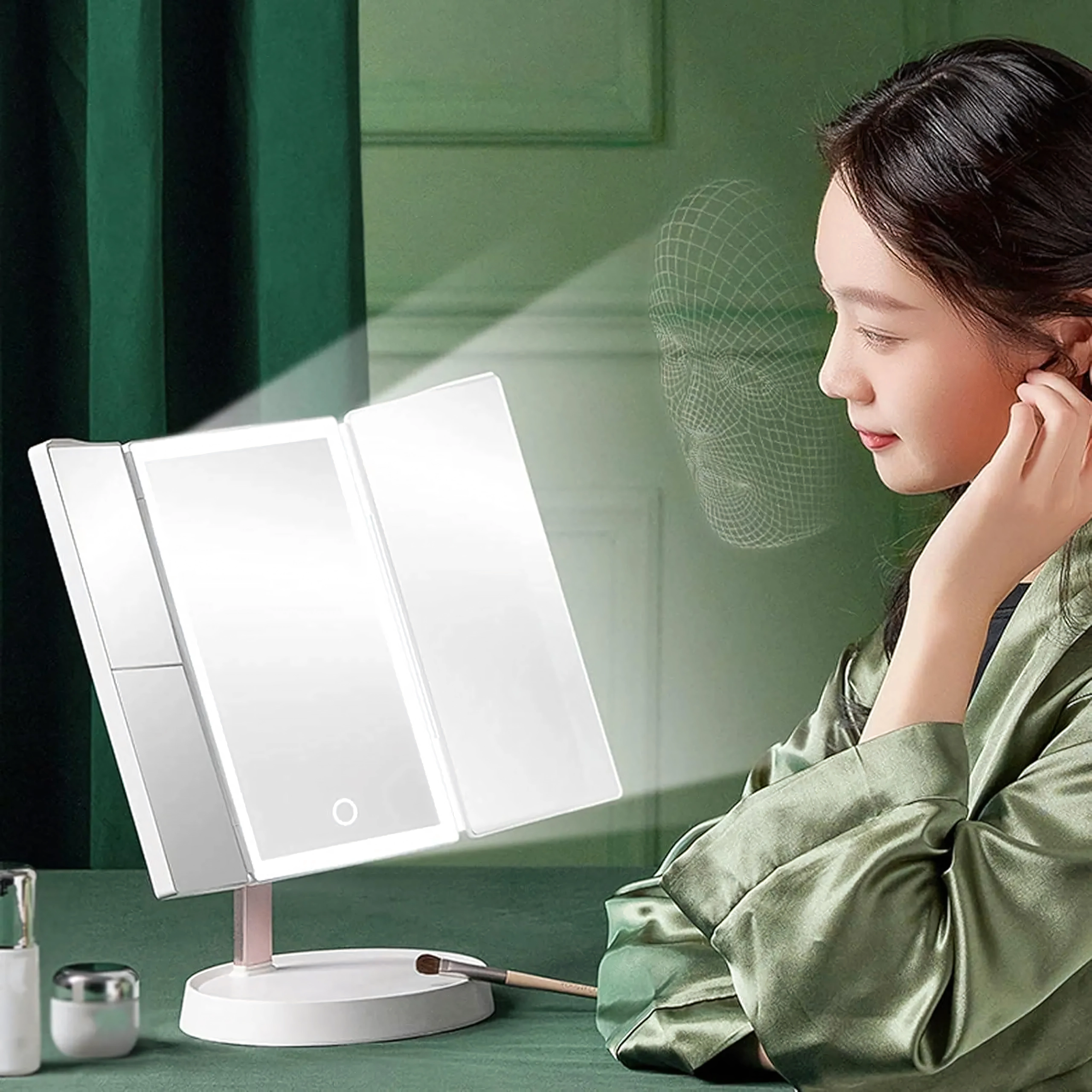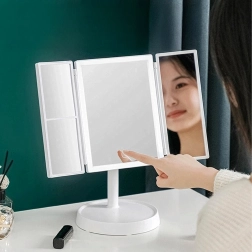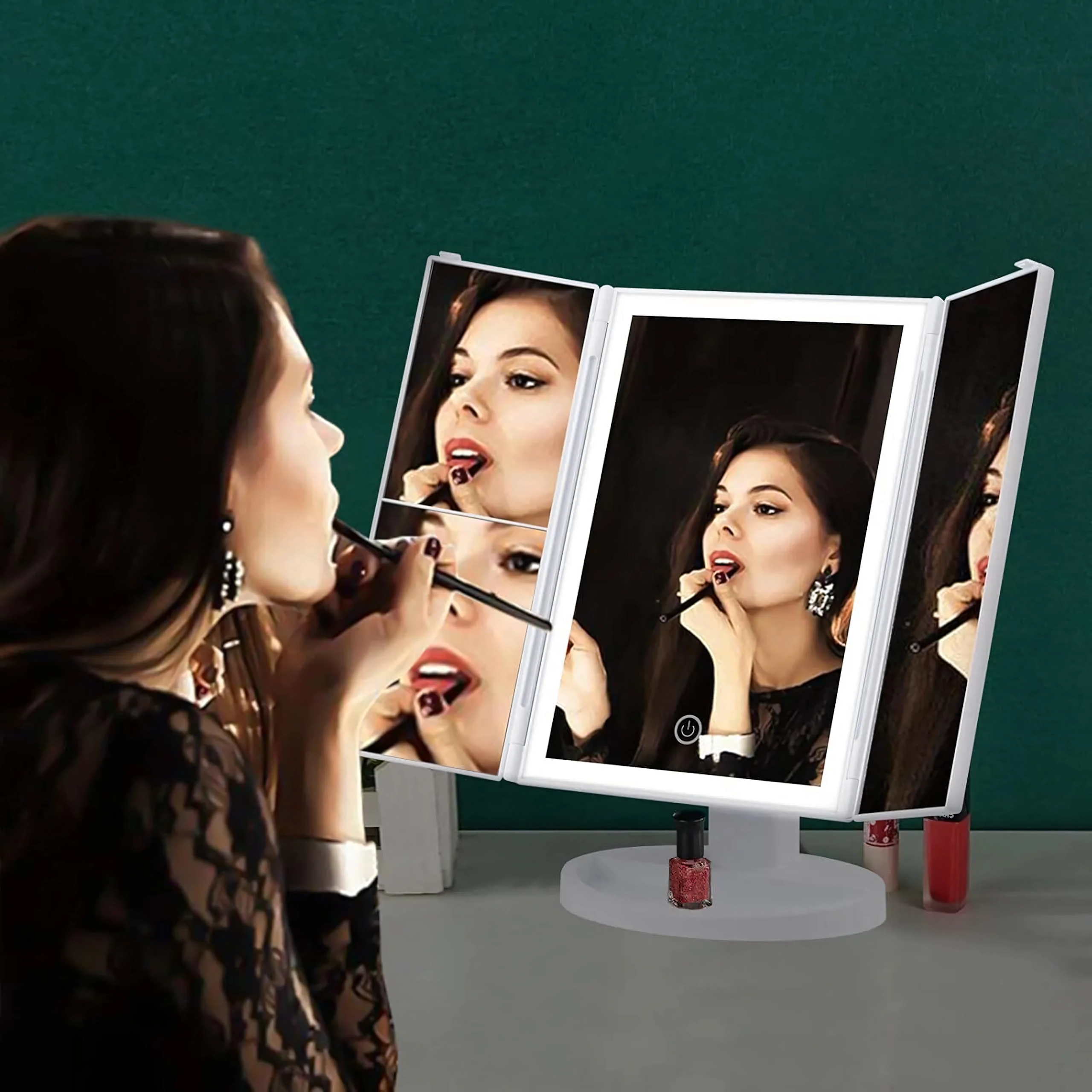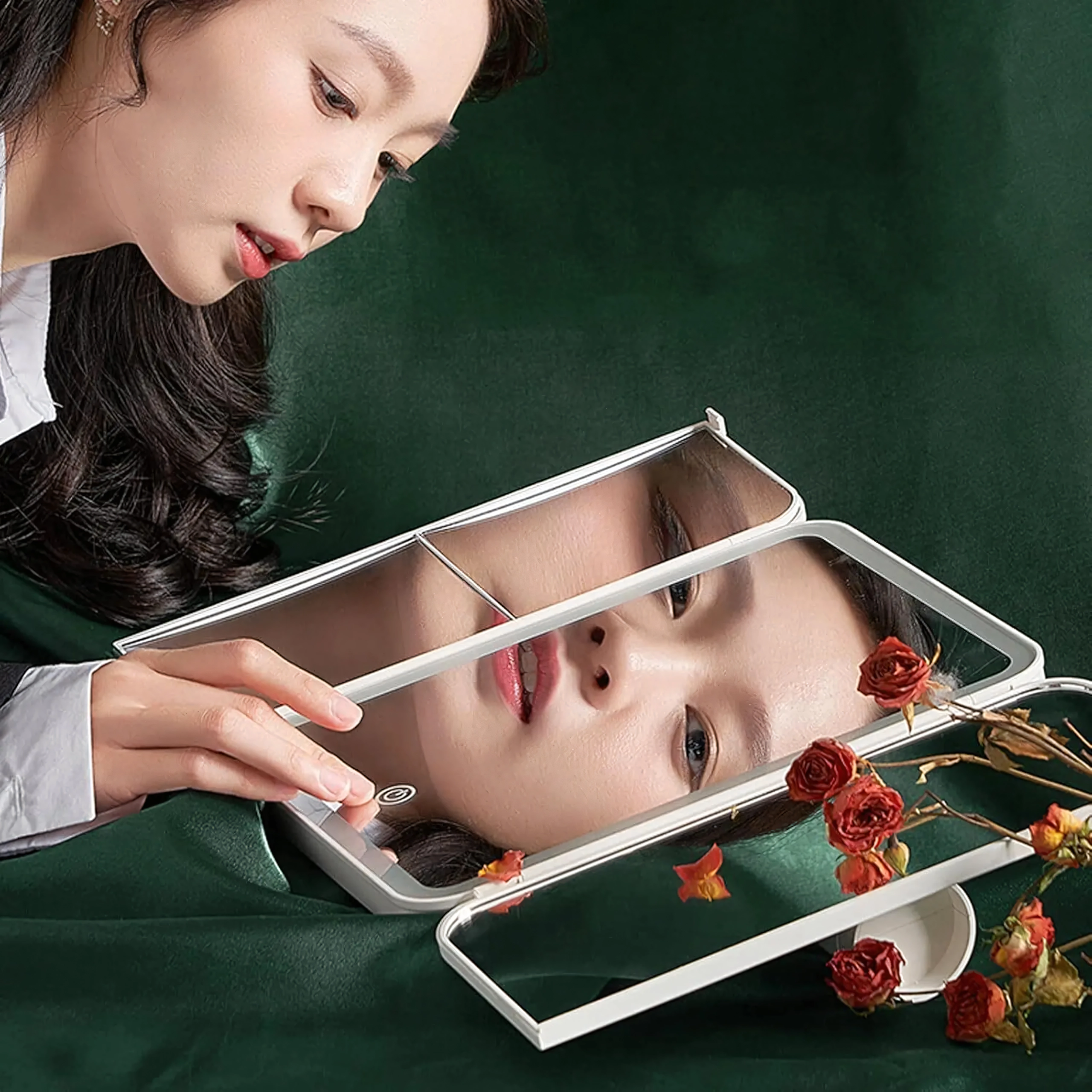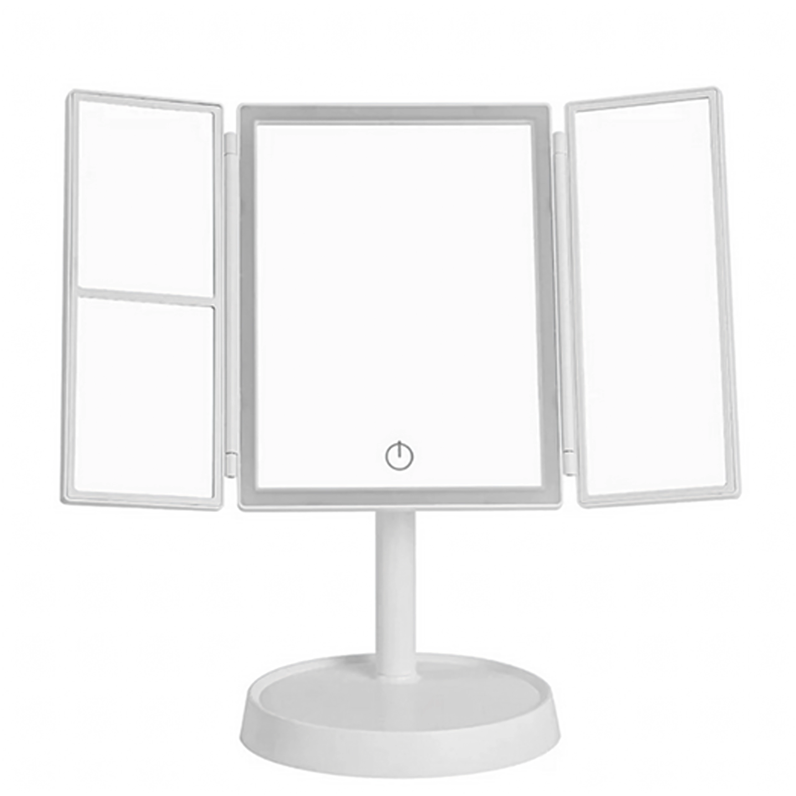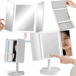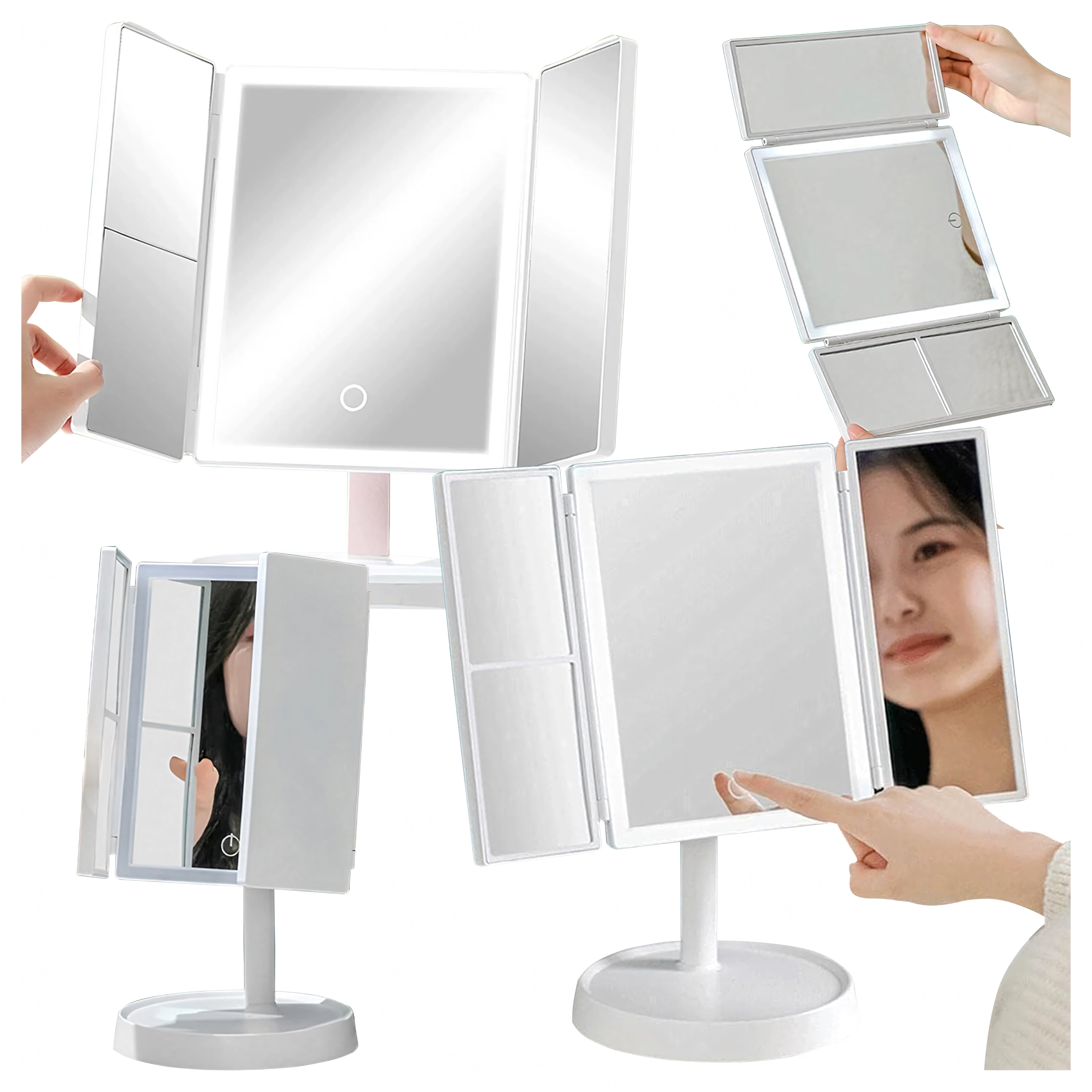 Fedezze fel a praktikus és stílusos tükröt, amellyel a nap bármely szakában hibátlan sminket készíthet. A középső panel érintéses vezérlése és a beépített LED háttérvilágítás tiszta, egyenletes fényt ad, míg az oldalsó szárnyak kiszélesítik a látómezőt és megkönnyítik a precíz igazításokat.
