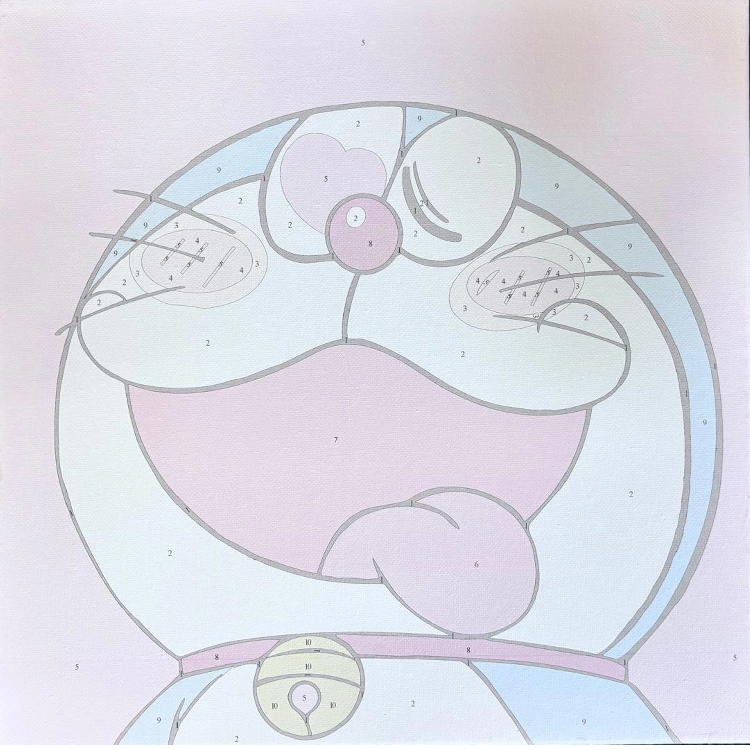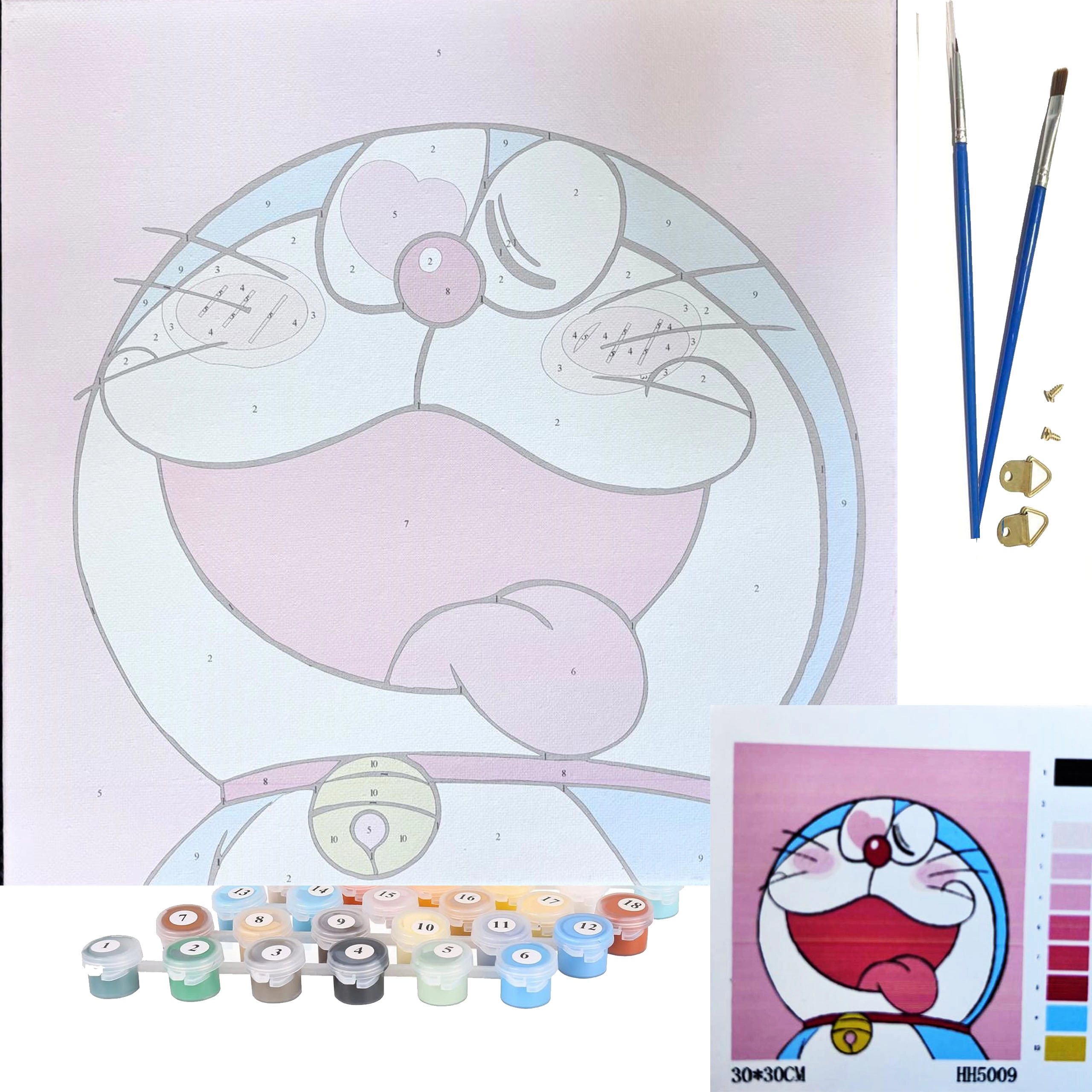 - Előrenyomtatott számokkal ellátott vászon, akrilfestékek, ecsetek, akasztóelemek