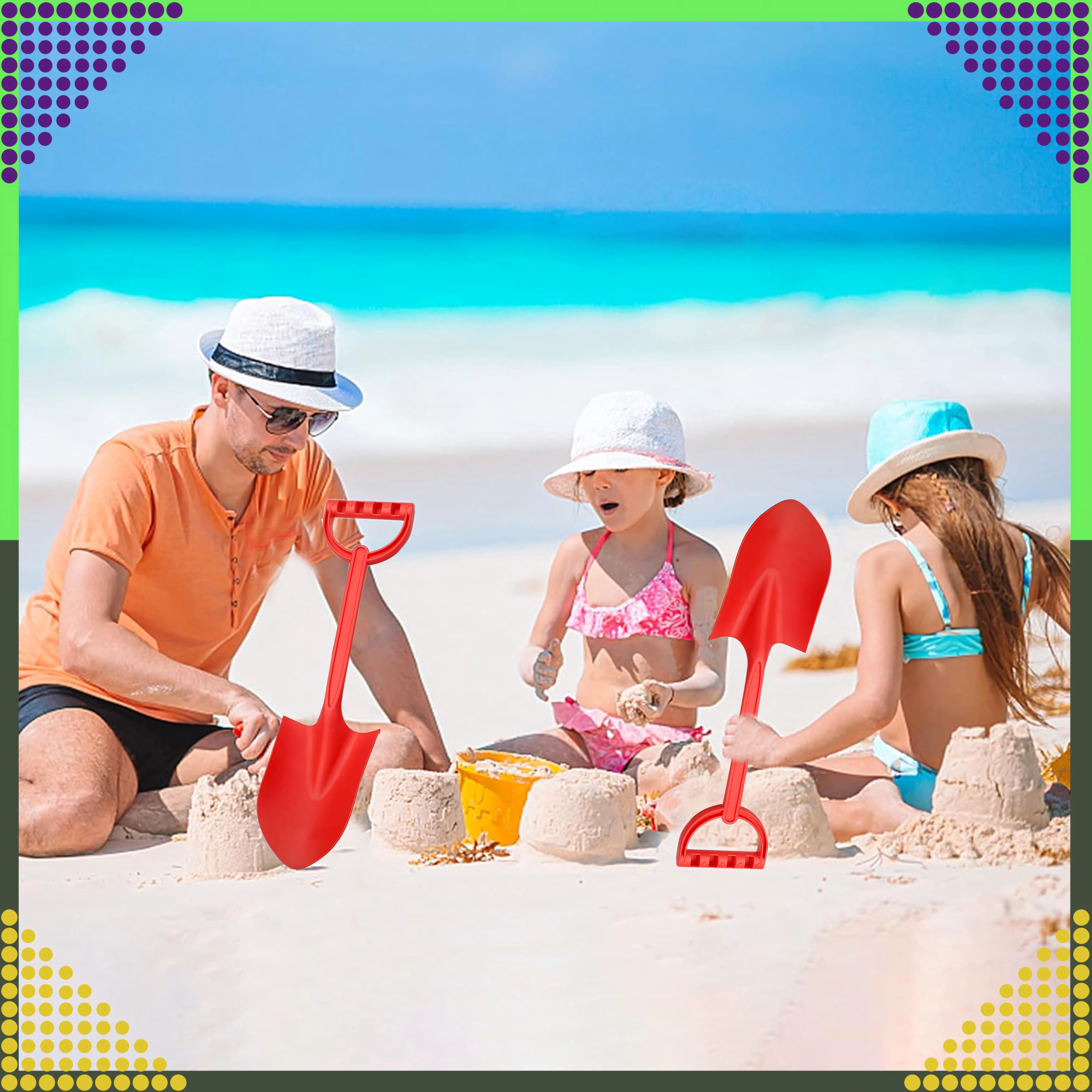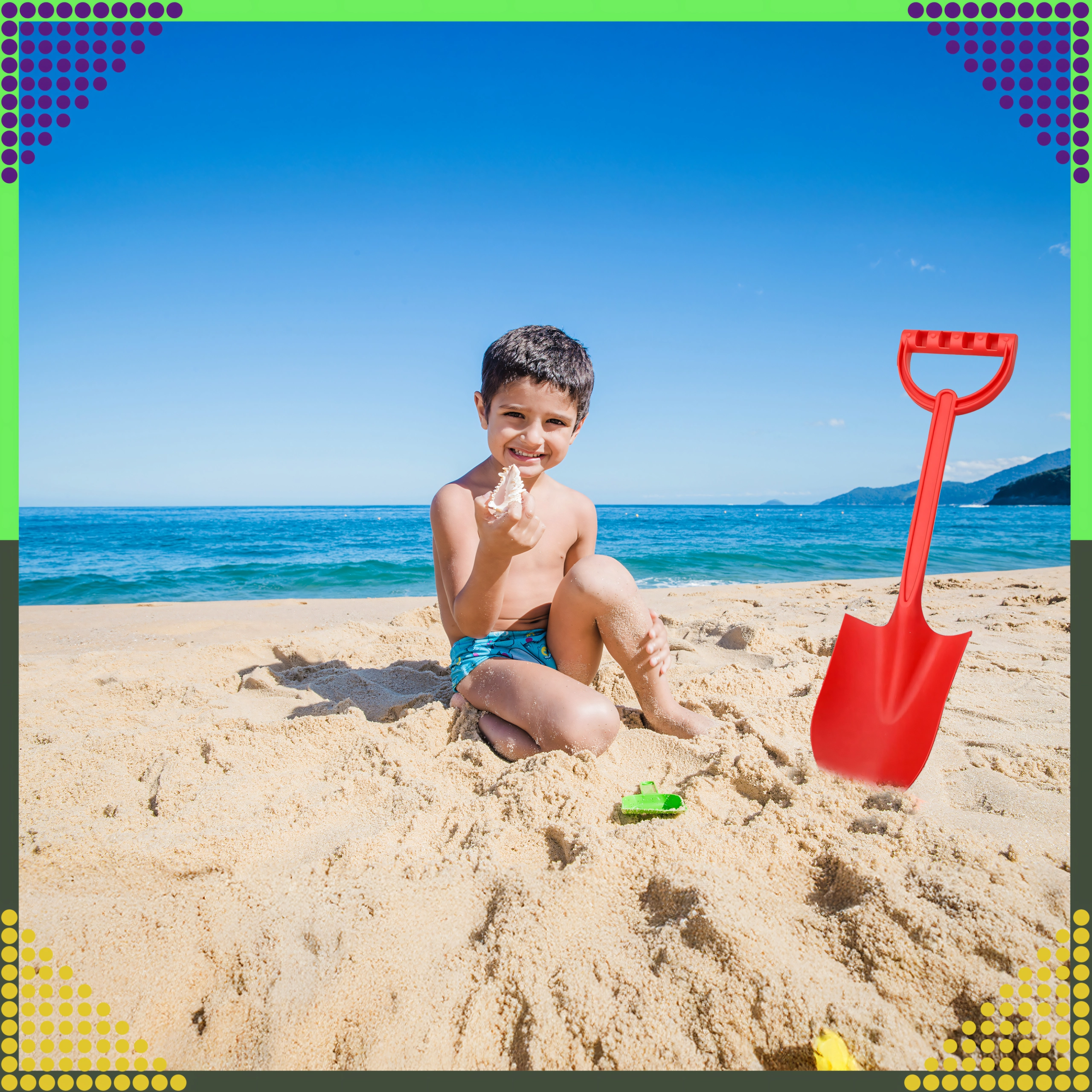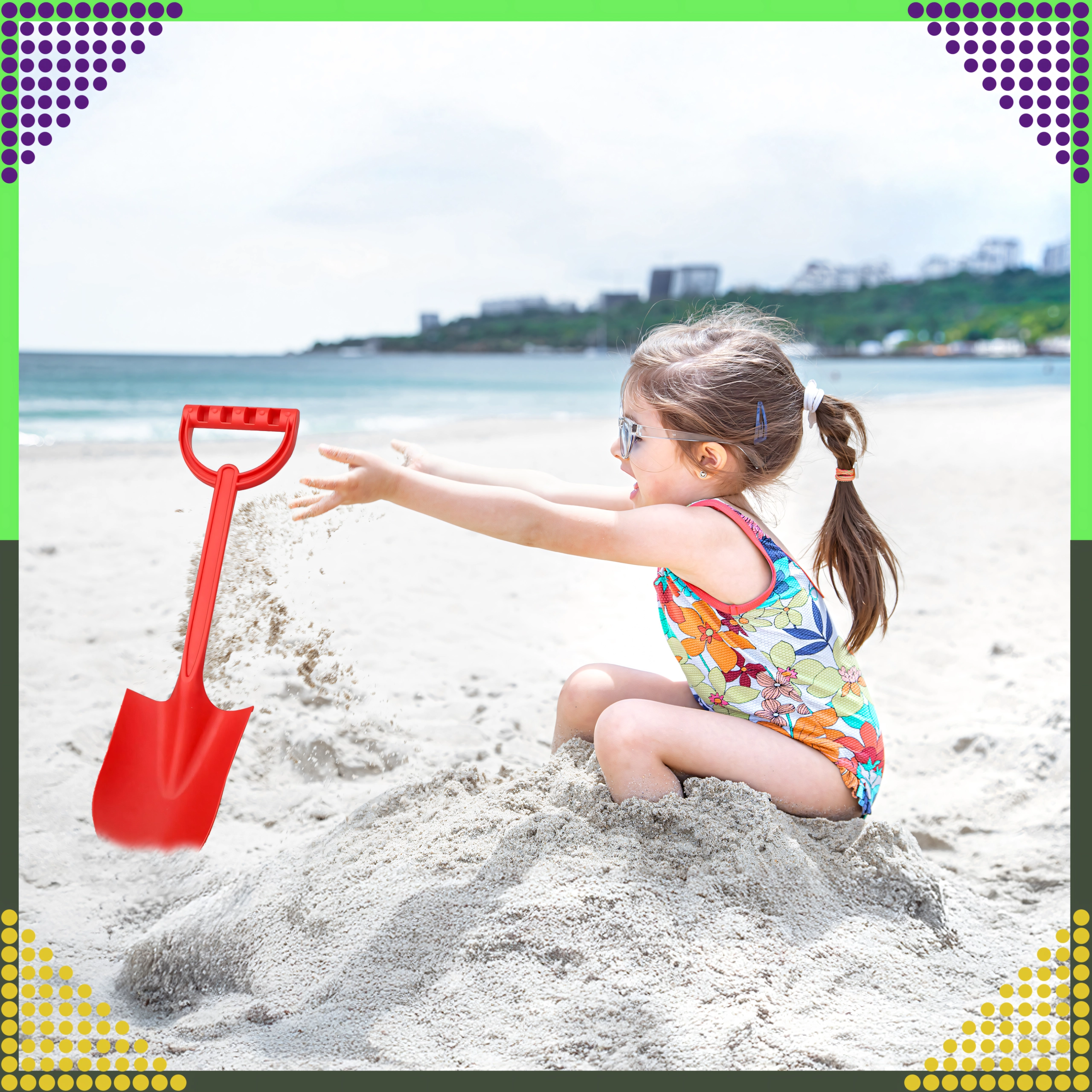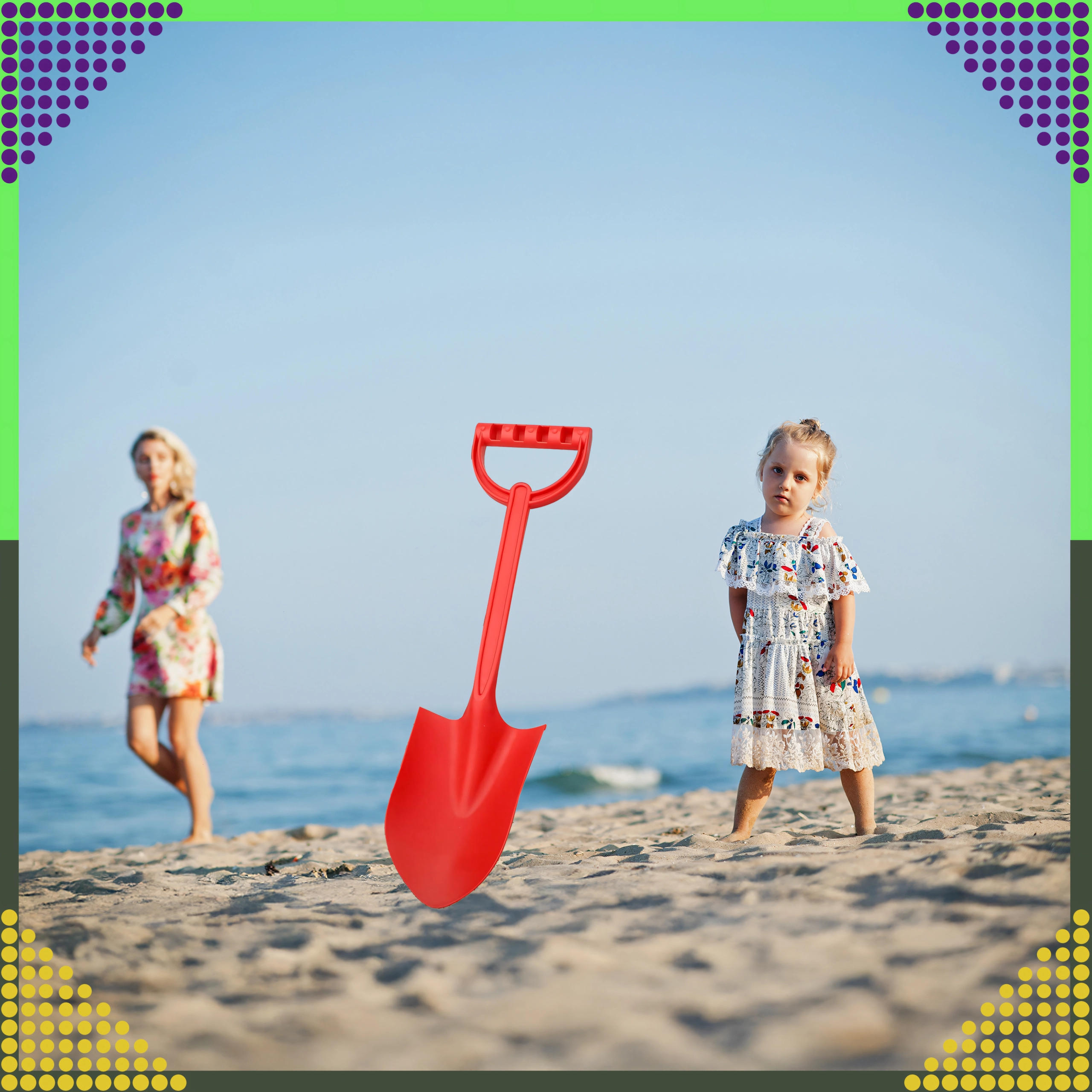 A 64 cm hosszú, nagy méretű gyermek homoklapát ideális a strandra és a homokozóba. Erős szárral és kényelmes fogással rendelkezik, minőségi, nem mérgező és biztonságos műanyagból készült, amely ellenáll az időjárási hatásoknak. Lekerekített formák éles élek nélkül a biztonságos és kényelmes használatért, még a legkisebbek számára is.