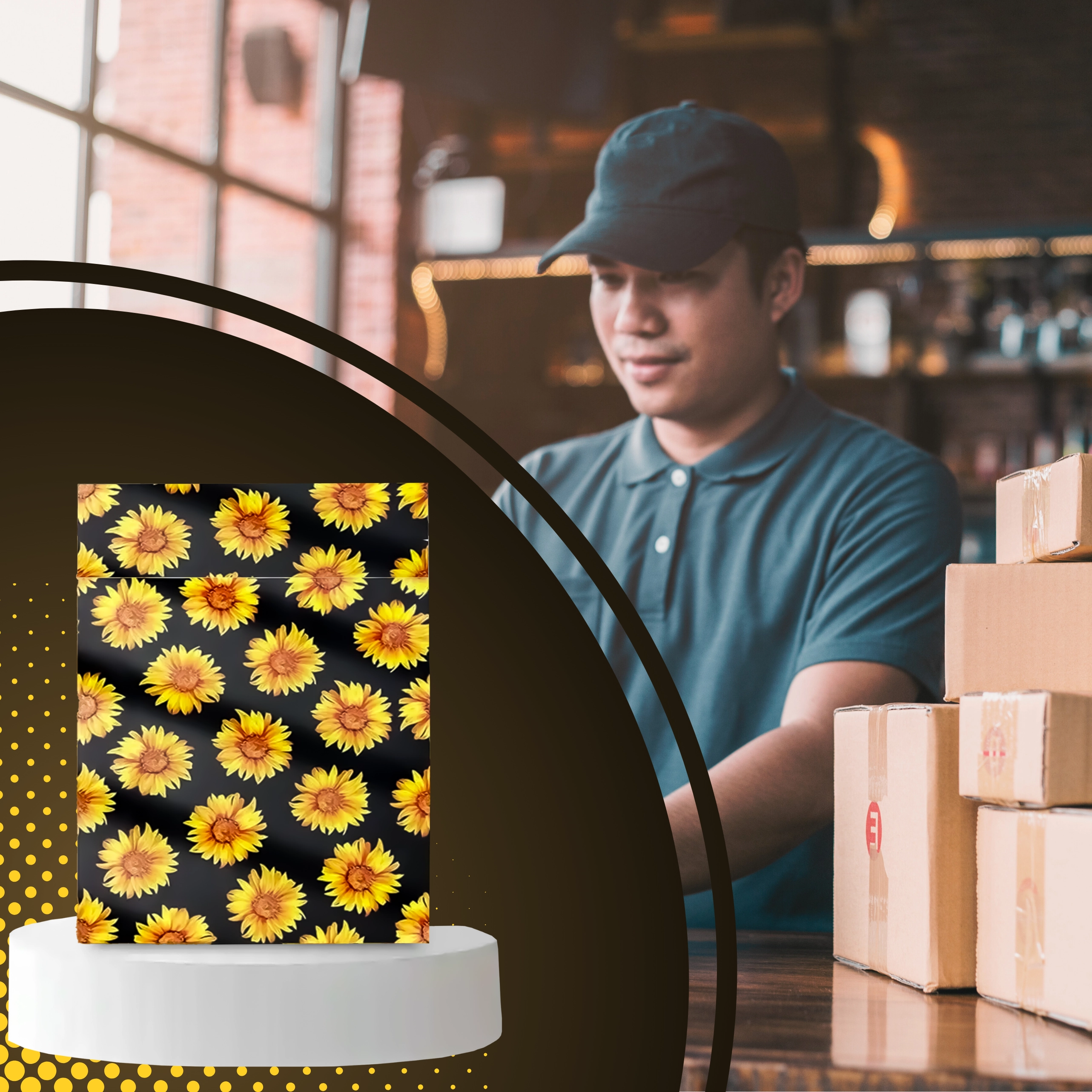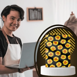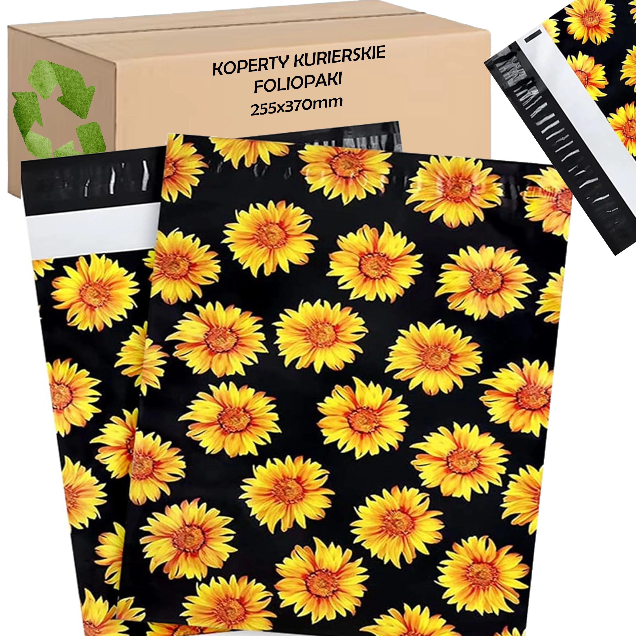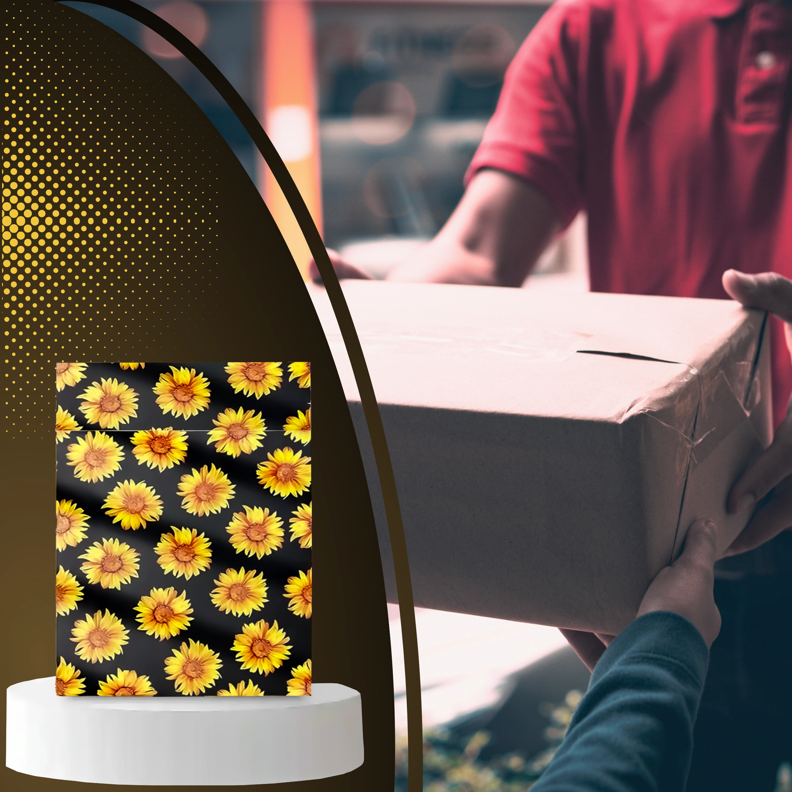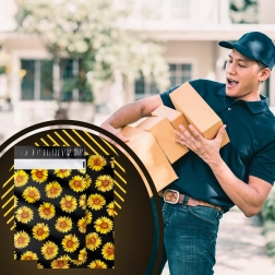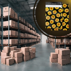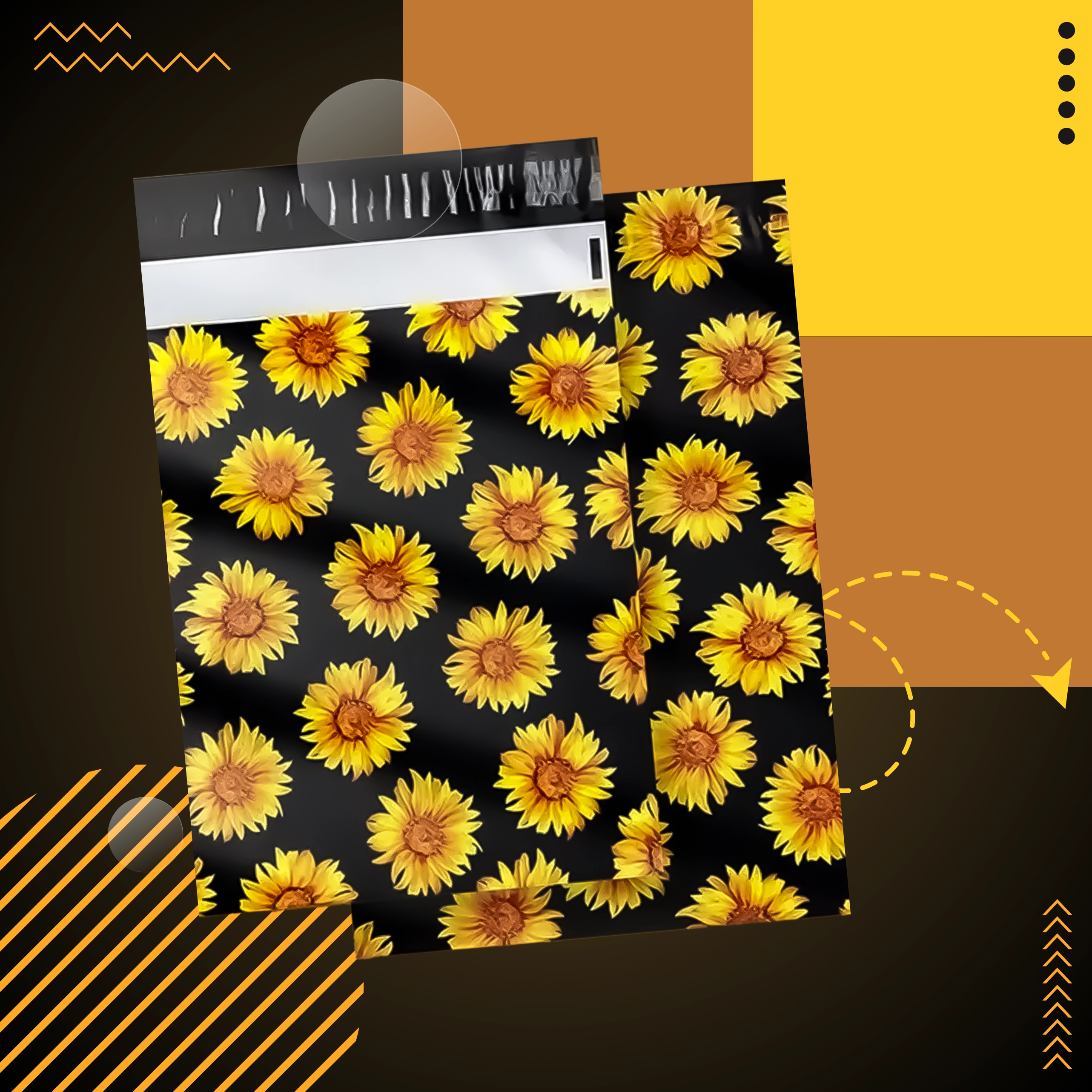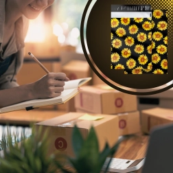 A stílusos napraforgó minta fekete háttéren javítja a vásárlói élményt, és minden küldeményt egy kis ajándékká varázsol.