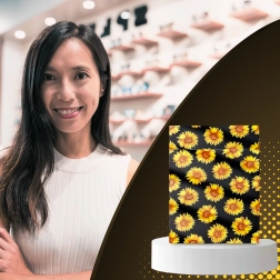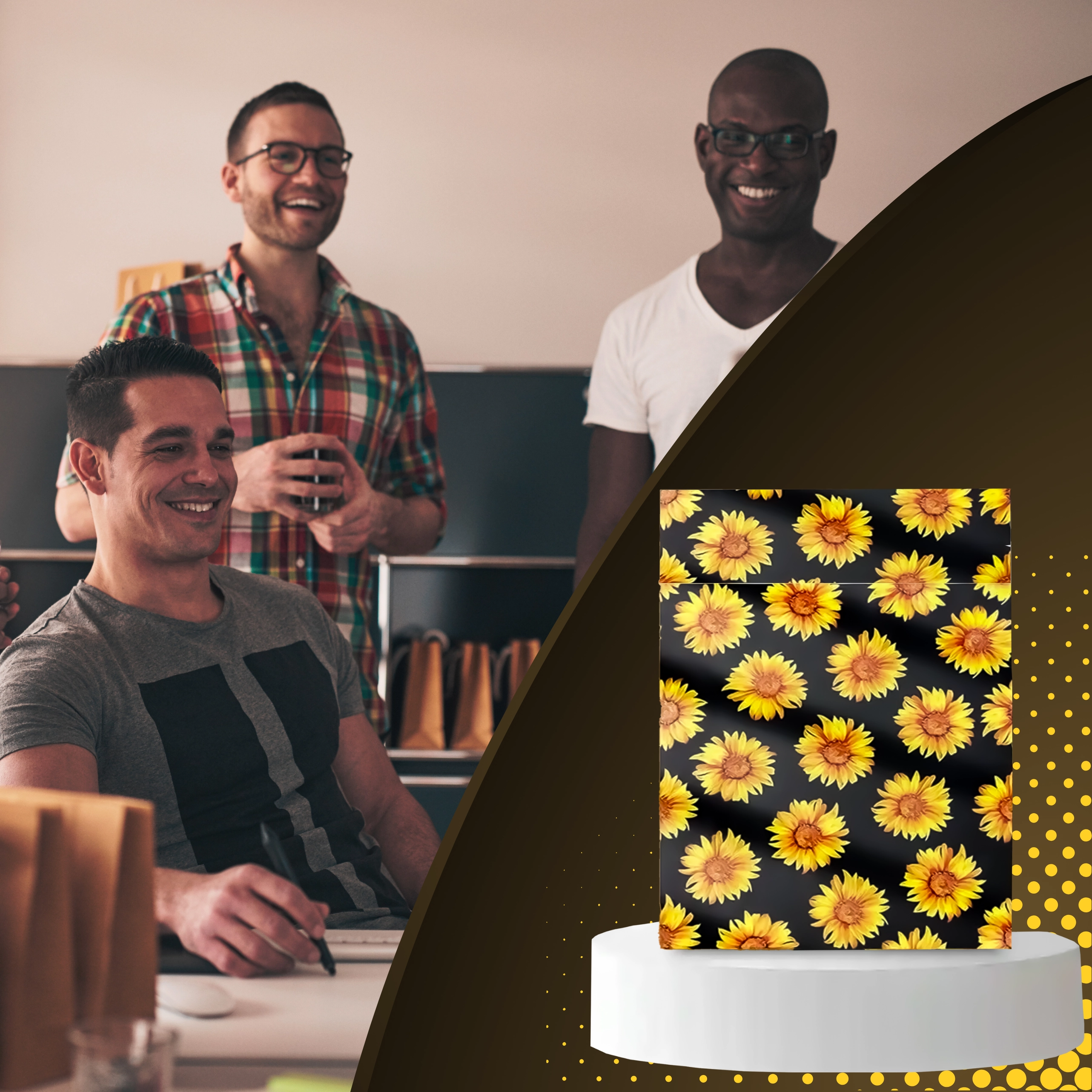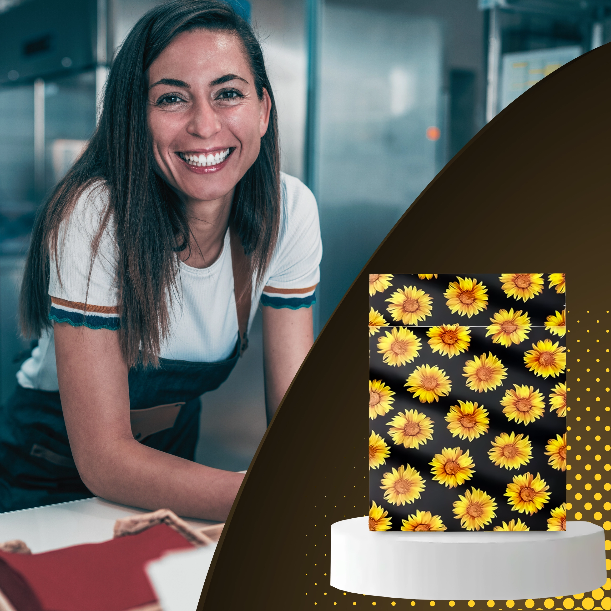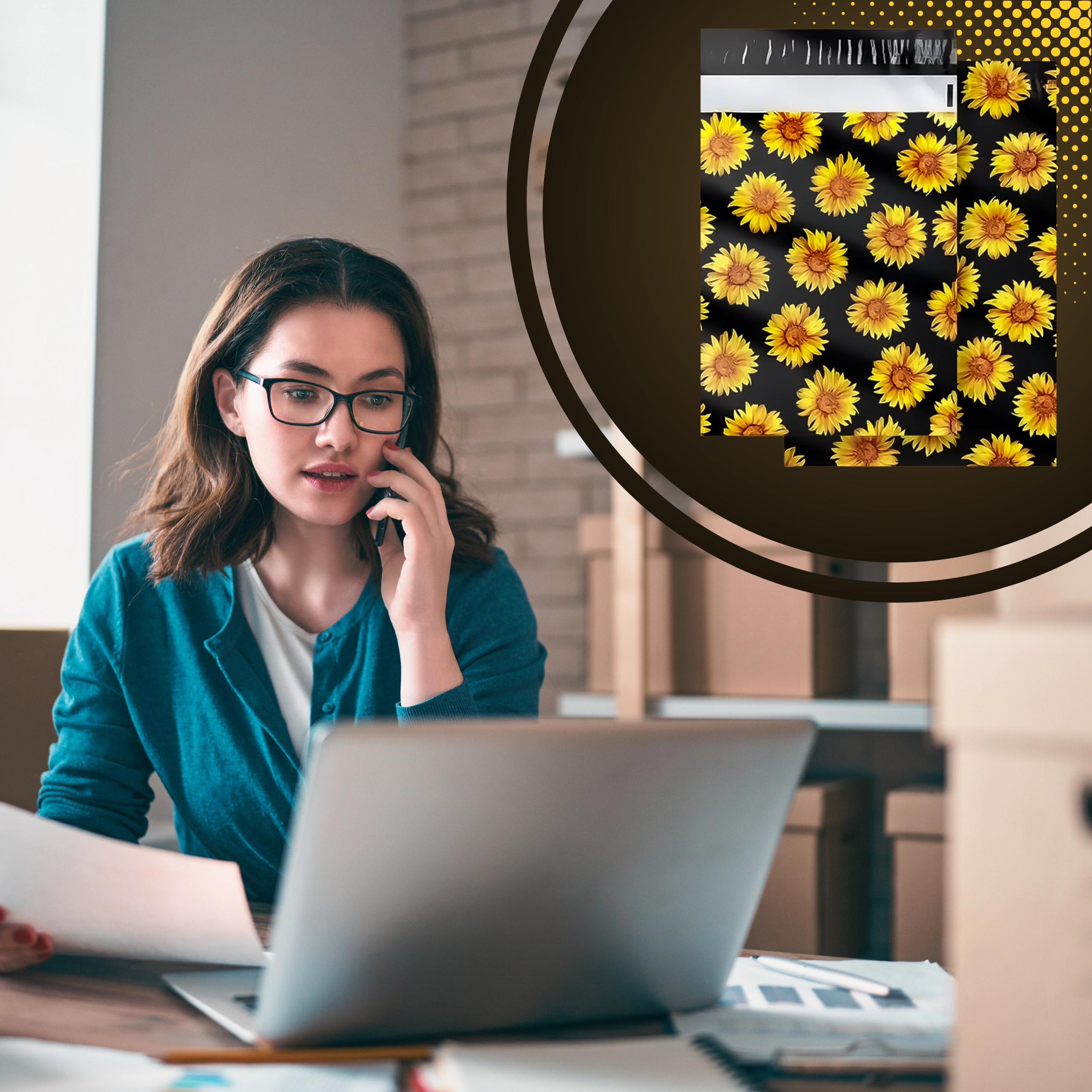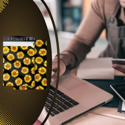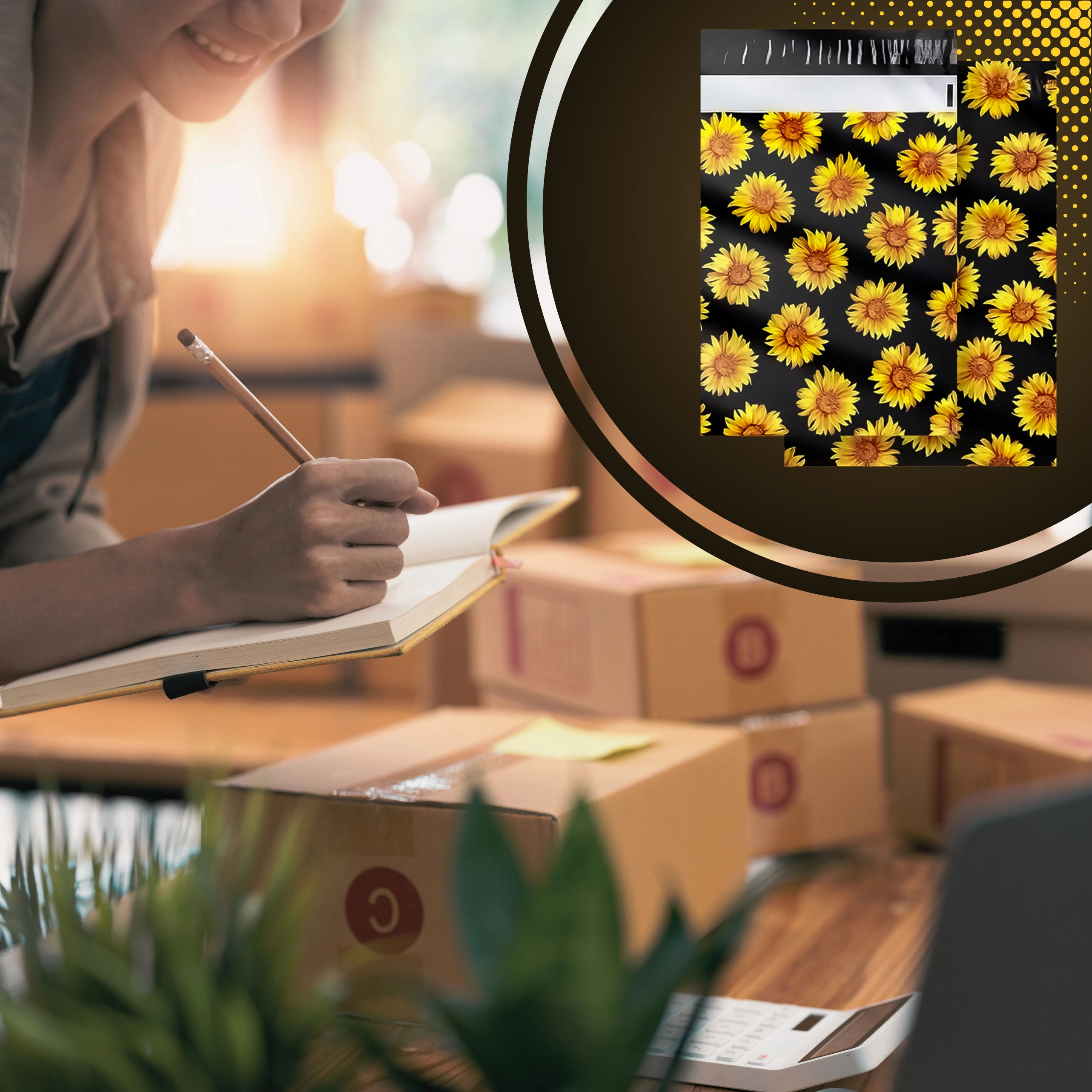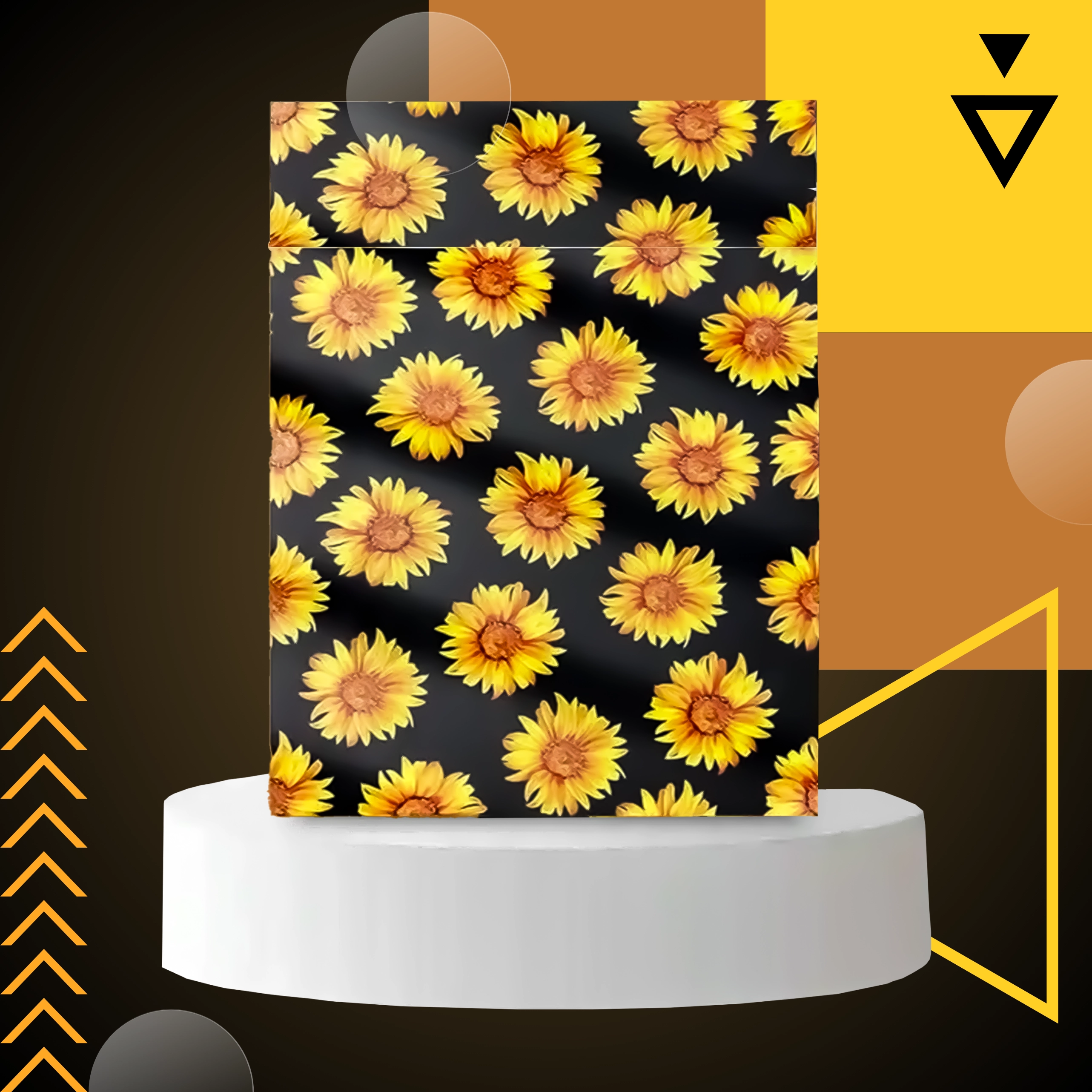 A stílusos napraforgó minta fekete háttéren javítja a vásárlói élményt, és minden küldeményt egy kis ajándékká varázsol.
