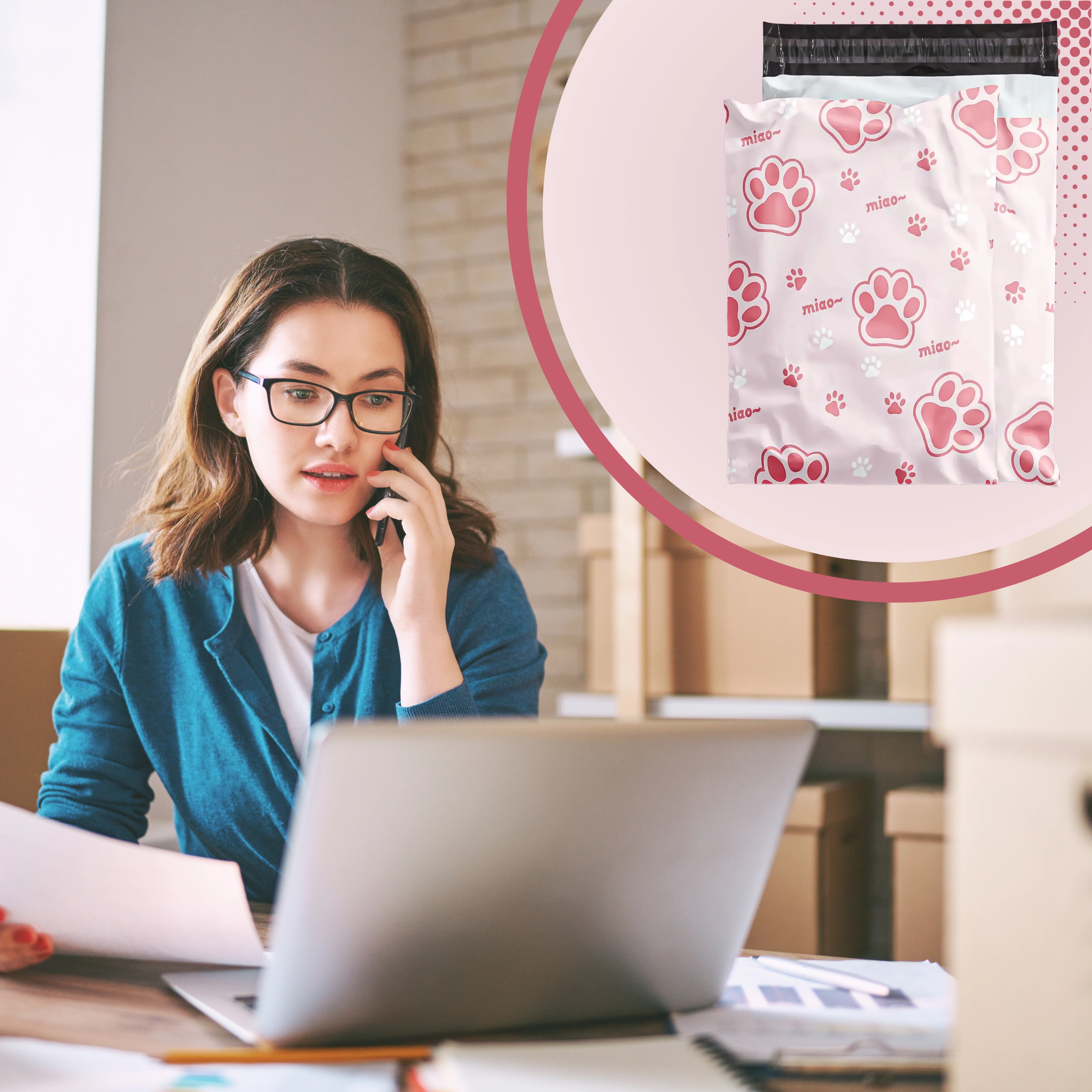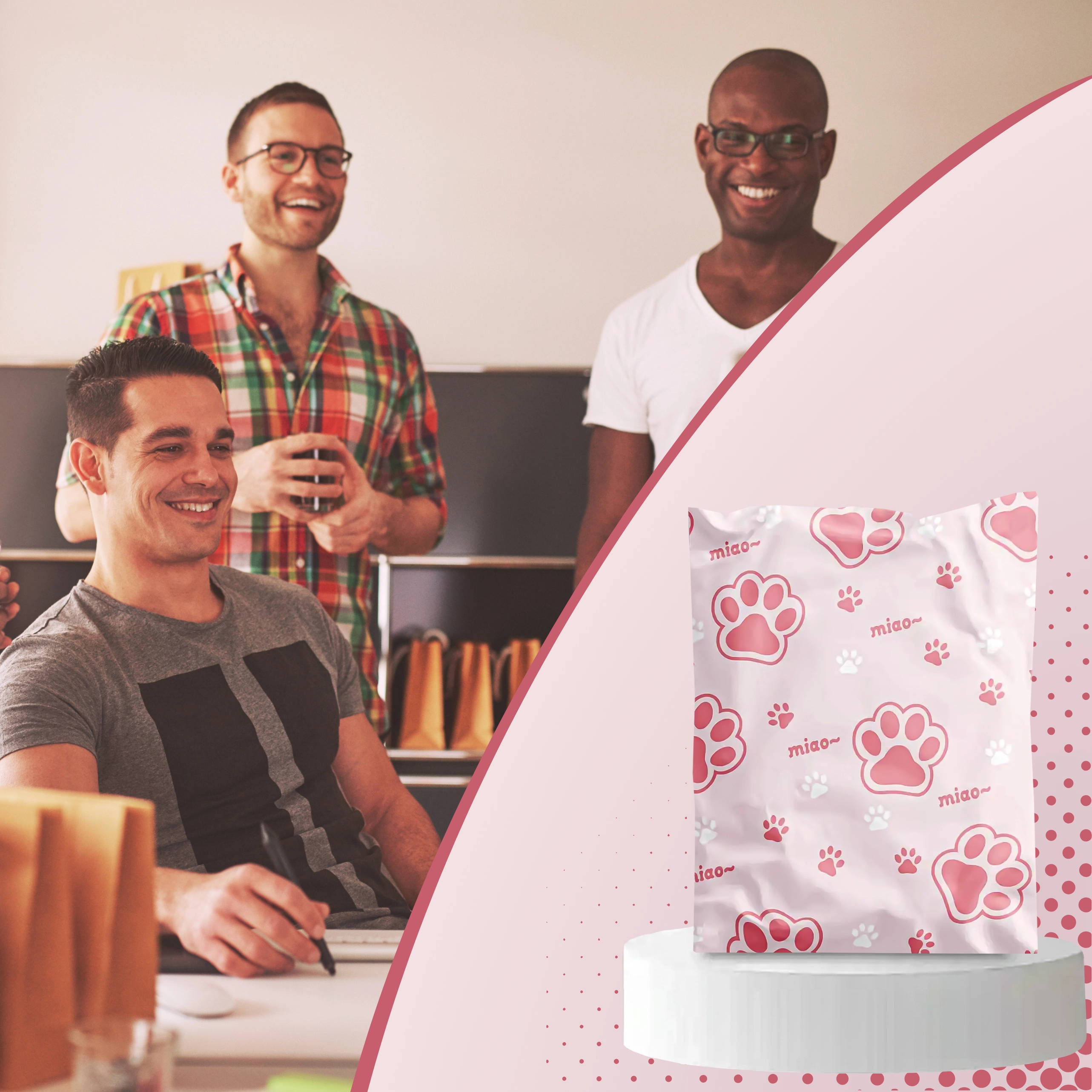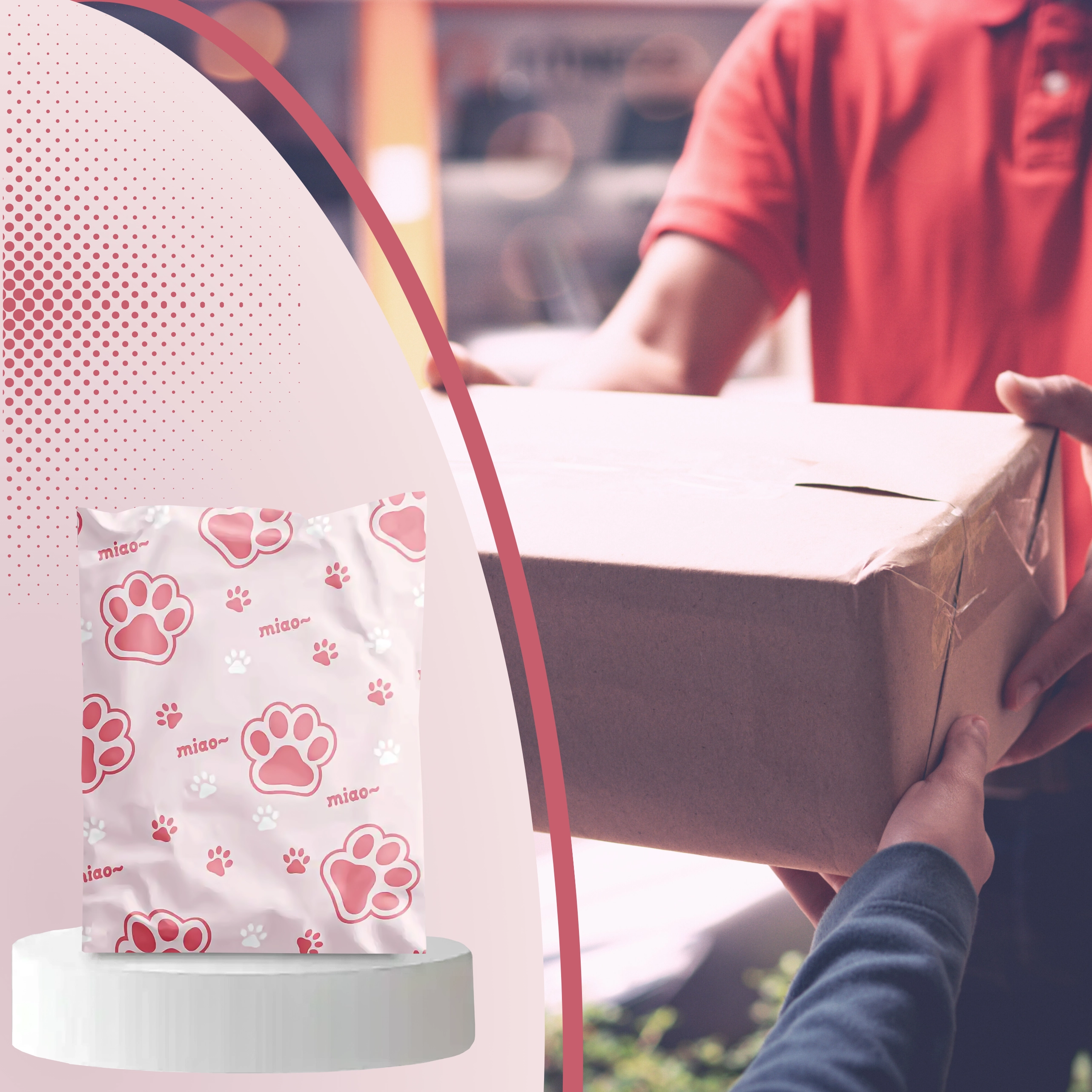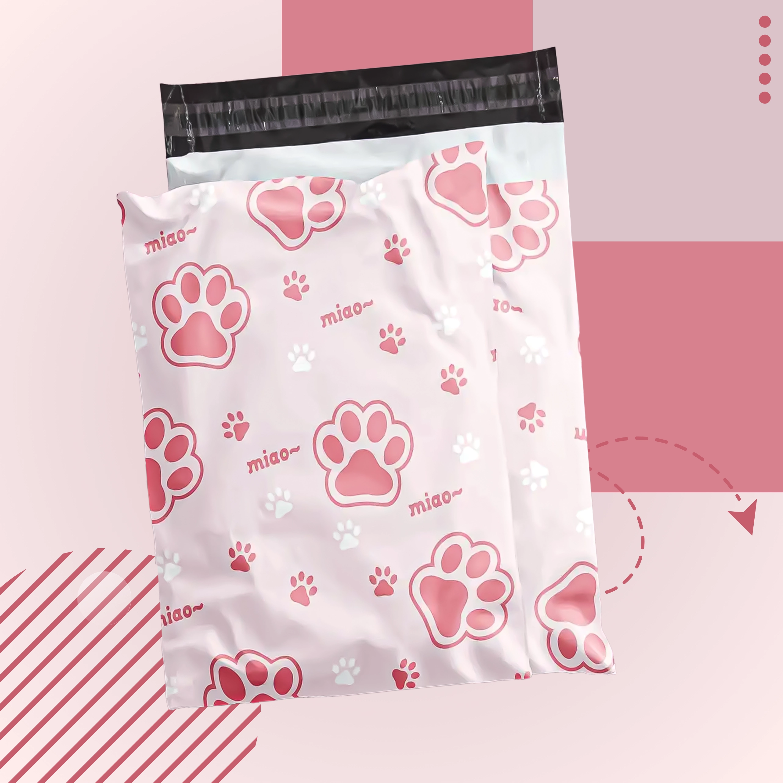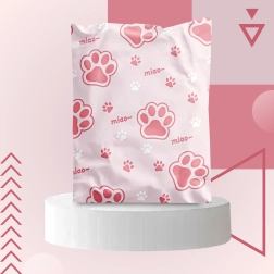 Rózsaszín-fehér nyomat „miao” felirattal, amely egyediséget ad a küldeményeknek és kiemeli azokat a szokványos csomagok közül.