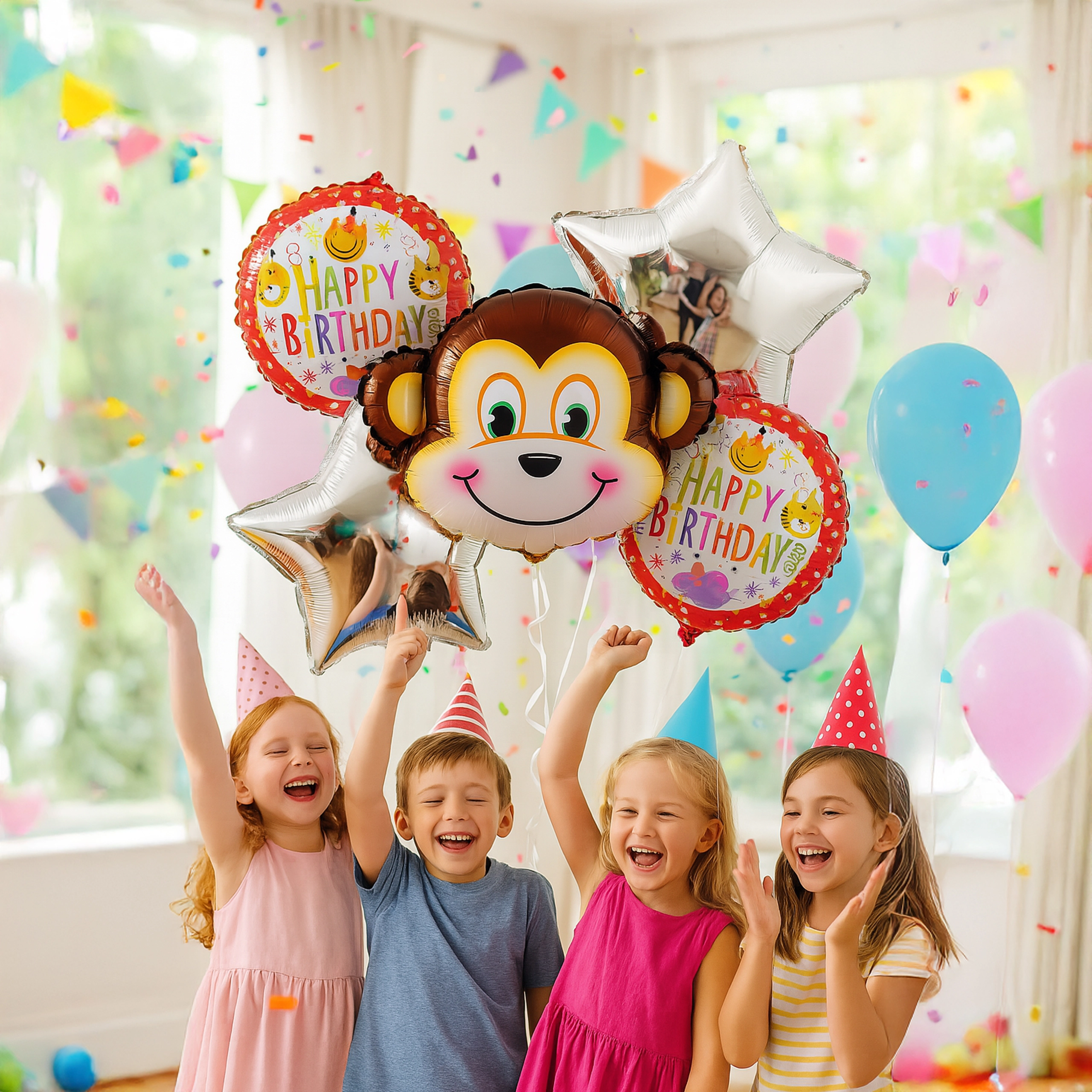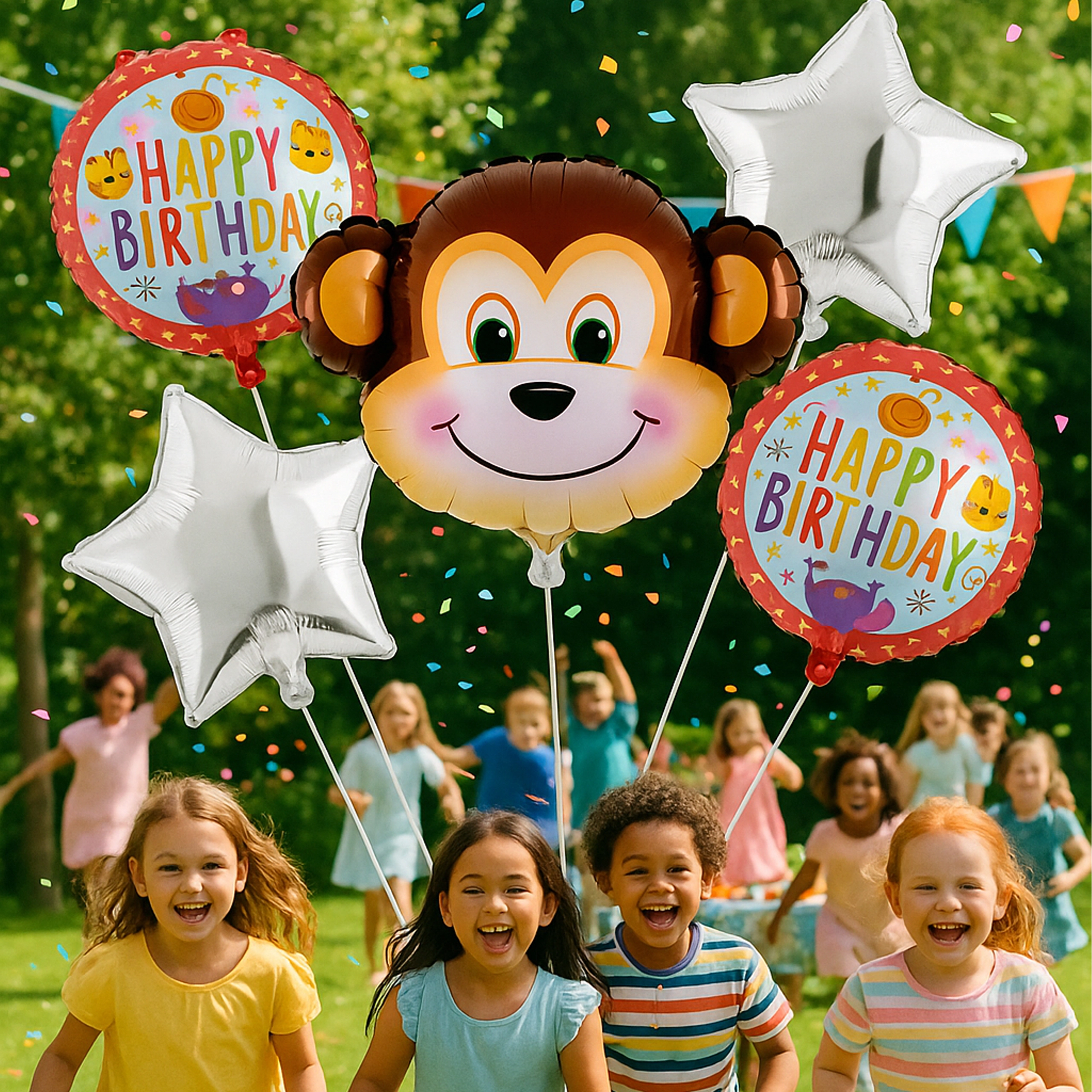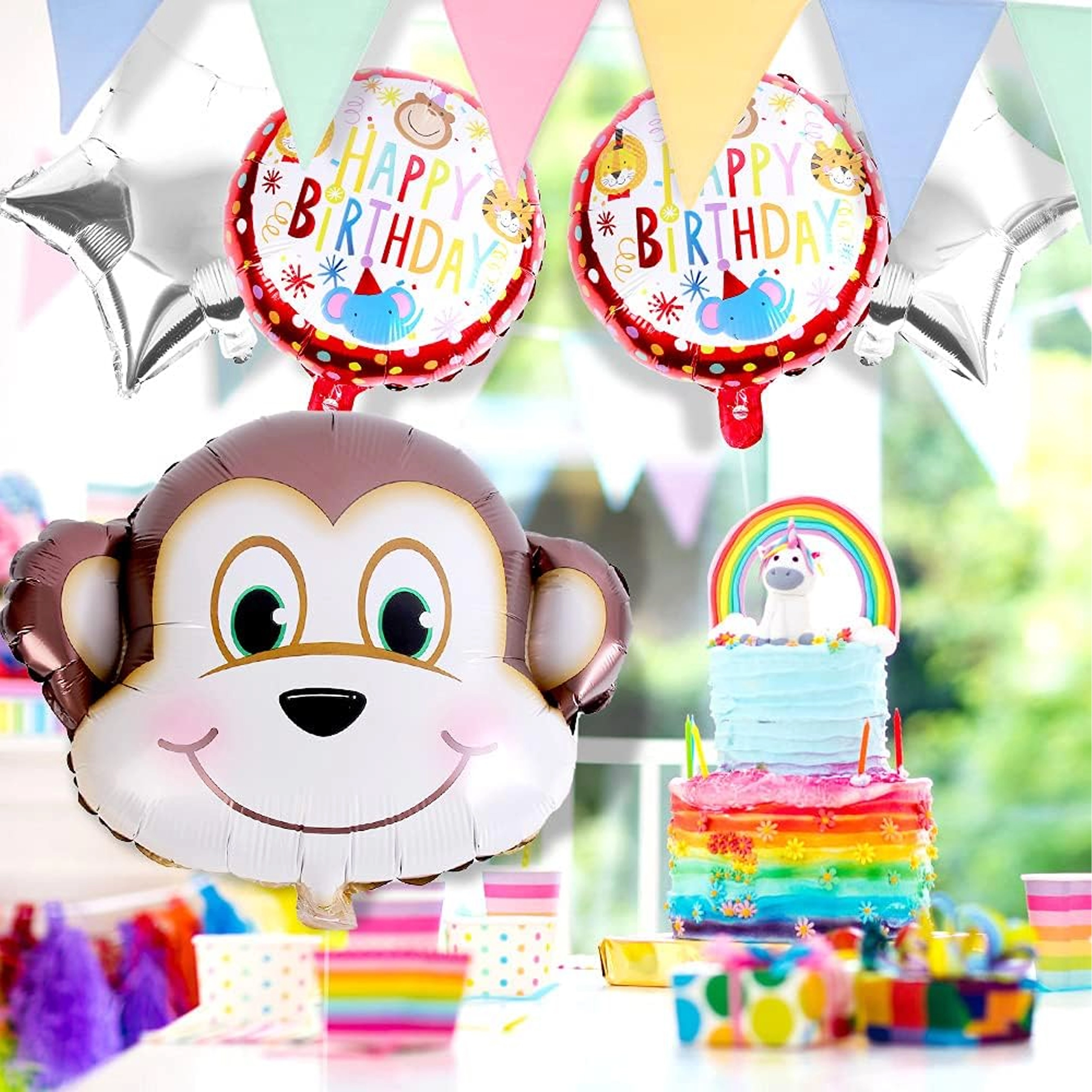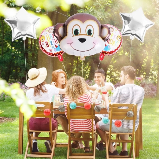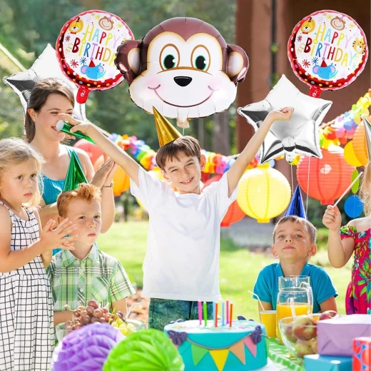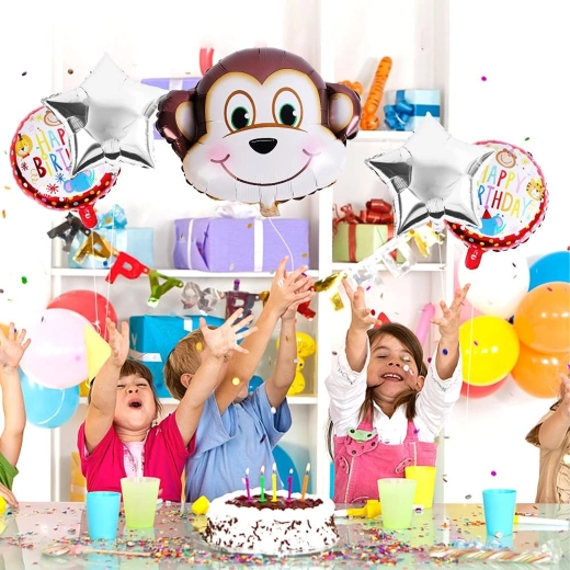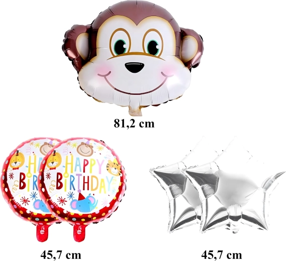 Vidám majmos lufiszettel ragyogóvá teheti a gyerekzsúrt. A csomag tartalma: 1 db majom alakú lufi, 2 db HAPPY BIRTHDAY feliratú lufi és 2 db ezüst csillag – ideális dekoráció születésnapra és állatkerti/dzsungel stílusú bulikhoz.