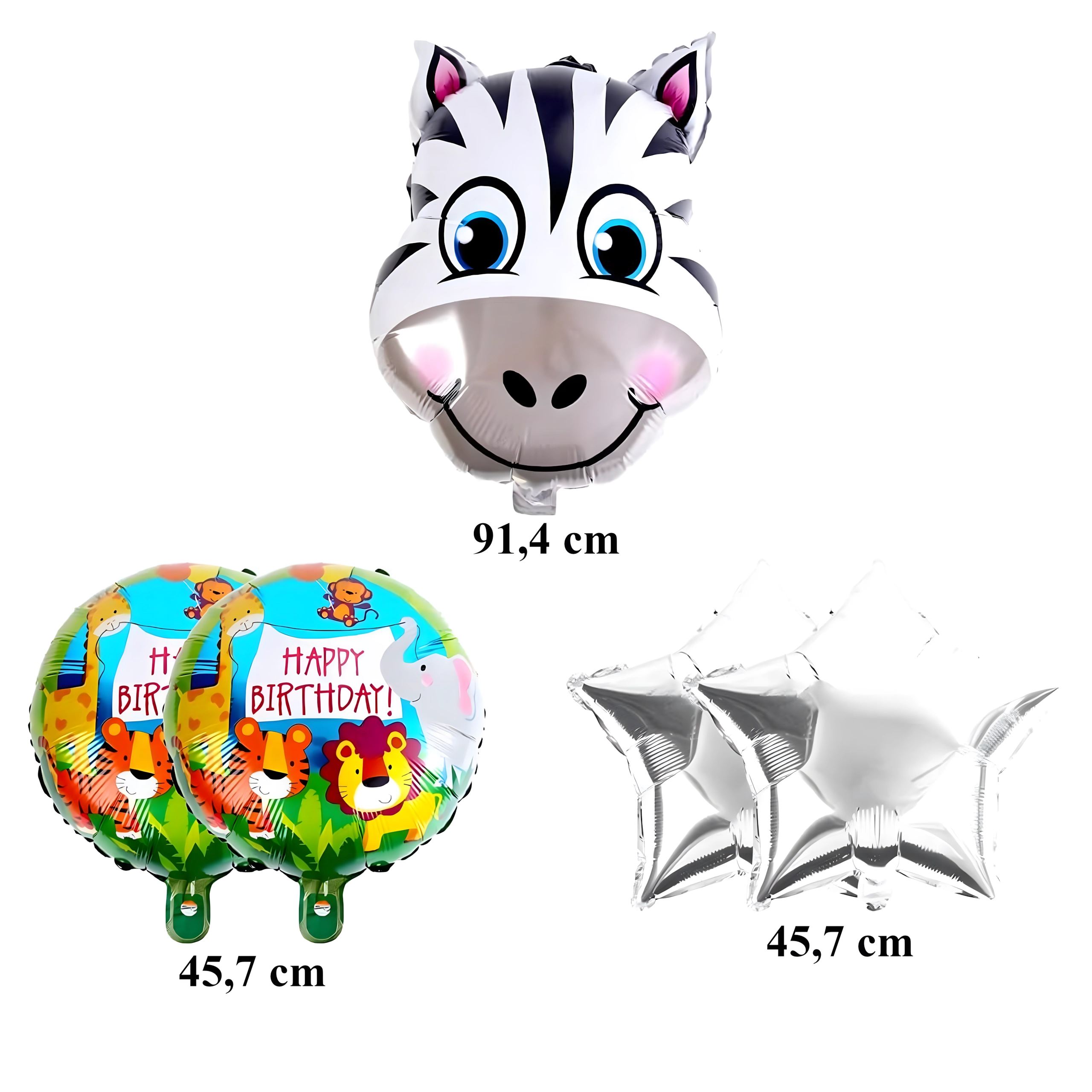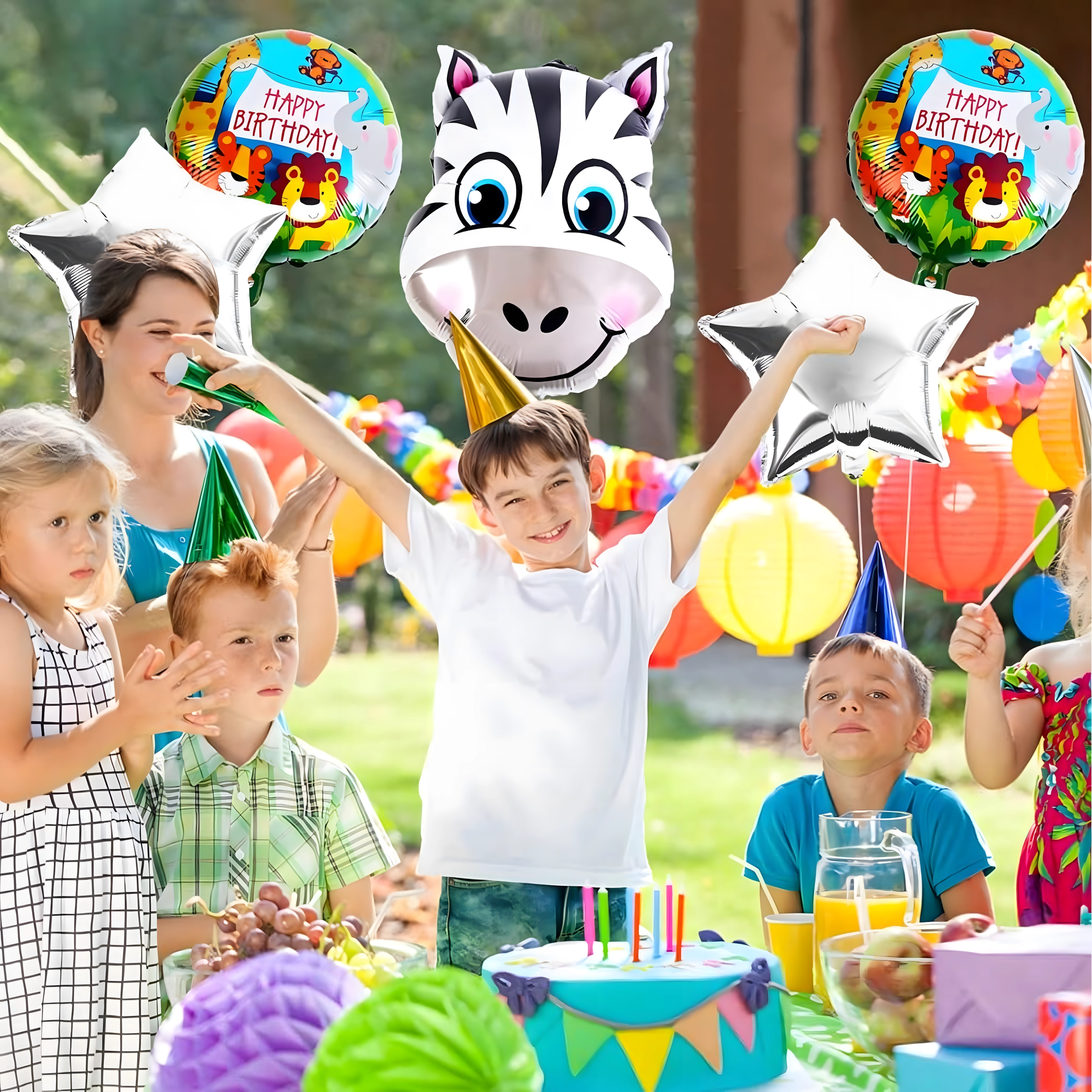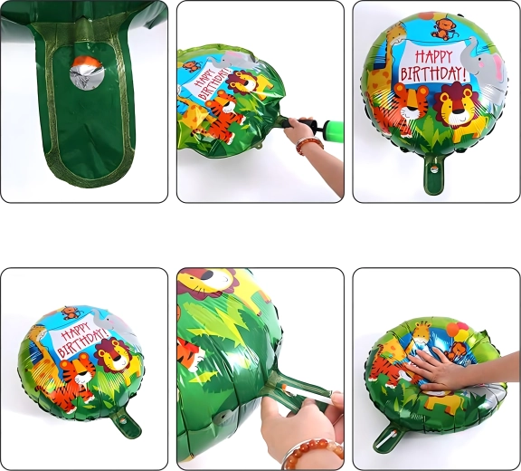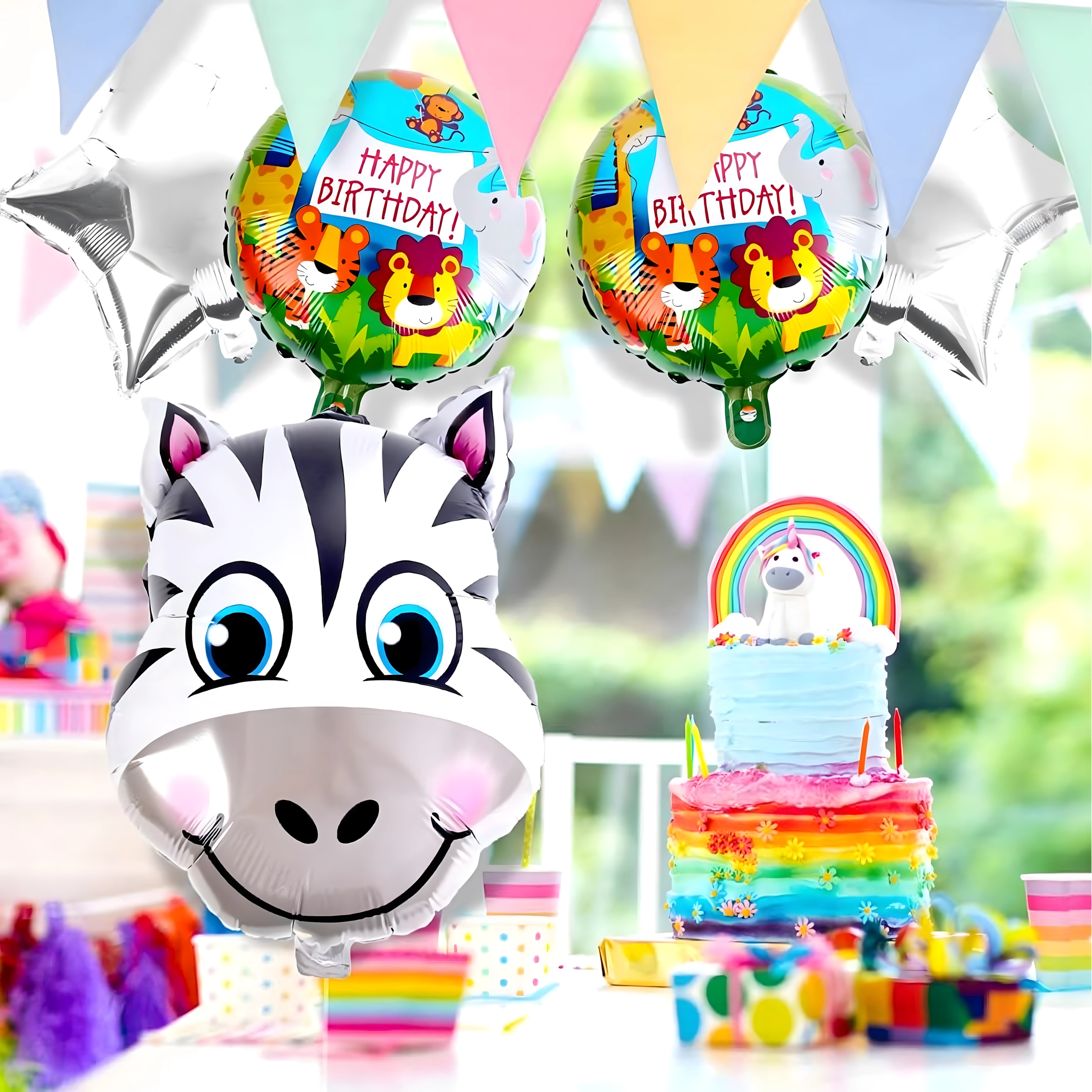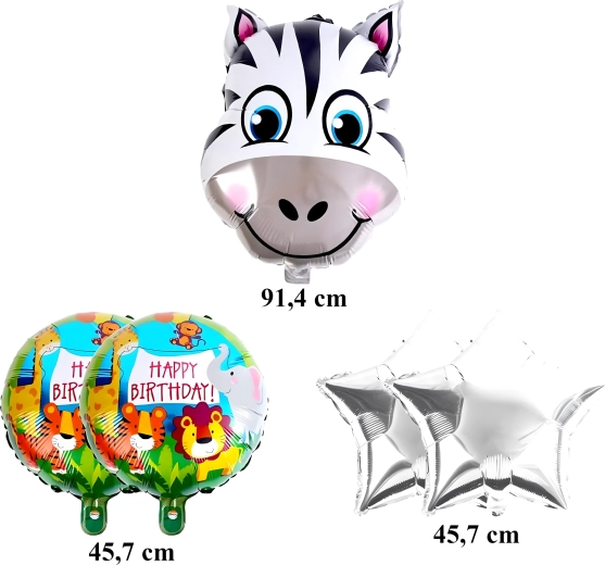 Ez a színes lufiválogatás varázslatos hangulatot teremt gyerek születésnapokon és tematikus partijakon. A bájos zsiráf, a HAPPY BIRTHDAY feliratok és az arany csillagok kombinációja remekül illik a fotósarok, a desszertasztal és a főasztal dekorálásához.
