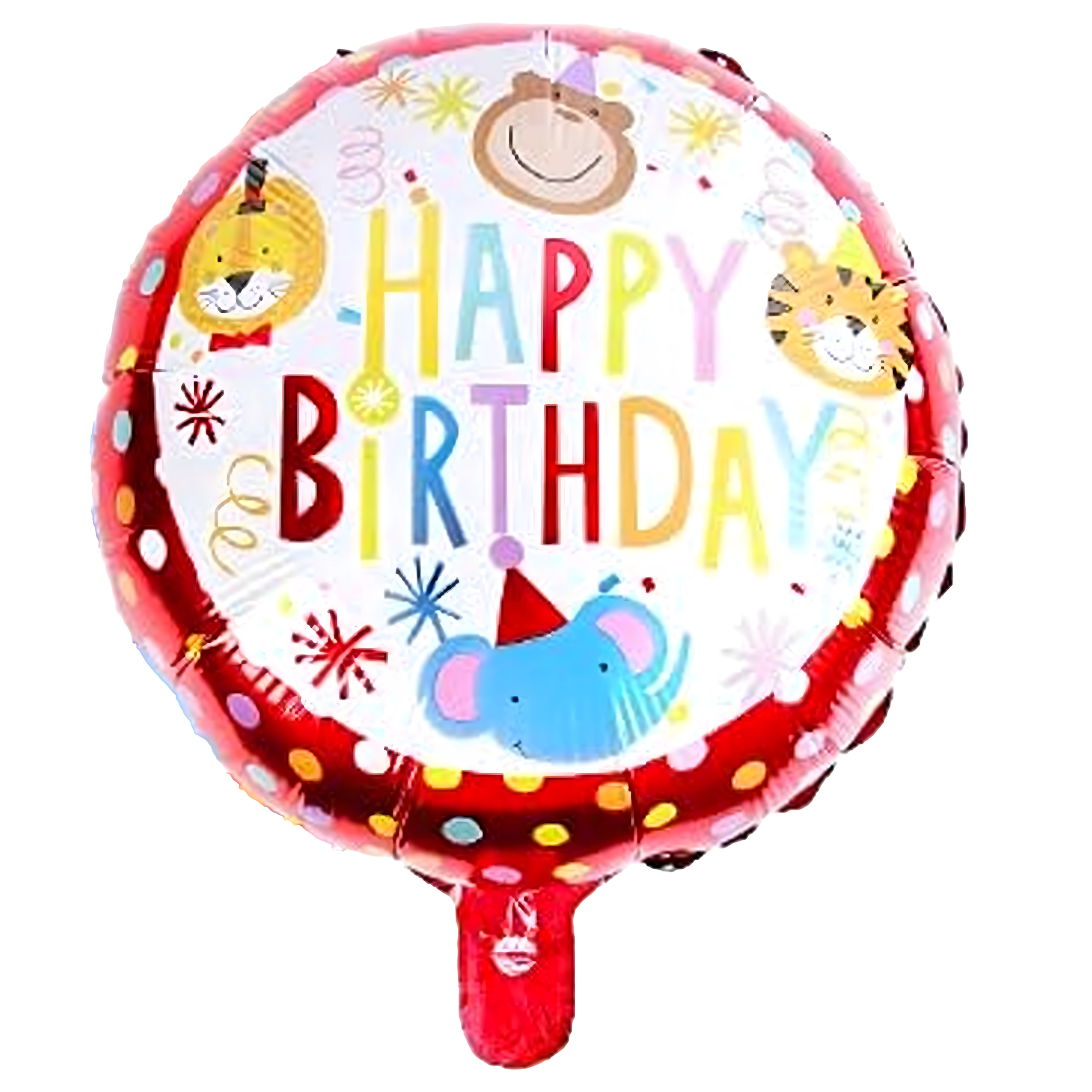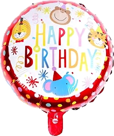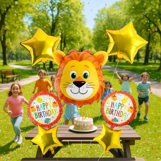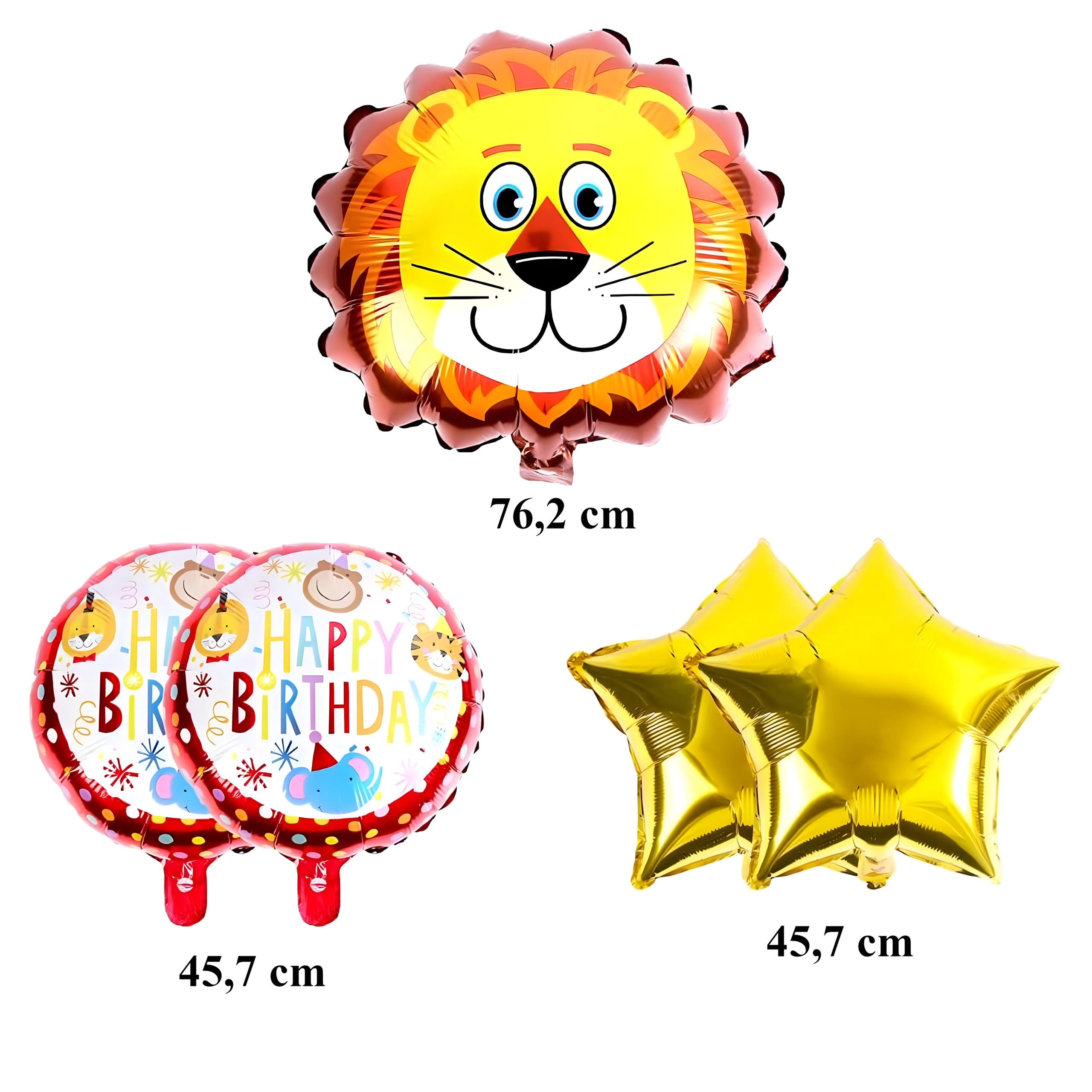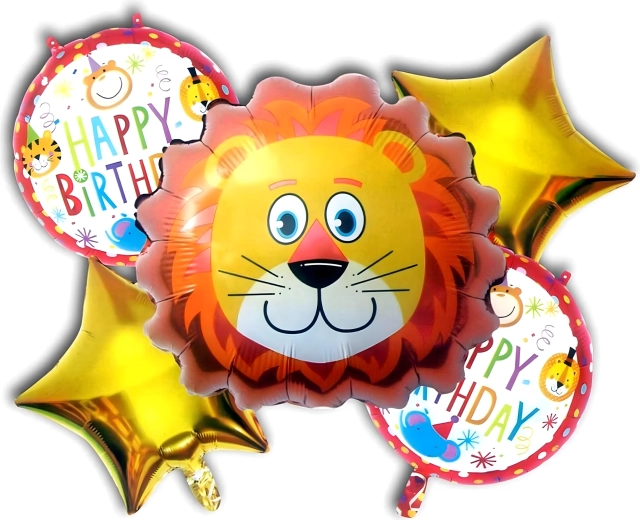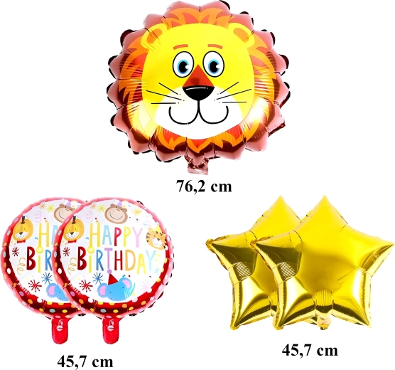 - 1× oroszlán alakú lufi, 2× HAPPY BIRTHDAY feliratú lufi, 2× arany csillag
