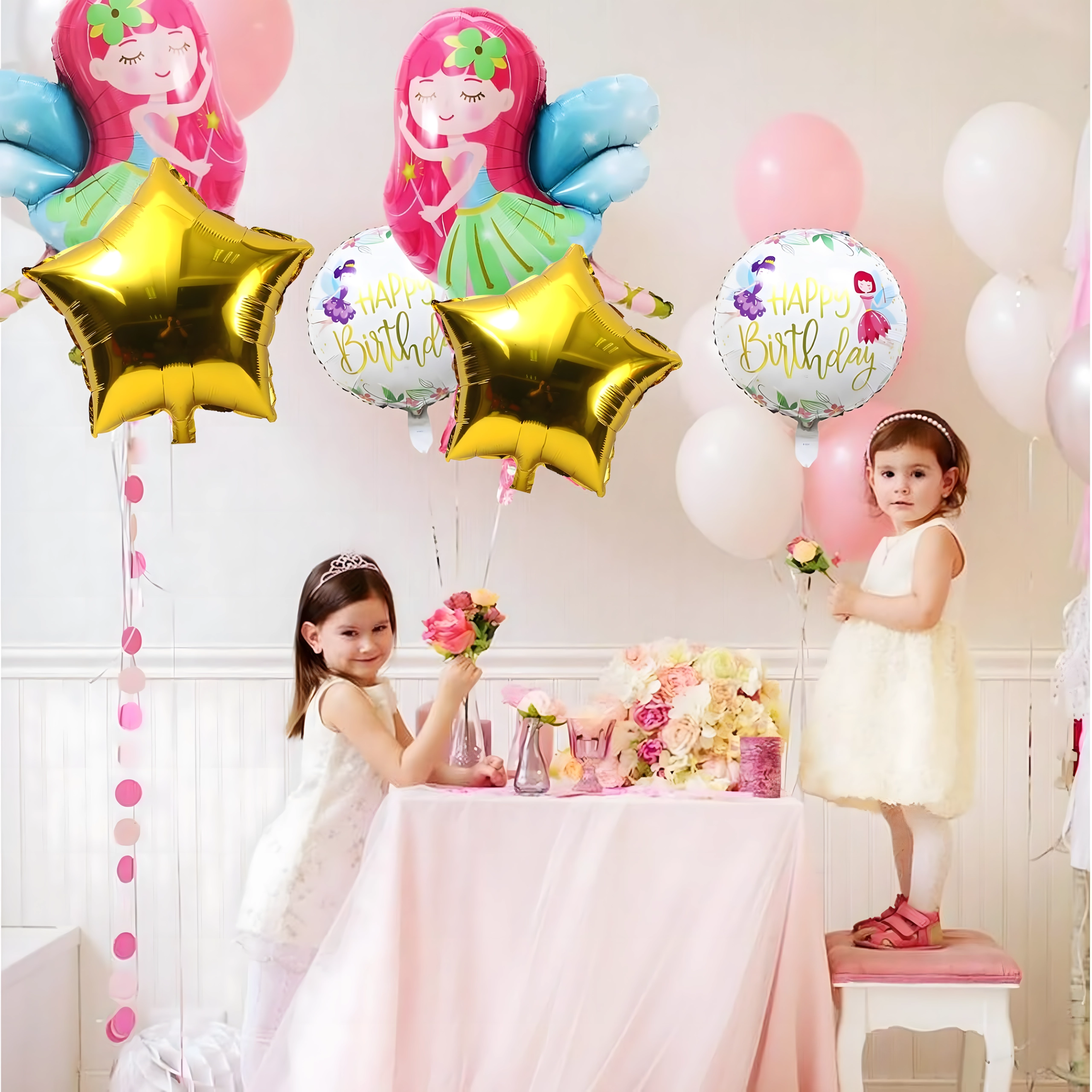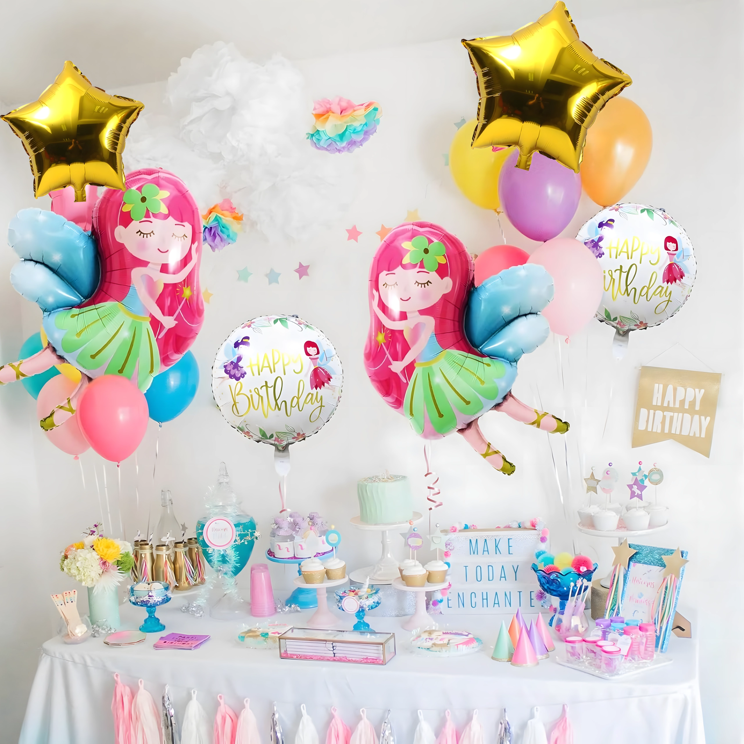 Ez a mesés tündéres lufiszett egyedülálló hangulatot teremt minden ünnepen. A nagy, tündér alakú lufi és a kiegészítő kerek, illetve csillag alakú lufik kombinációja látványos dekorációt biztosít erőfeszítés nélkül.