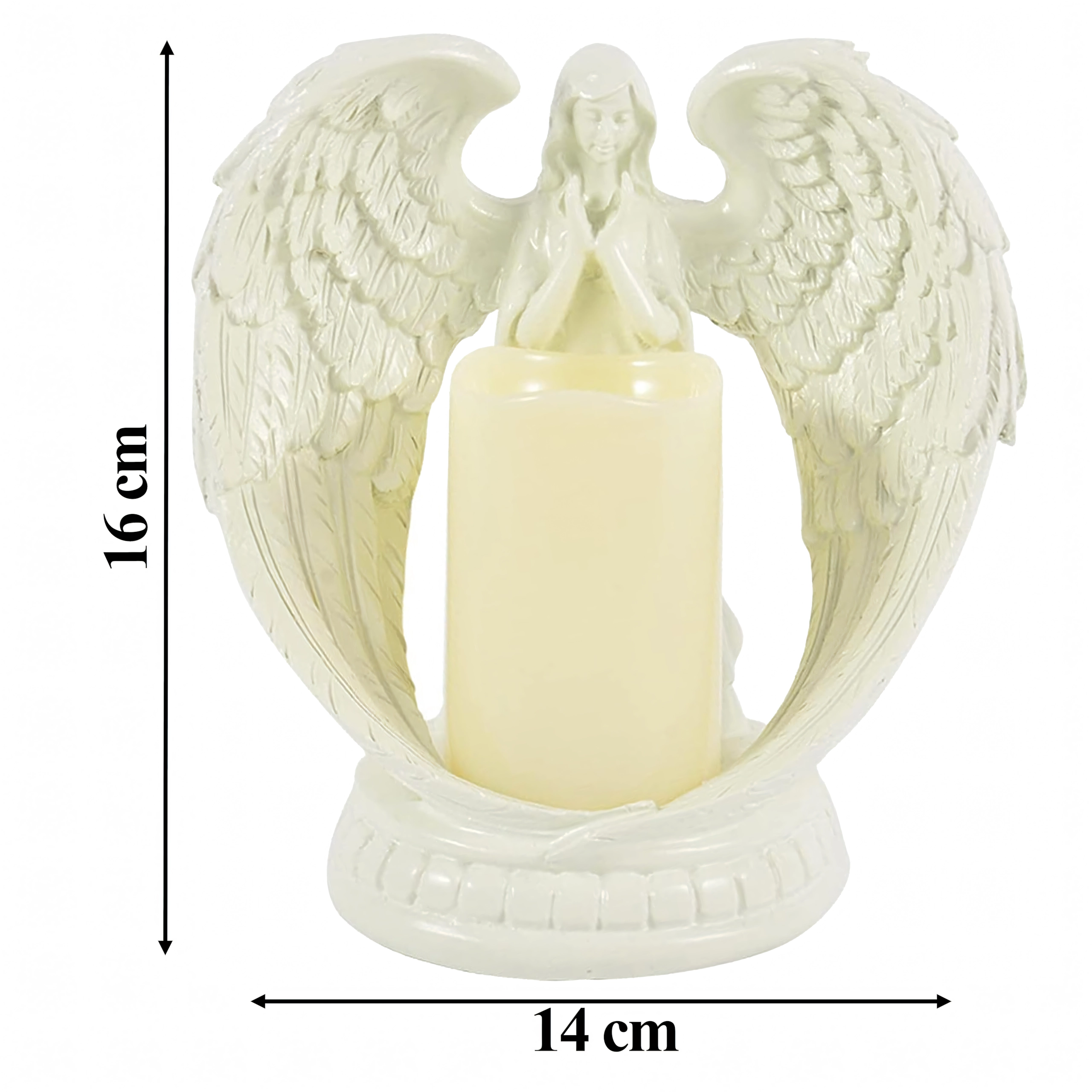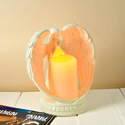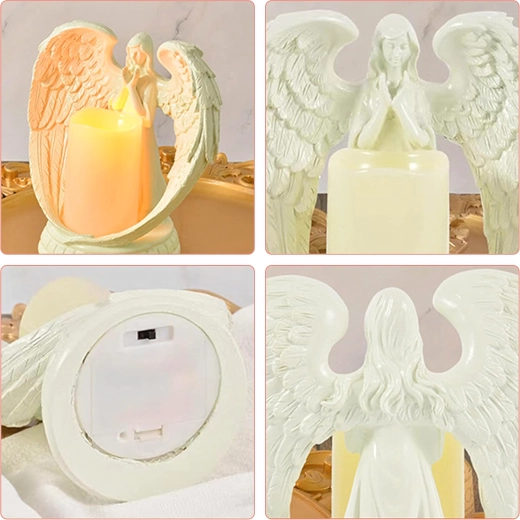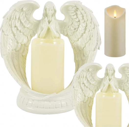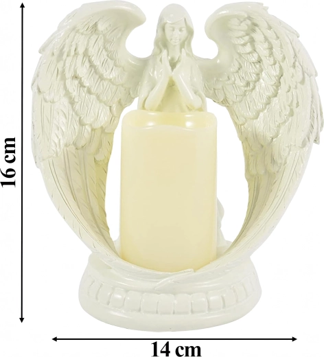 Elegáns angyal LED fénnyel a kezében, amely meghitt és élethű fényhatásokat teremt. A gipszből készült figura a nyugalmat, emlékezést és áldást szimbolizálja. Ideális beltéri dekorációnak, vallási szertartásokra, sírhelyre, illetve különleges ajándéknak.