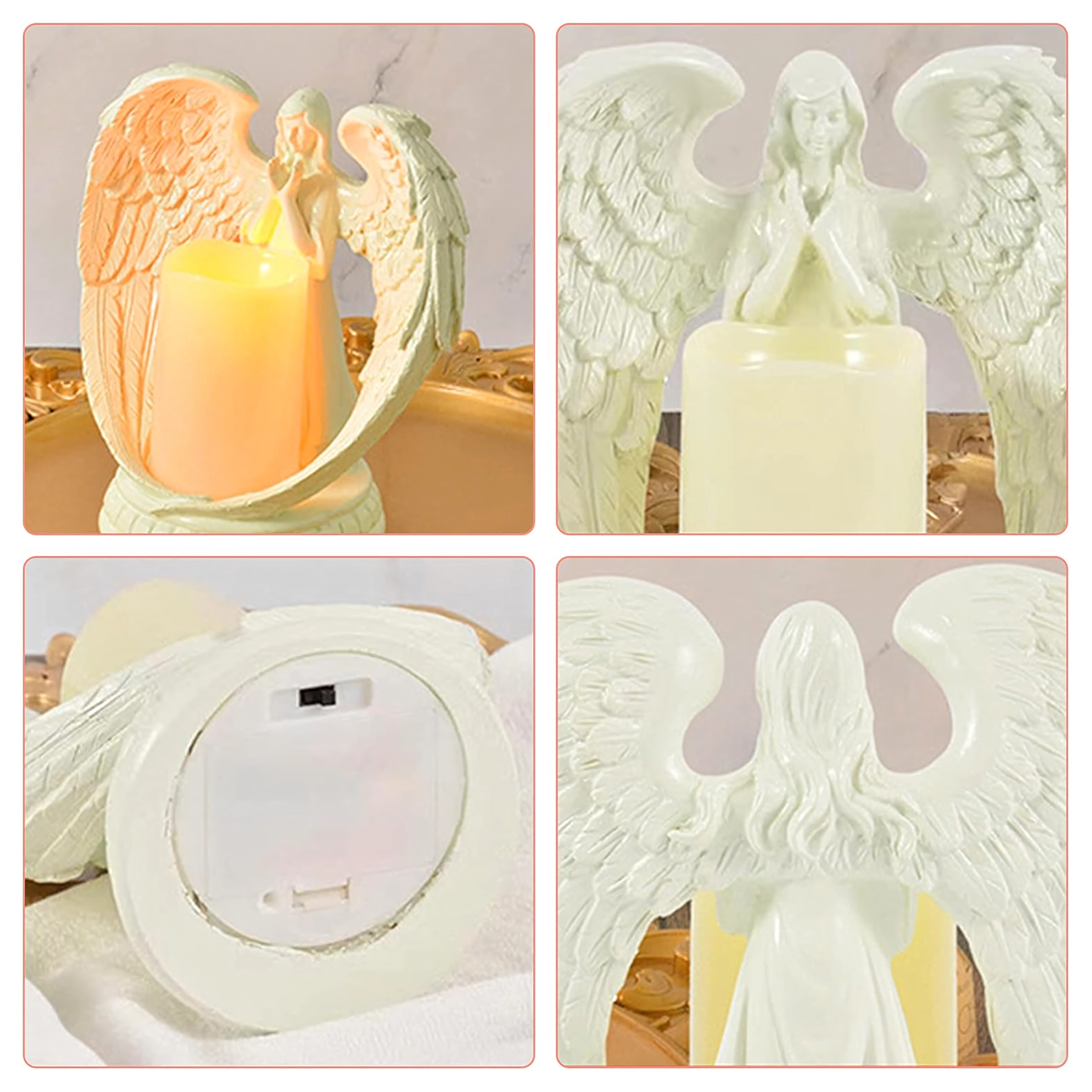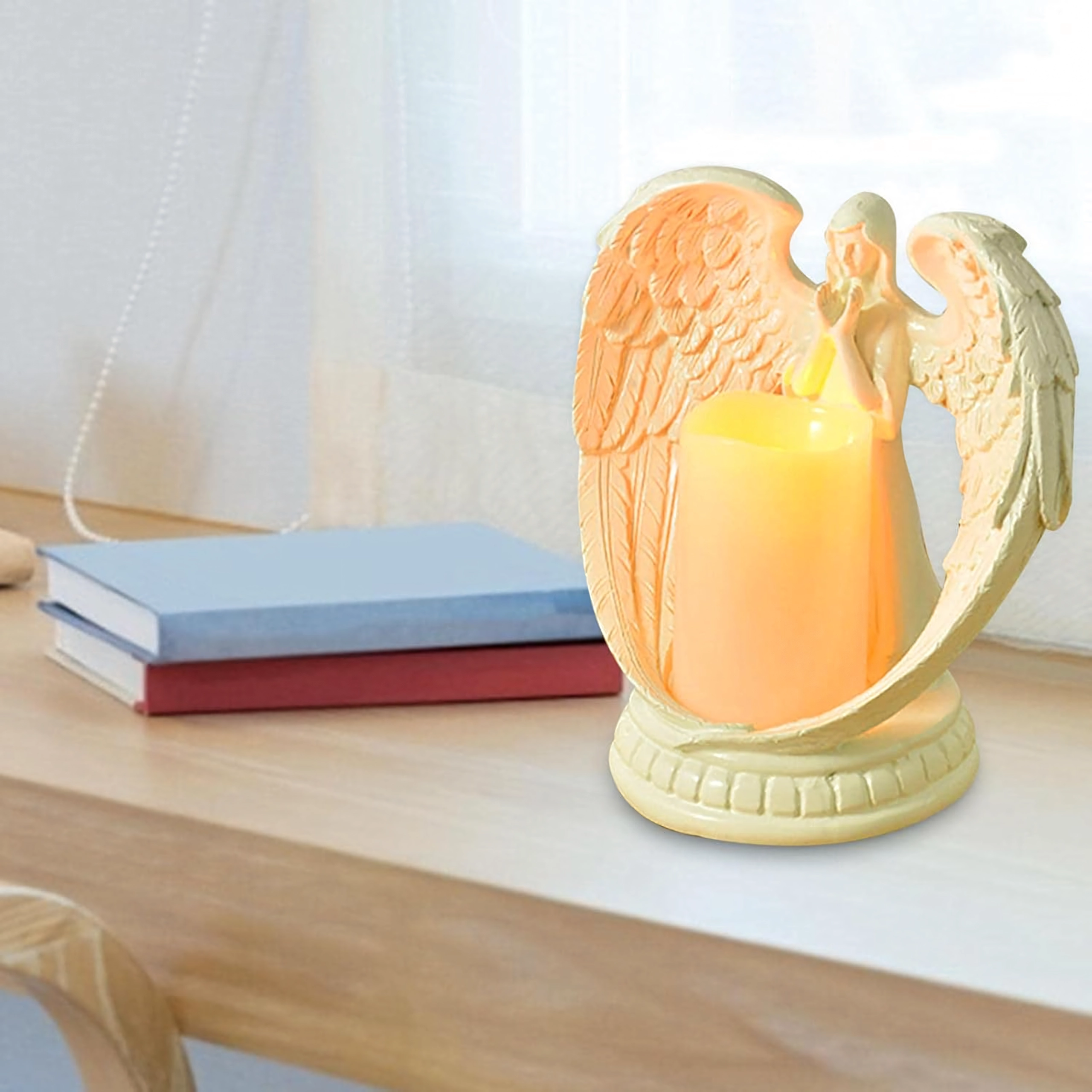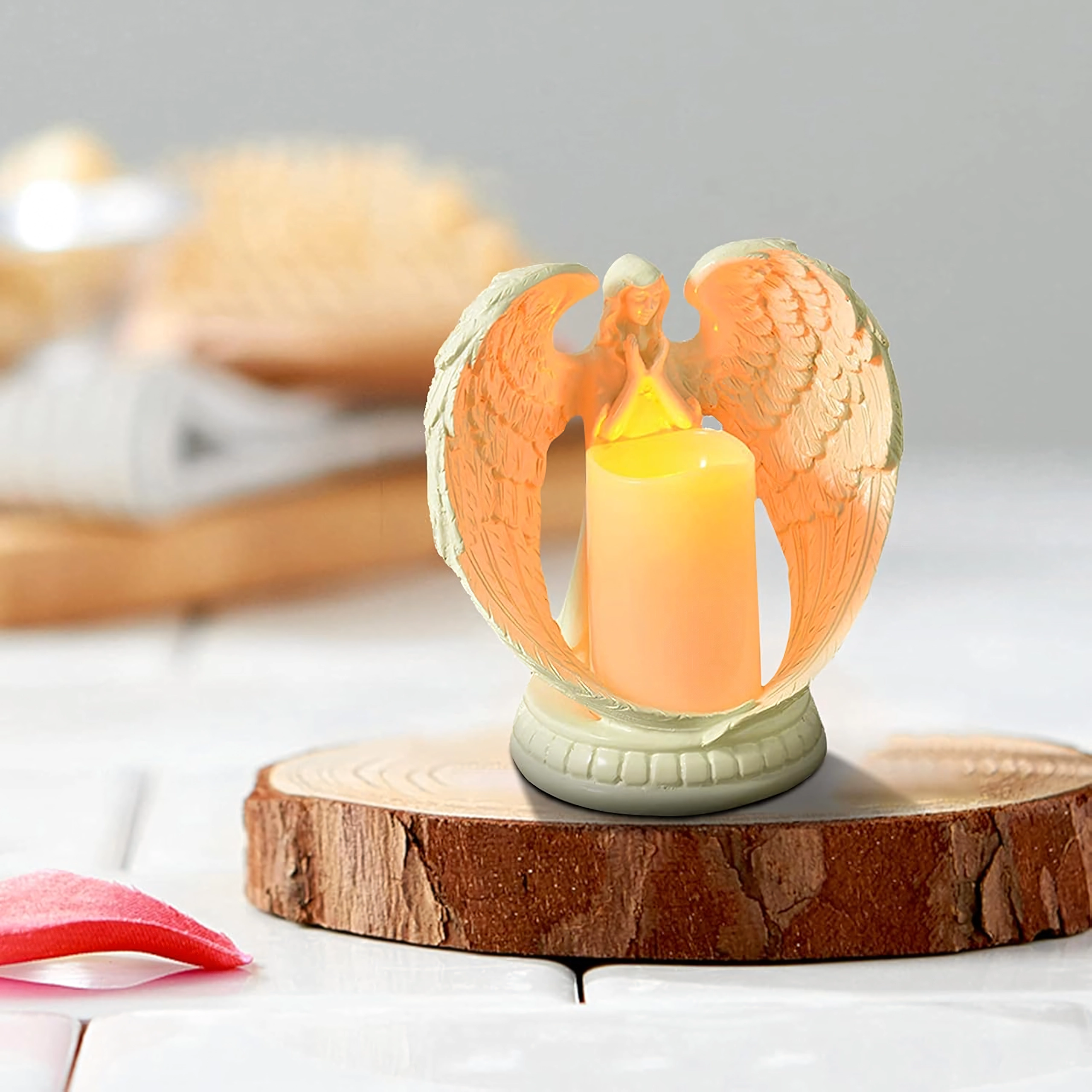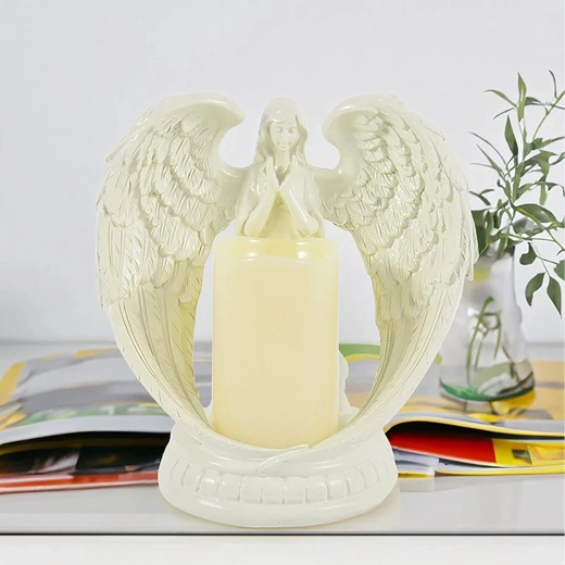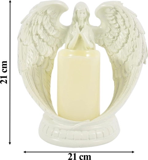 Elegáns dekoratív angyal gyertyával, valósághű LED fénnyel. Csiszolt gyantából készült, a nyugalom, emlékezés és áldás szimbóluma. Ideális beltérbe, vallási szertartásokra, sírra, valamint különleges ajándéknak.