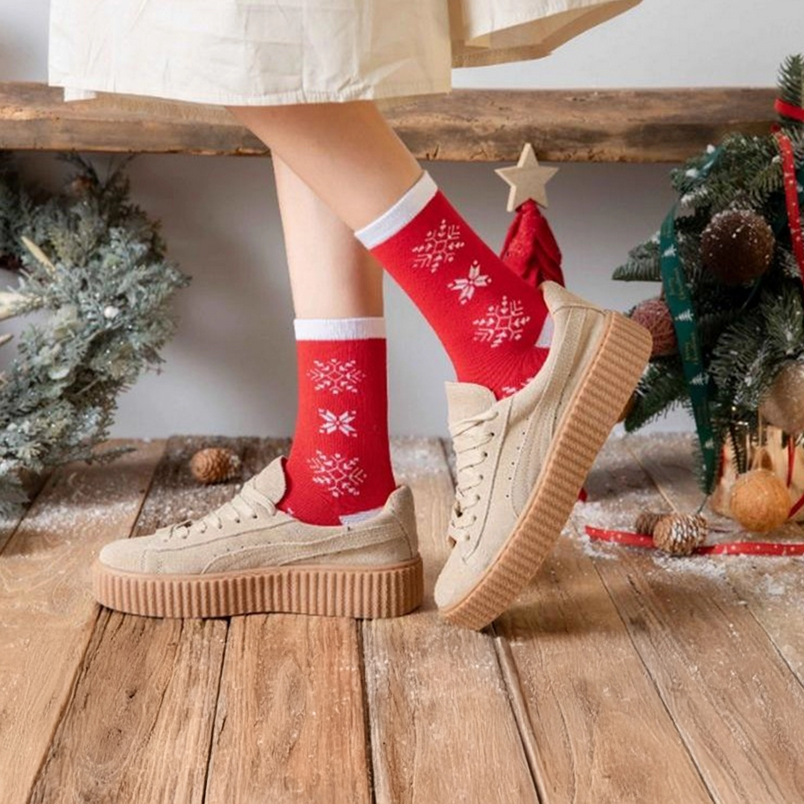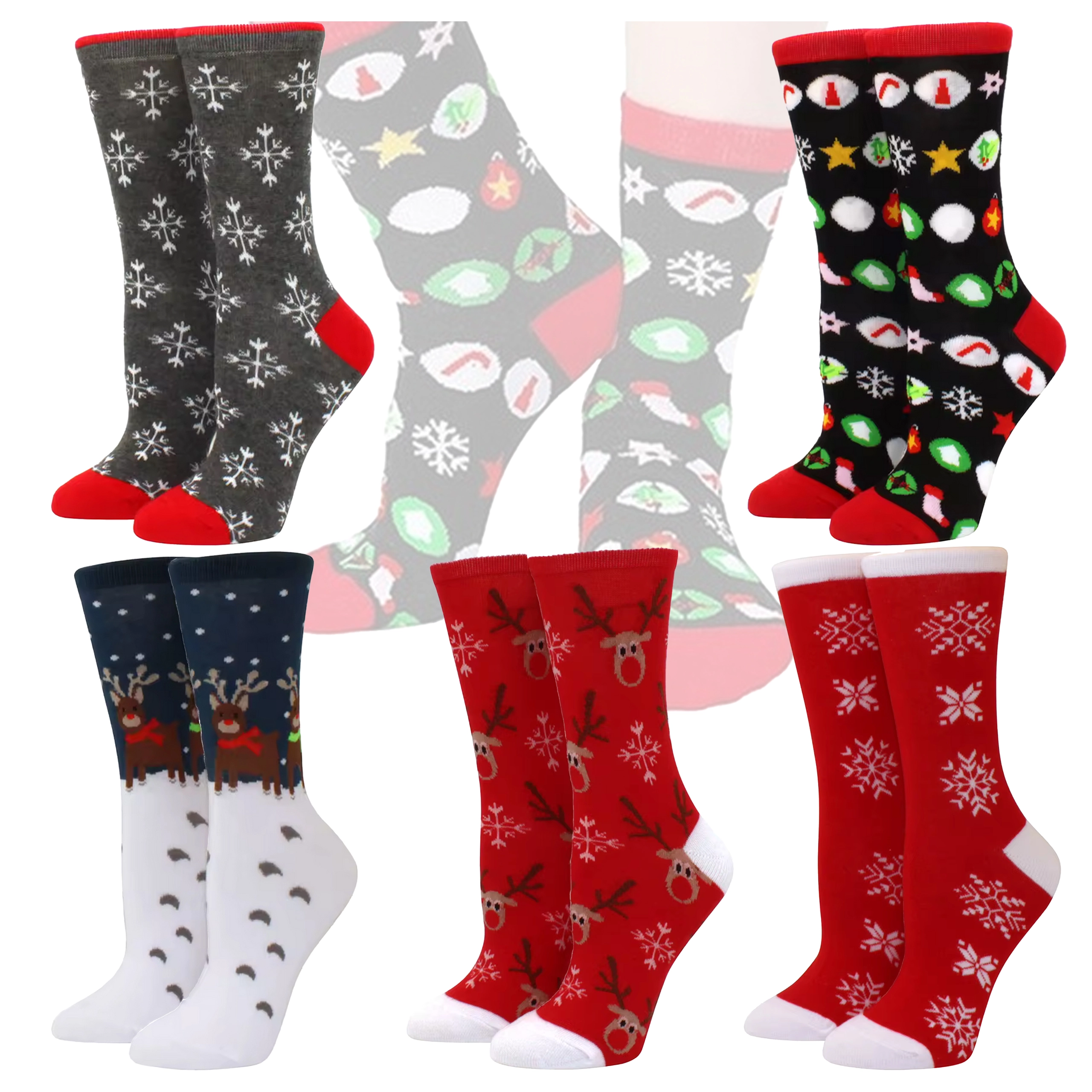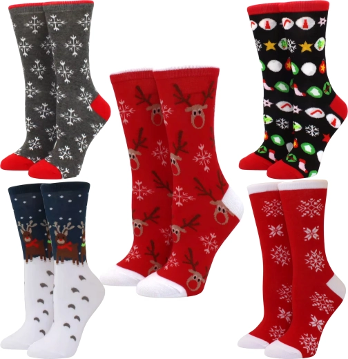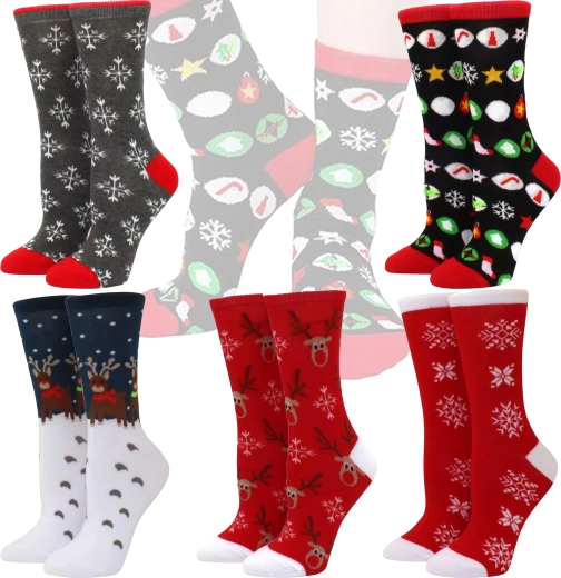 Stílusos szett: 5 pár karácsonyi pamut zokni a téli napok kényelméért és öröméért. Kiváló minőségű pamutból – puha, légáteresztő és kellemes tapintású. Vidám minták, mint rénszarvasok, fenyőfák és hópelyhek, amelyek ünnepi hangulatot teremtenek. Remek ajándék karácsonyra és Mikulásra is.