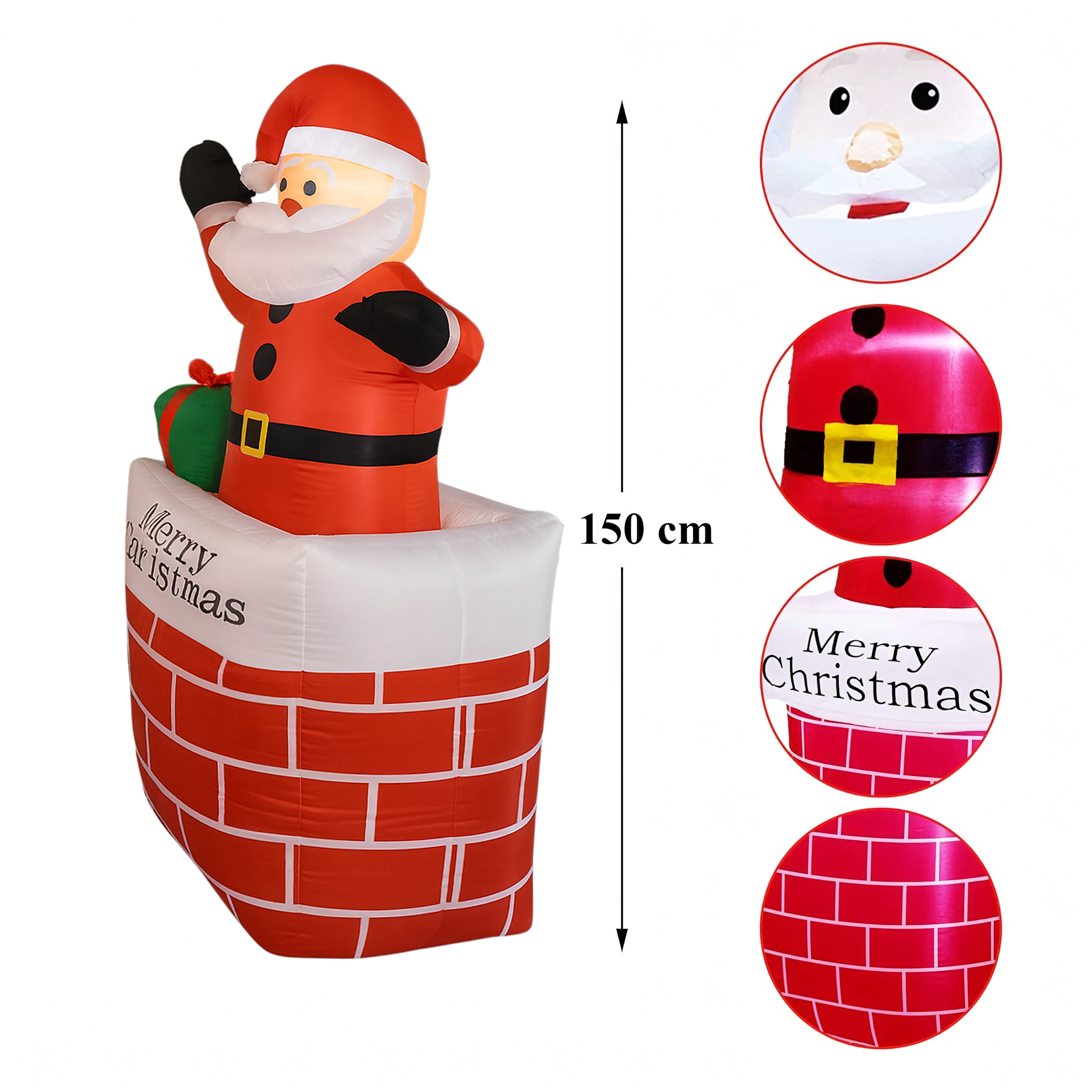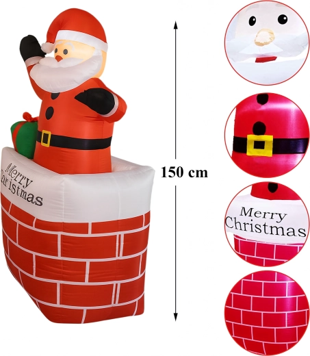 Teremts varázslatos karácsonyi hangulatot a felfújható kéményes Mikulás dekorációval, 150 cm magasságban. Az integrált LED világításnak és az automatikus felfújásnak köszönhetően ez a dísz látványos, biztonságos és könnyen használható. Remekül illik otthonra, kertbe, üzletbe és karácsonyi rendezvényekre, és örömet szerez gyermekeknek és felnőtteknek egyaránt.