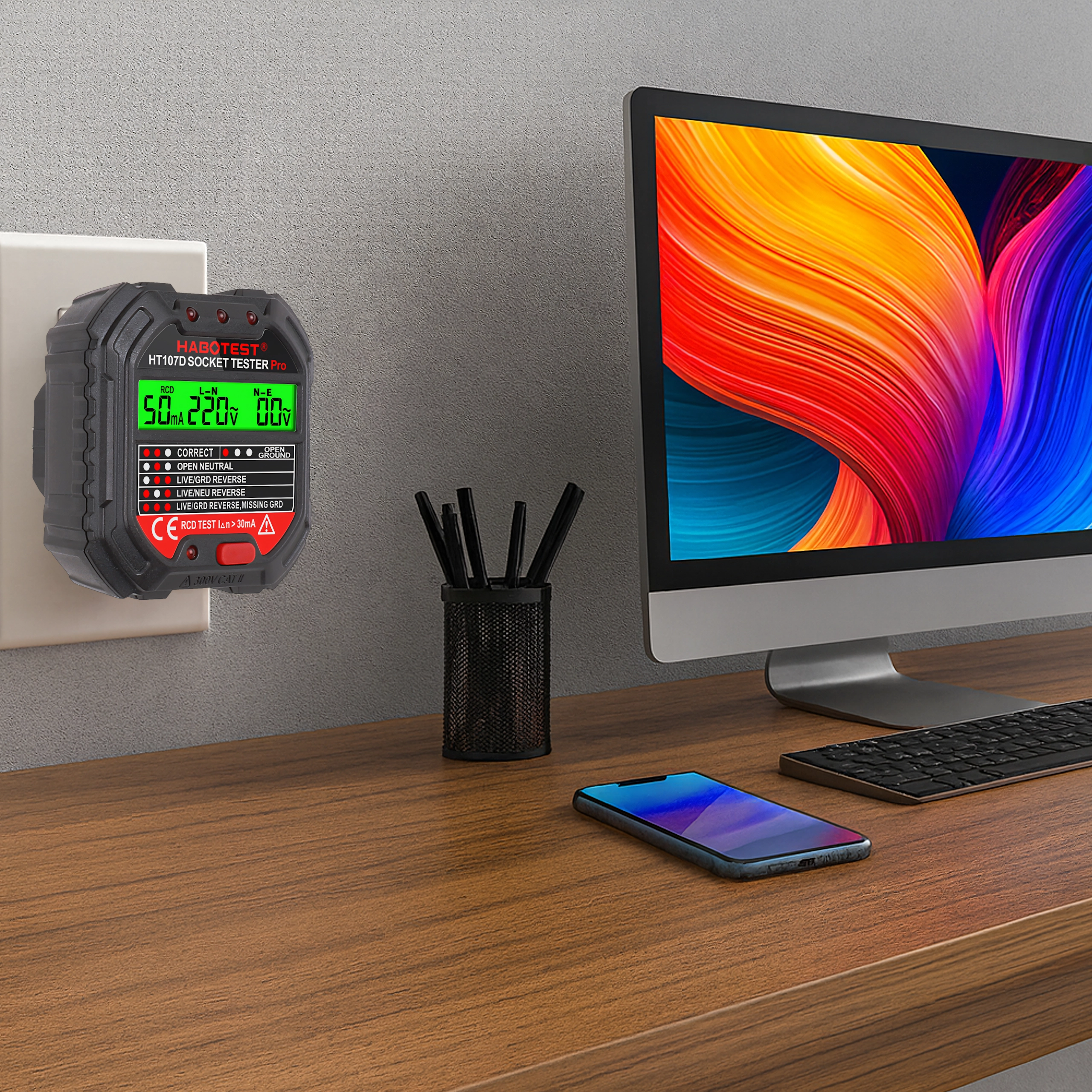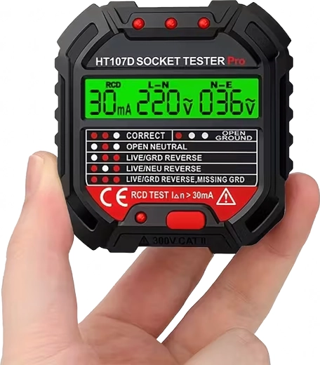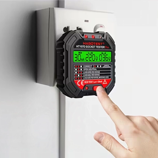 A HABOTEST HT107D praktikus eszköz a hálózati aljzatok gyors ellenőrzésére. A világos LCD kijelzőnek köszönhetően áttekinthető információkat nyújt a bekötés és a feszültség állapotáról, így azonnal látható, hogy az aljzat biztonságosan használható-e. A beépített RCD teszt lehetővé teszi az áram-védőkapcsoló működésének ellenőrzését, növelve a védelmet az áramütéssel szemben.
