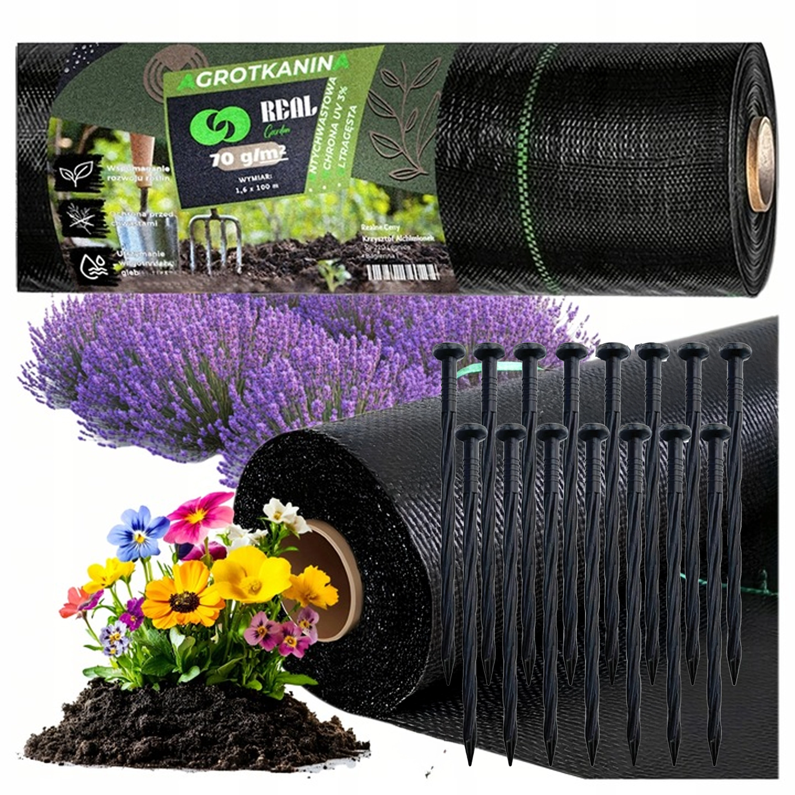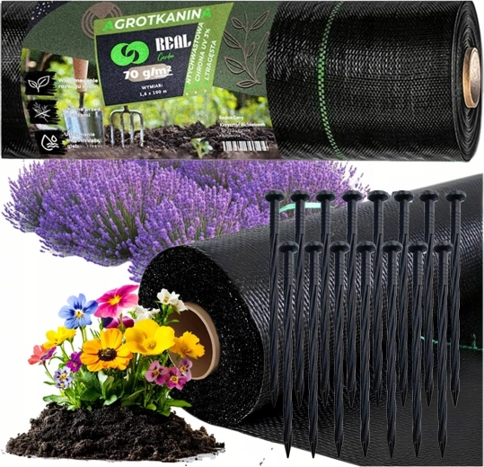 Praktikus, fekete színű kerti agrotextília 70 g súlyú és 1,6 × 100 m méretben, amely hatékonyan visszaszorítja a gyomnövények növekedését, védi az ültetvényeket, és lehetővé teszi a könnyű mulcsozást kéreggel vagy kaviccsal. Tartós UV-stabilizálás biztosítja a hosszú élettartamot. Kerti rögzítőkkel együtt szállítva a gyors telepítéshez.