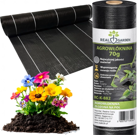 Praktikus kerti agrotextília 70 g/m² grammsúllyal, 1,6 × 50 m méretben, fekete színben, amely hatékonyan visszaszorítja a gyomok növekedését, védi az ültetést és javítja a talaj mikroklímáját. A UV stabilizációnak köszönhetően ellenáll a napfénynek, és kiváló mulcsozó alátét bokrok és dísznövények alá. Lehetővé teszi a kéreg vagy dekoratív kő egyszerű szórását, ritkább kapálás mellett.