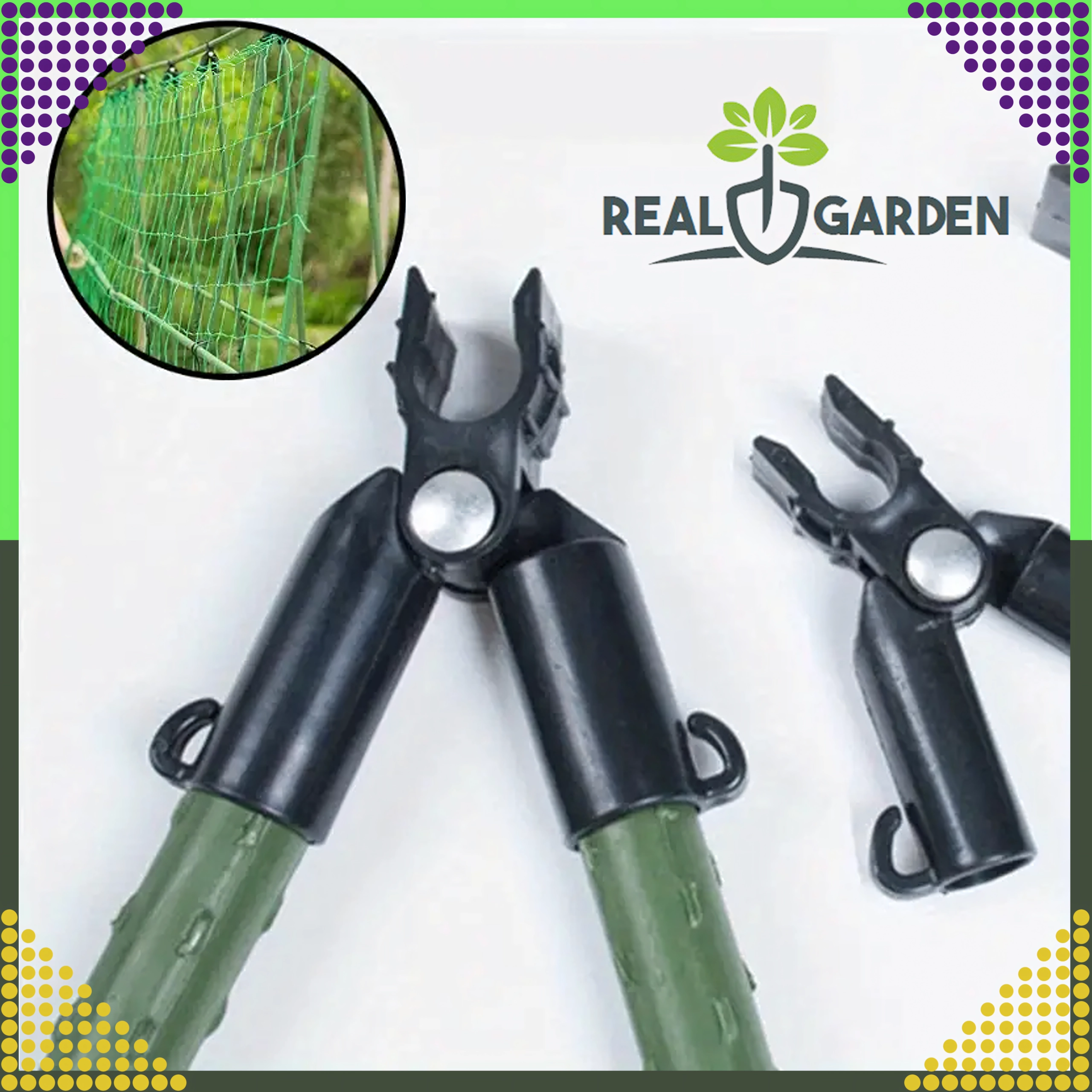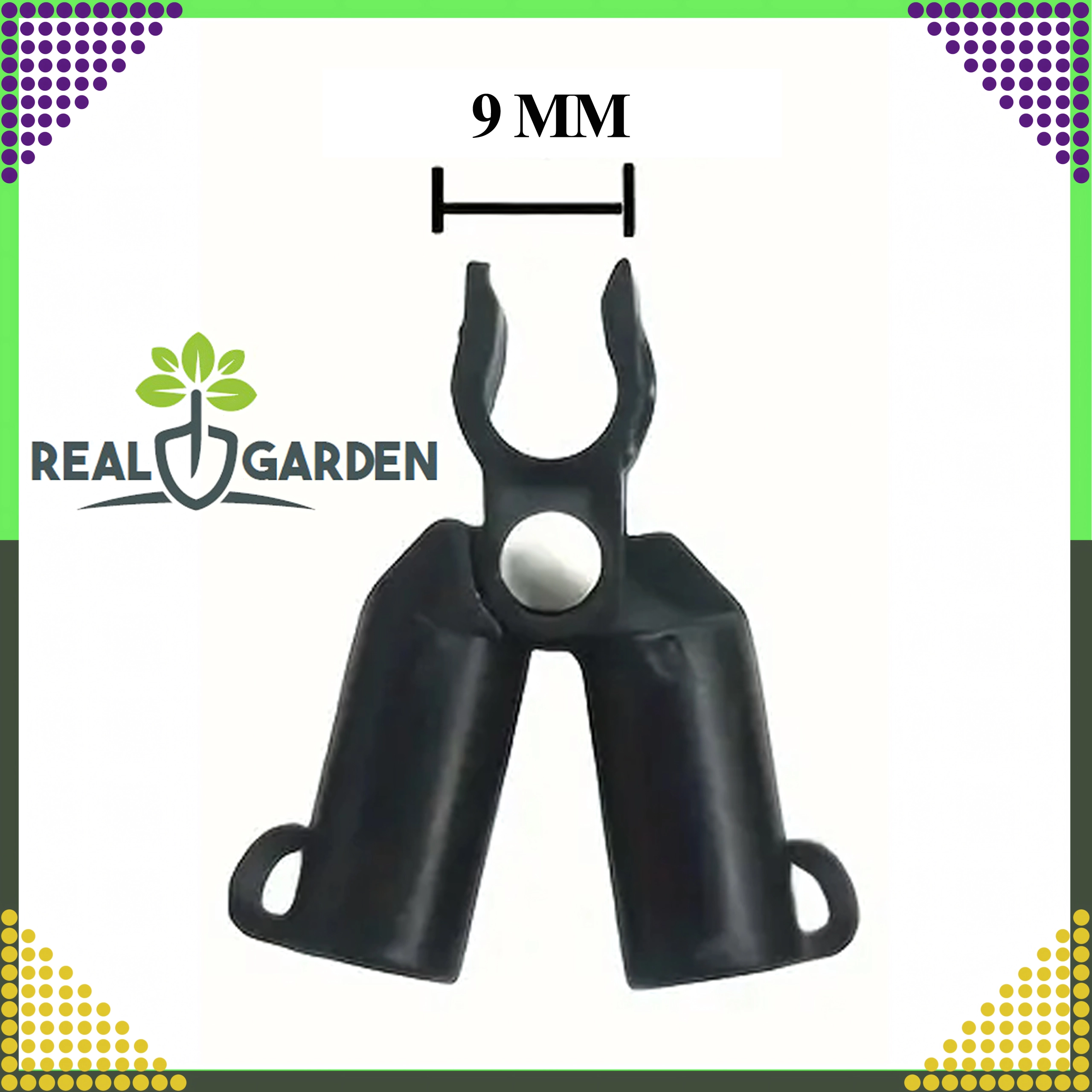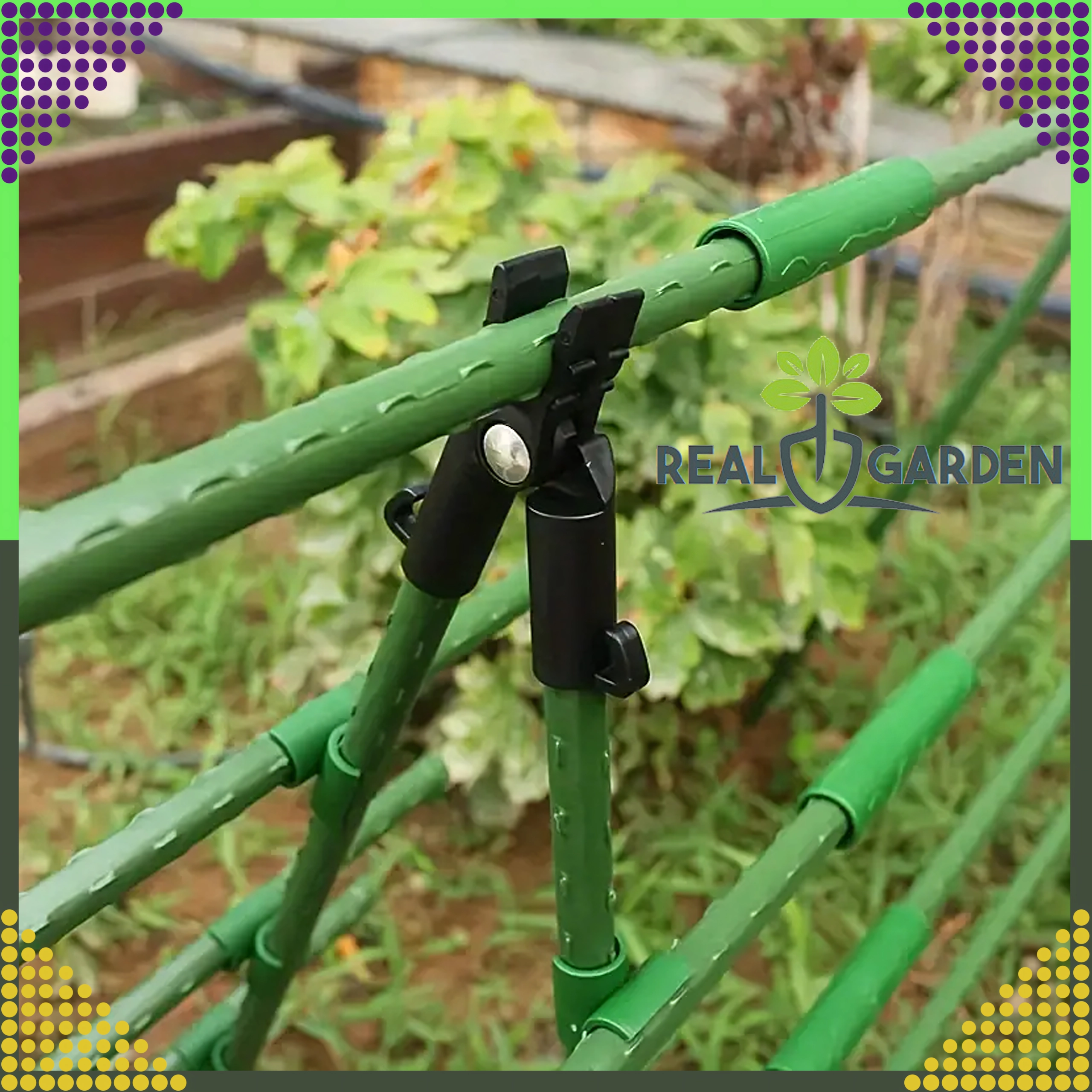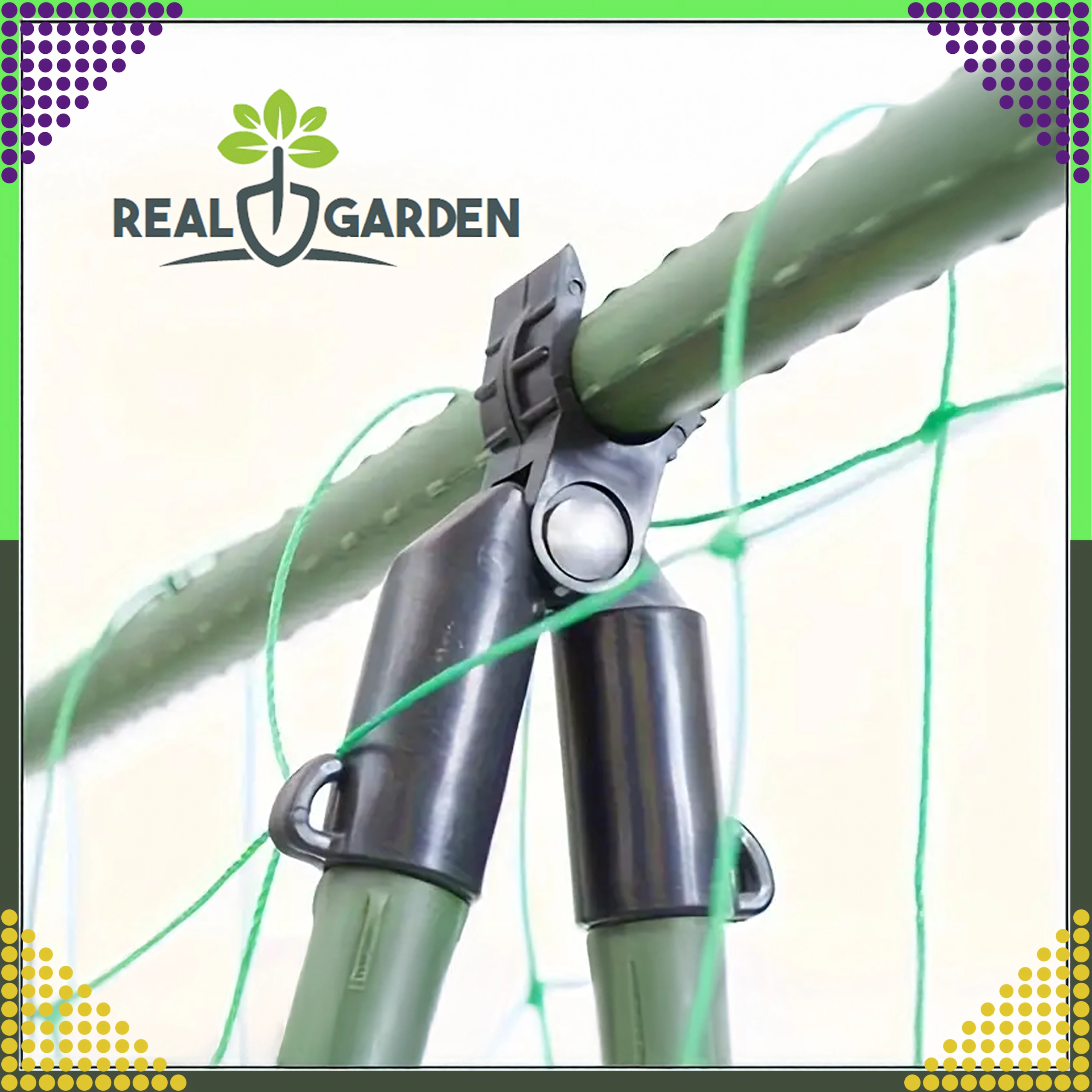 A Real Garden csúcsízületes T‑idom megkönnyíti keretek, A‑vázas szerkezetek és támaszok építését paradicsomhoz, babhoz vagy uborkához. A masszív műanyag és fém elemek kombinációjának köszönhetően stabil kapcsolatot biztosít 9 mm átmérőjű kerti pálcákhoz, és jól bírja a hosszan tartó kültéri használatot.