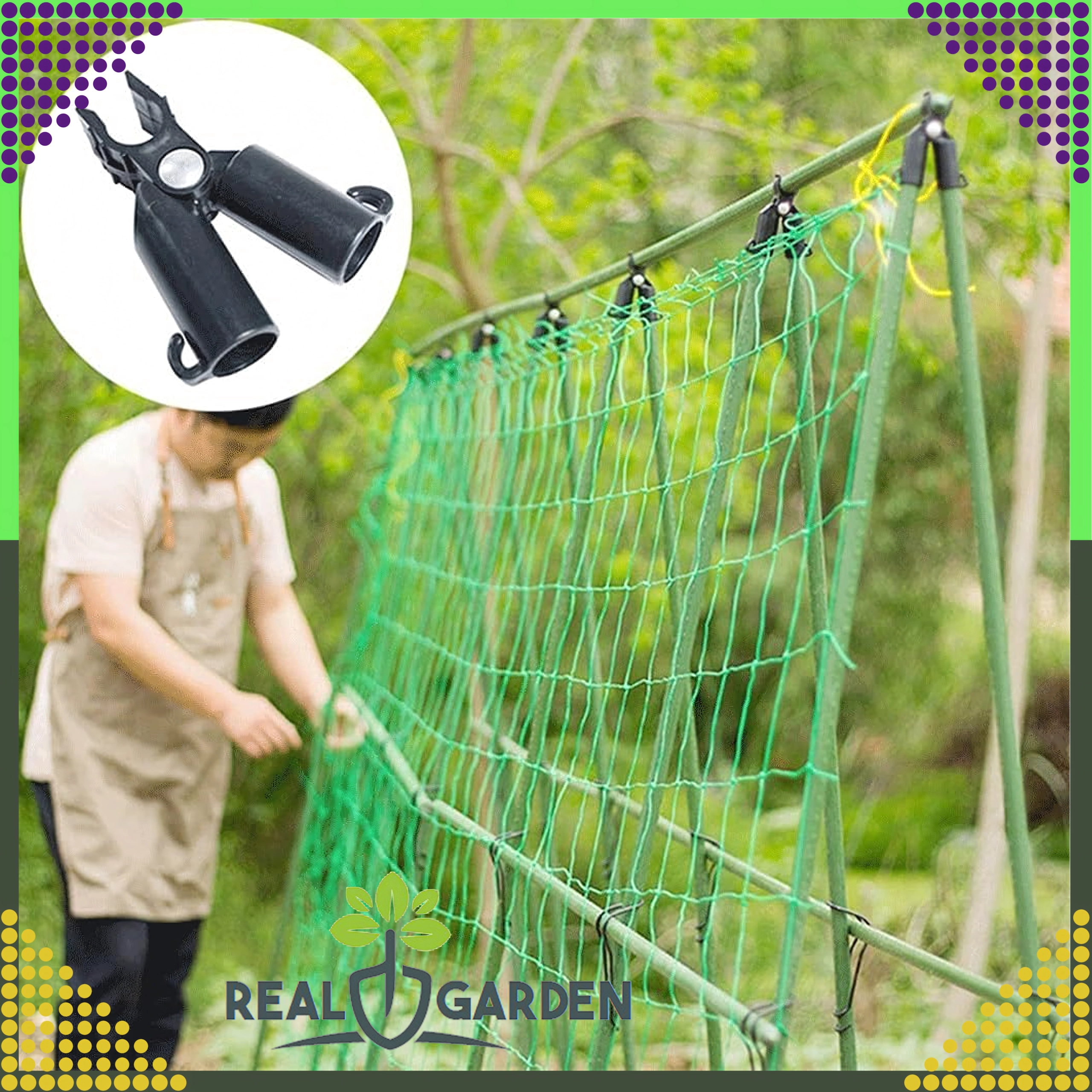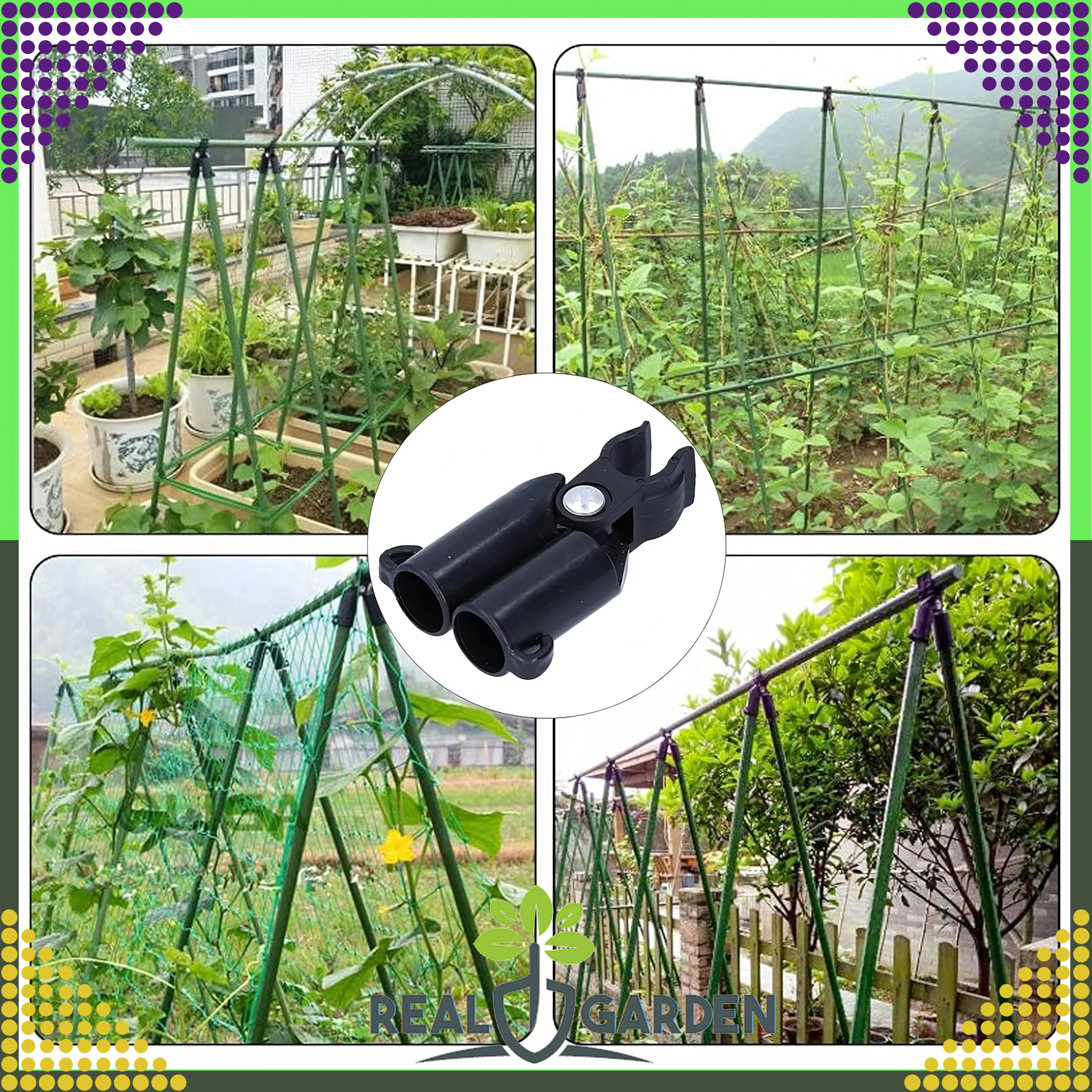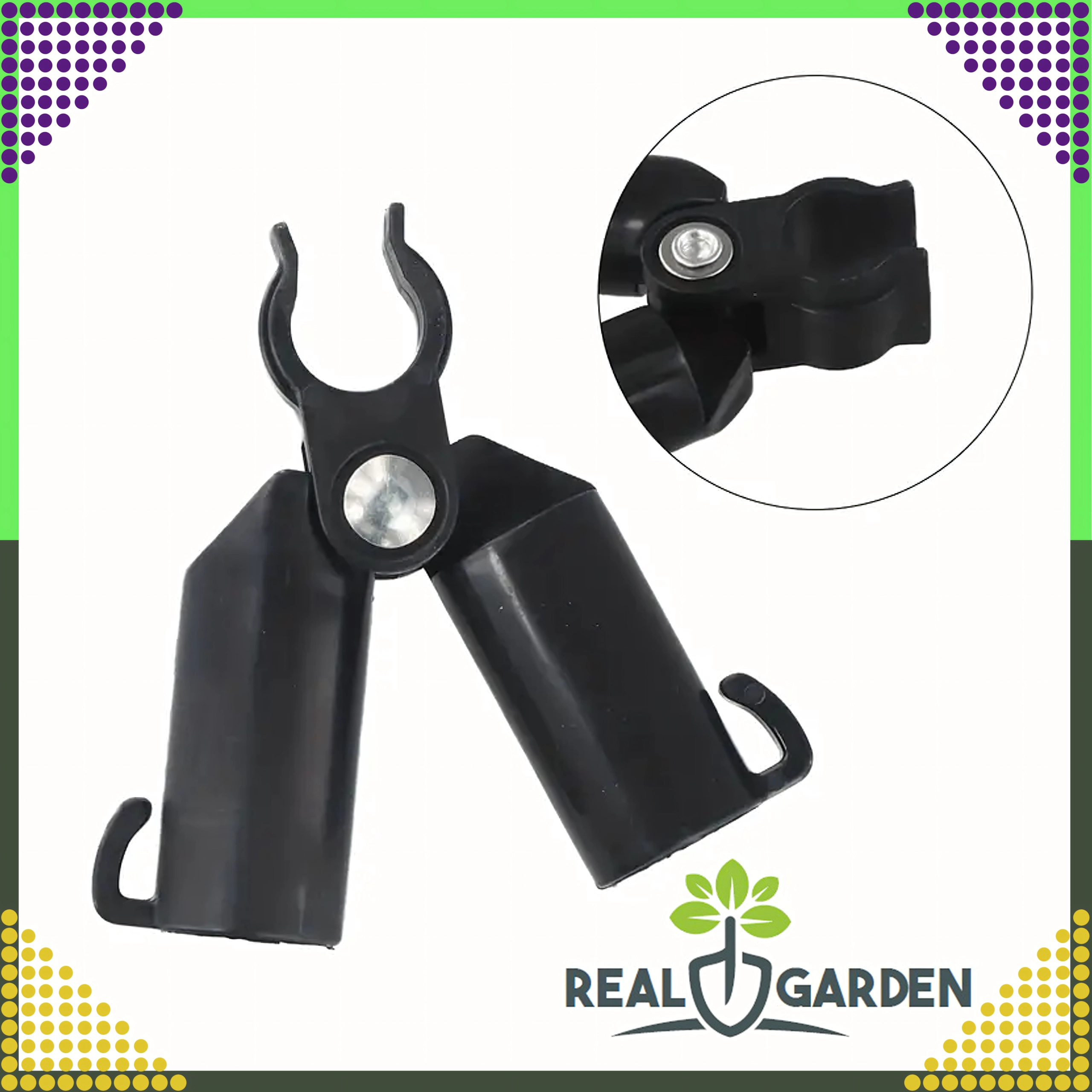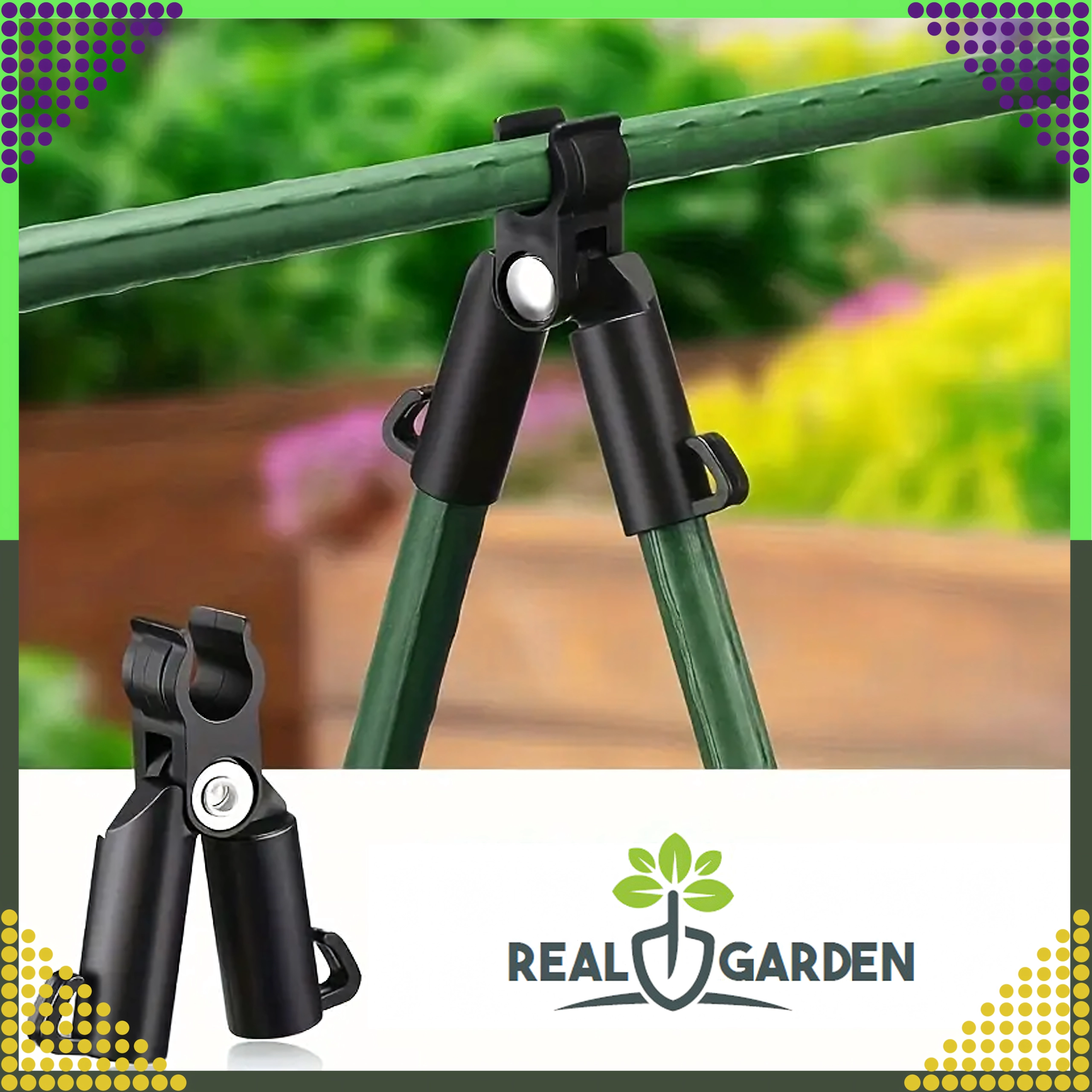 A Real Garden csúcsízületes T‑idom megkönnyíti keretek, A‑vázas szerkezetek és támaszok építését paradicsomhoz, babhoz vagy uborkához. A masszív műanyag és fém elemek kombinációjának köszönhetően stabil kapcsolatot biztosít 9 mm átmérőjű kerti pálcákhoz, és jól bírja a hosszan tartó kültéri használatot.