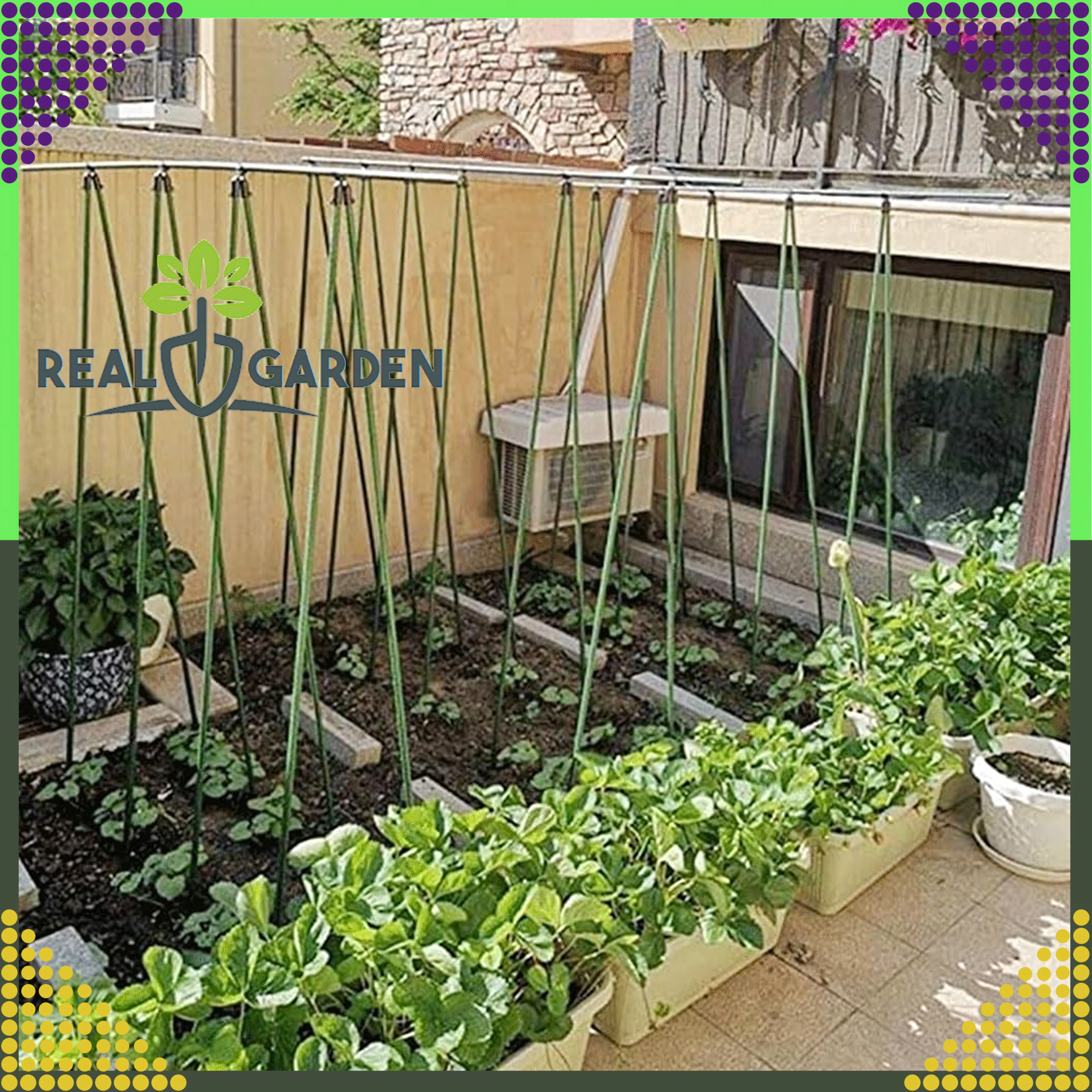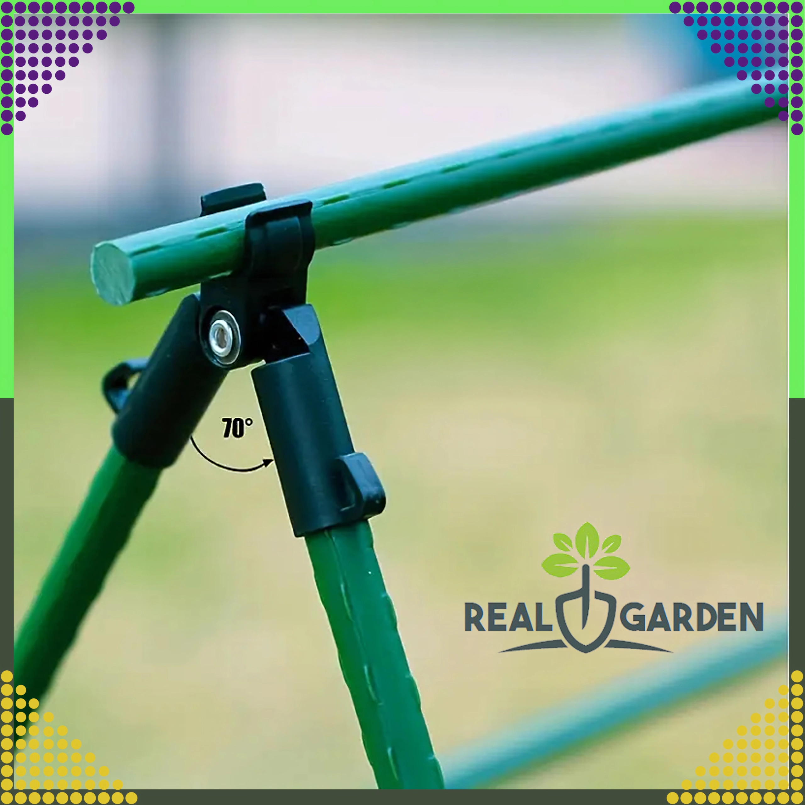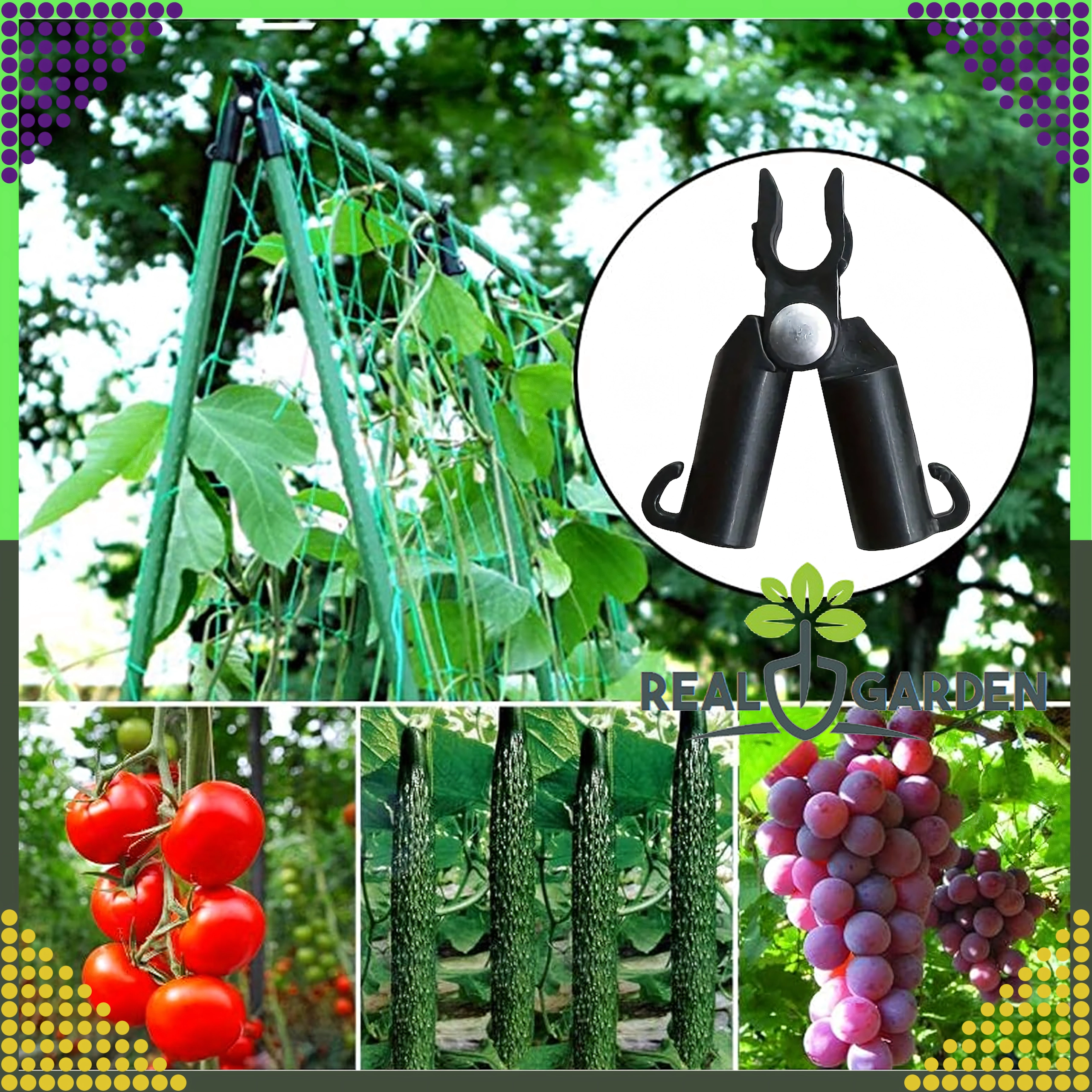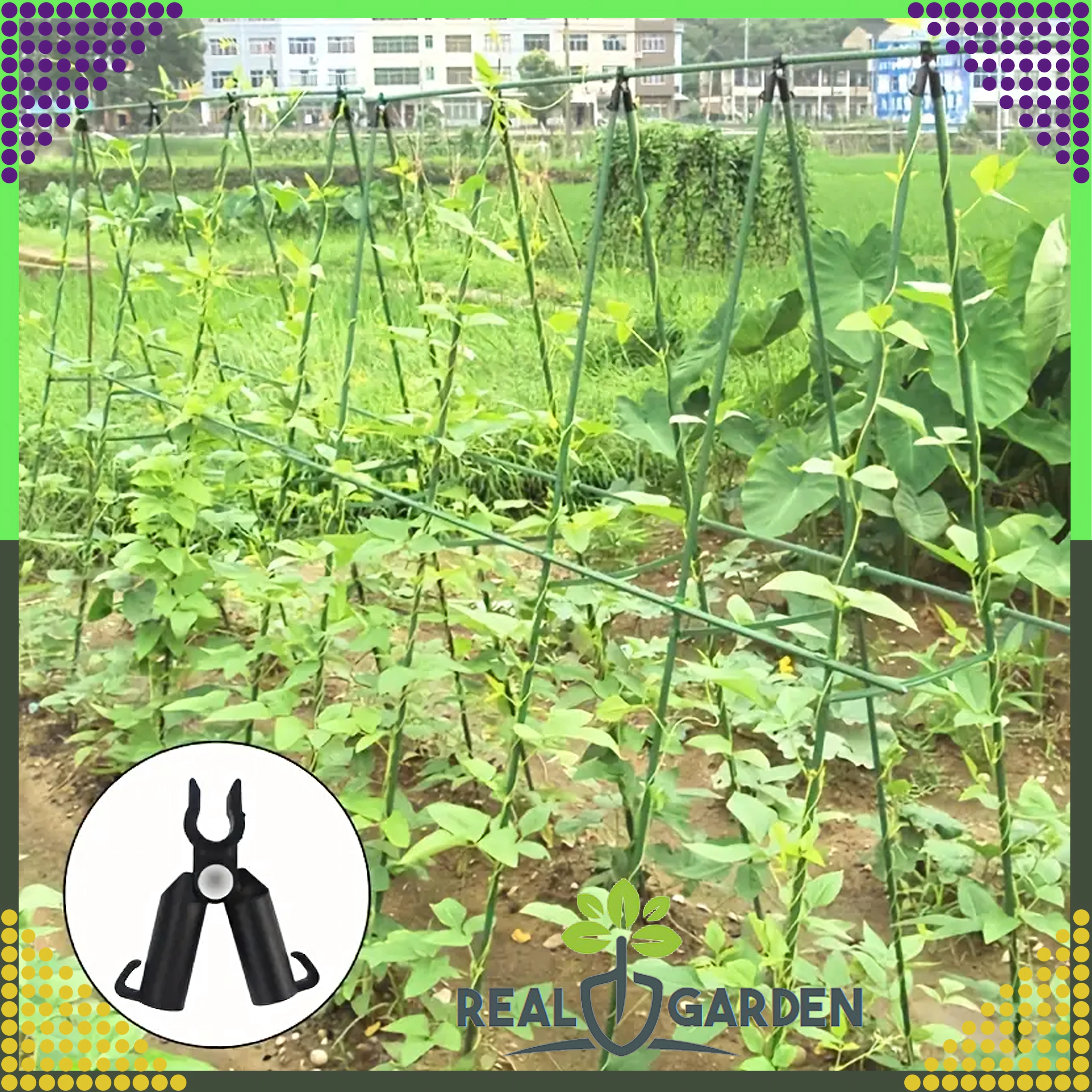 A Real Garden csúcsízületes T‑idom megkönnyíti keretek, A‑vázas szerkezetek és támaszok építését paradicsomhoz, babhoz vagy uborkához. A masszív műanyag és fém elemek kombinációjának köszönhetően stabil kapcsolatot biztosít 9 mm átmérőjű kerti pálcákhoz, és jól bírja a hosszan tartó kültéri használatot.