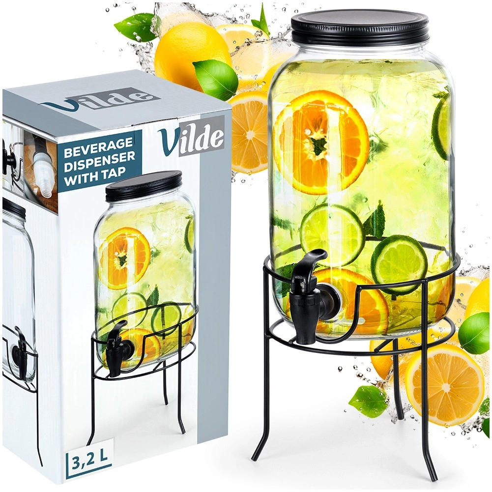 Stílusos üveg adagoló 3,2 l űrtartalommal, csavaros tetővel, csappal és masszív fém állvánnyal a kényelmes töltéshez. Ideális limonádékhoz, puncsokhoz, jeges teákhoz és gyümölcsös vízhez. Az átlátszó üveg szépen kiemeli a tartalmát, a stabil, lábakkal ellátott állvány pedig kényelmes használatot biztosít otthon, a kertben és ünnepségeken.