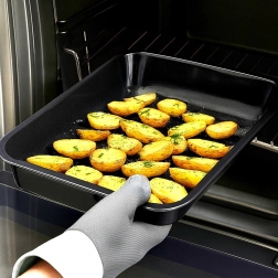 A magas peremnek köszönhetően ideális szaftos húsokhoz, rakott ételekhez, töltött pitékhez és burgonyához – kifolyás kockázata nélkül. Univerzális mérete a legtöbb háztartási sütőhöz illeszkedik, és megbízható teljesítményt nyújt a mindennapi sütéshez.