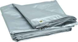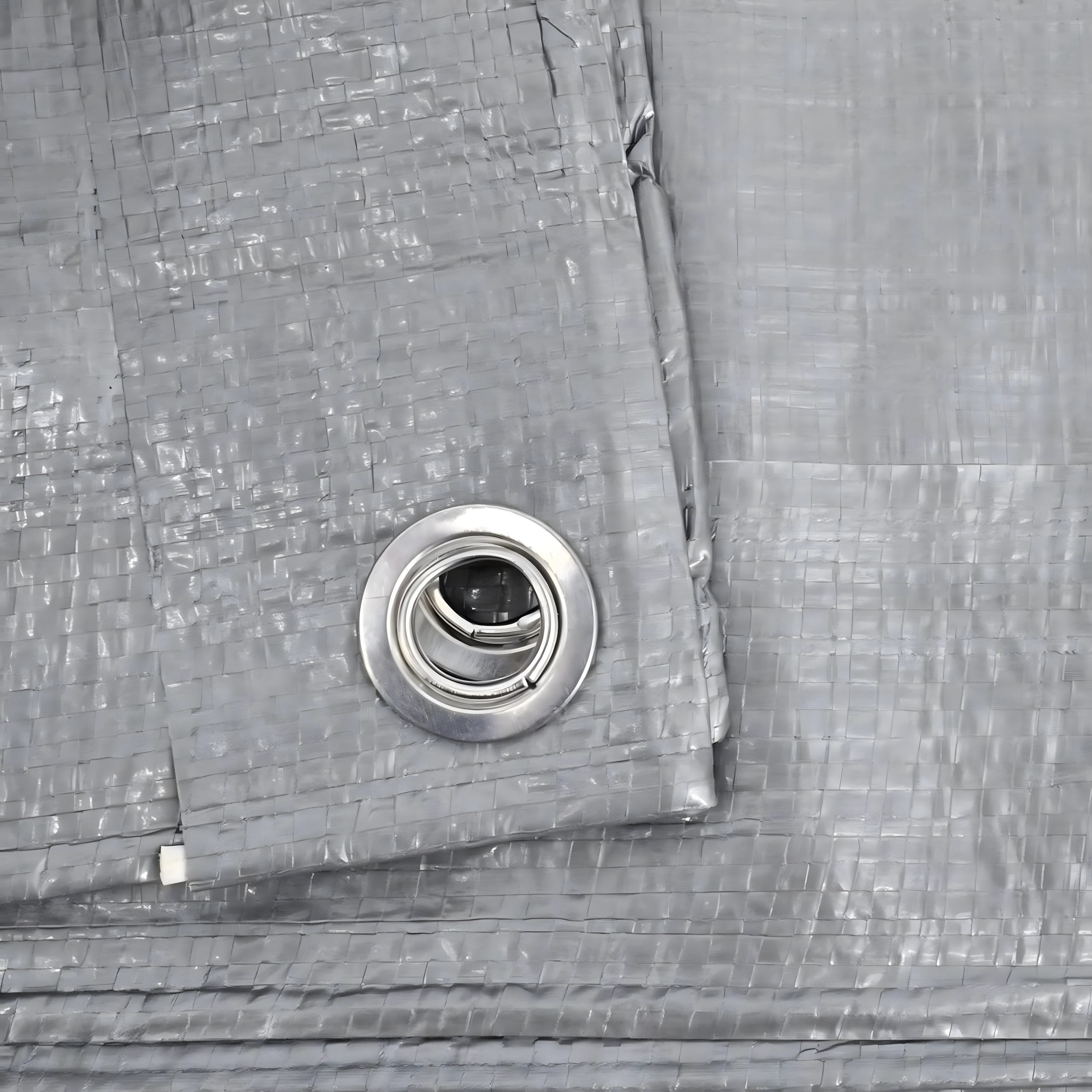 A kerület mentén elhelyezett fém ringlik lehetővé teszik a biztonságos kifeszítést és a rögzítést keretekhez, cövekekhez vagy rakományhoz. Az ezüst szín segít visszaverni a napsugarakat és csökkenteni a letakart tárgyak túlmelegedését.