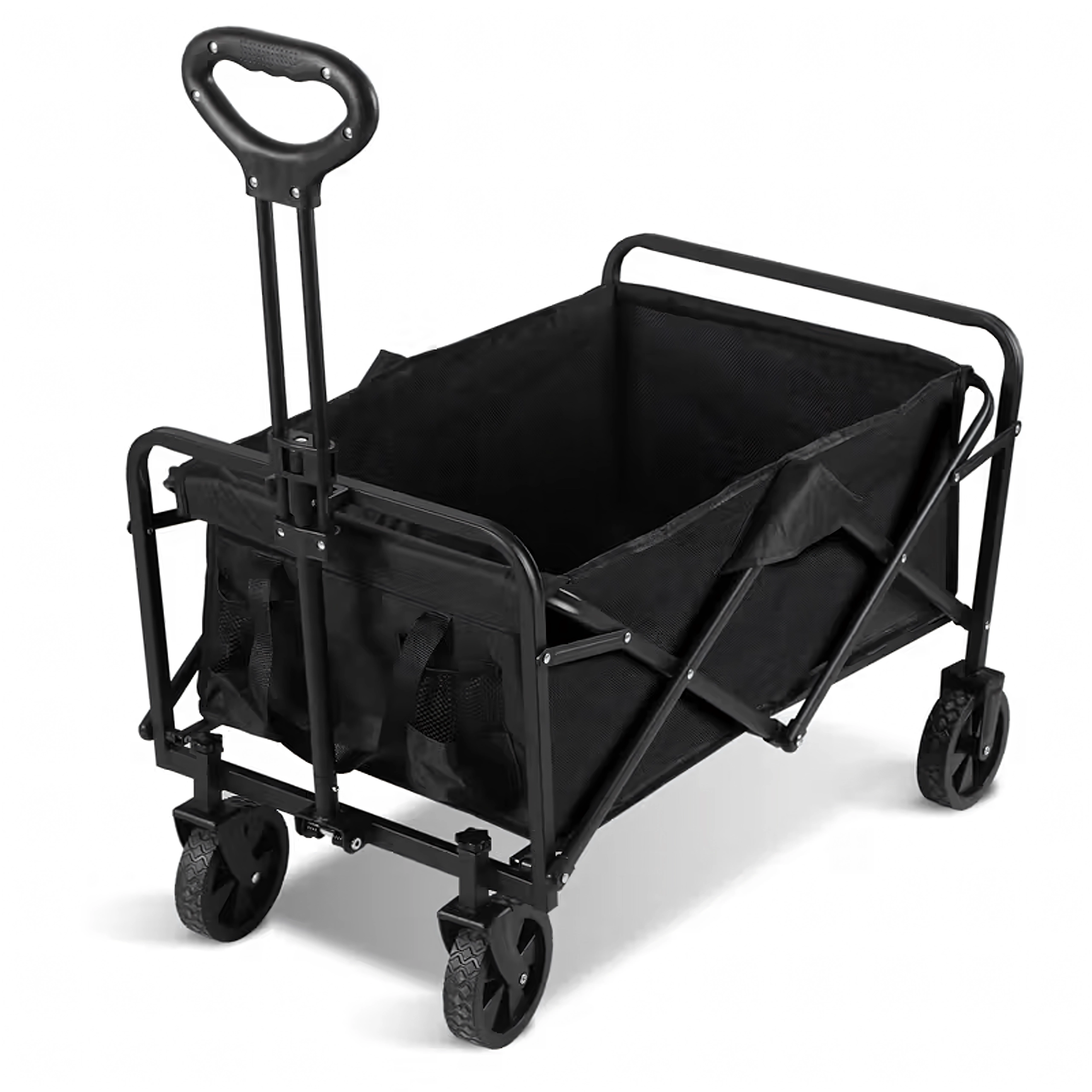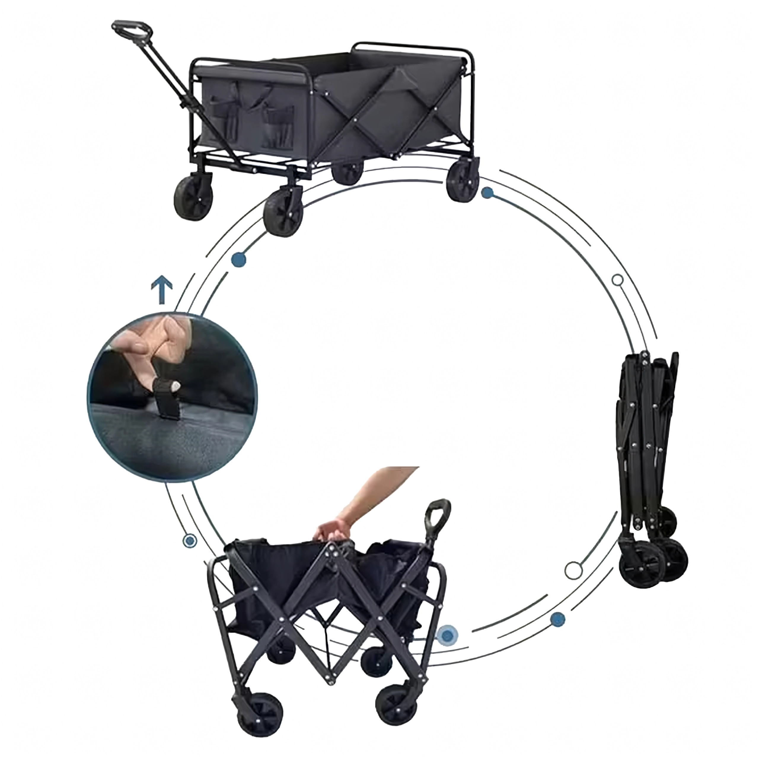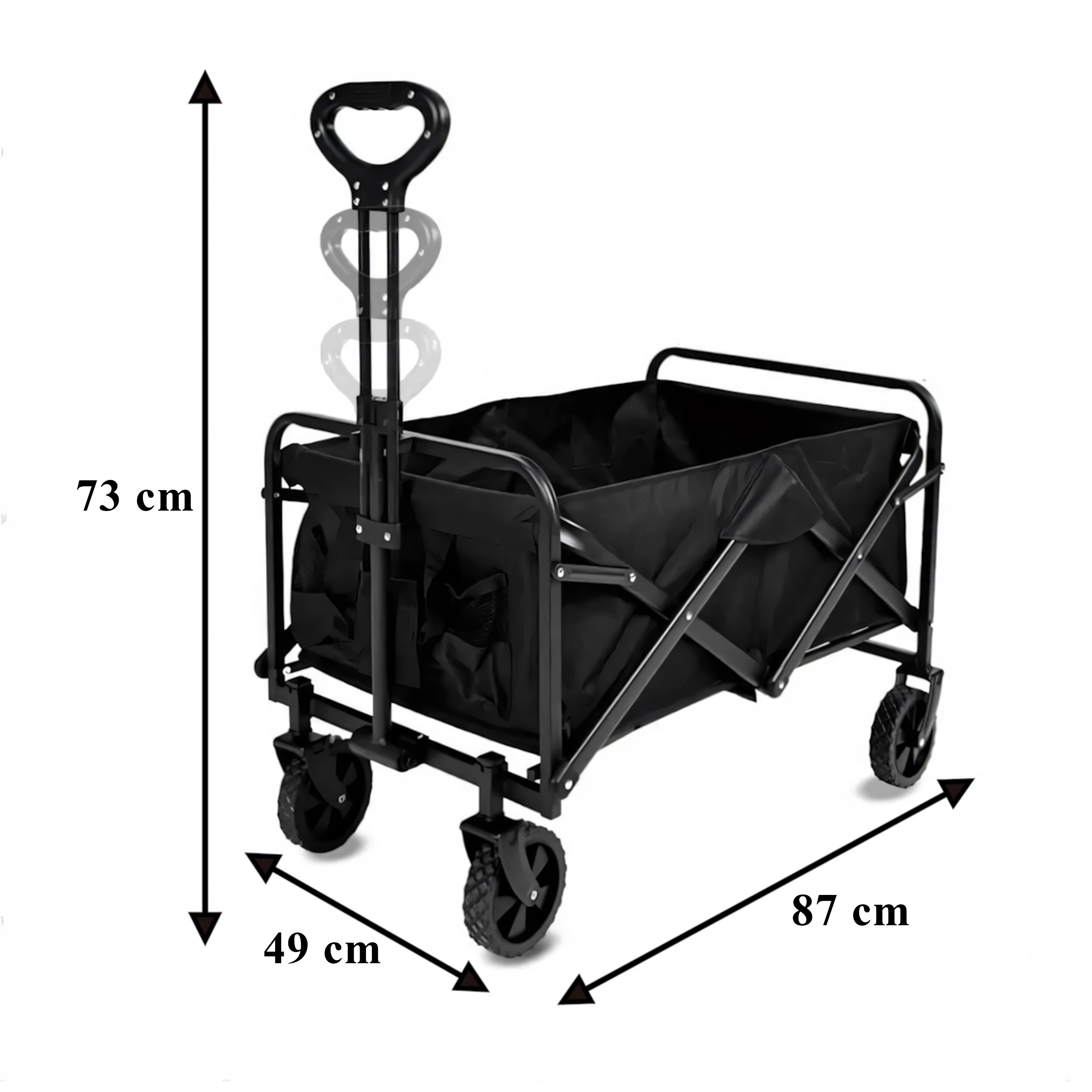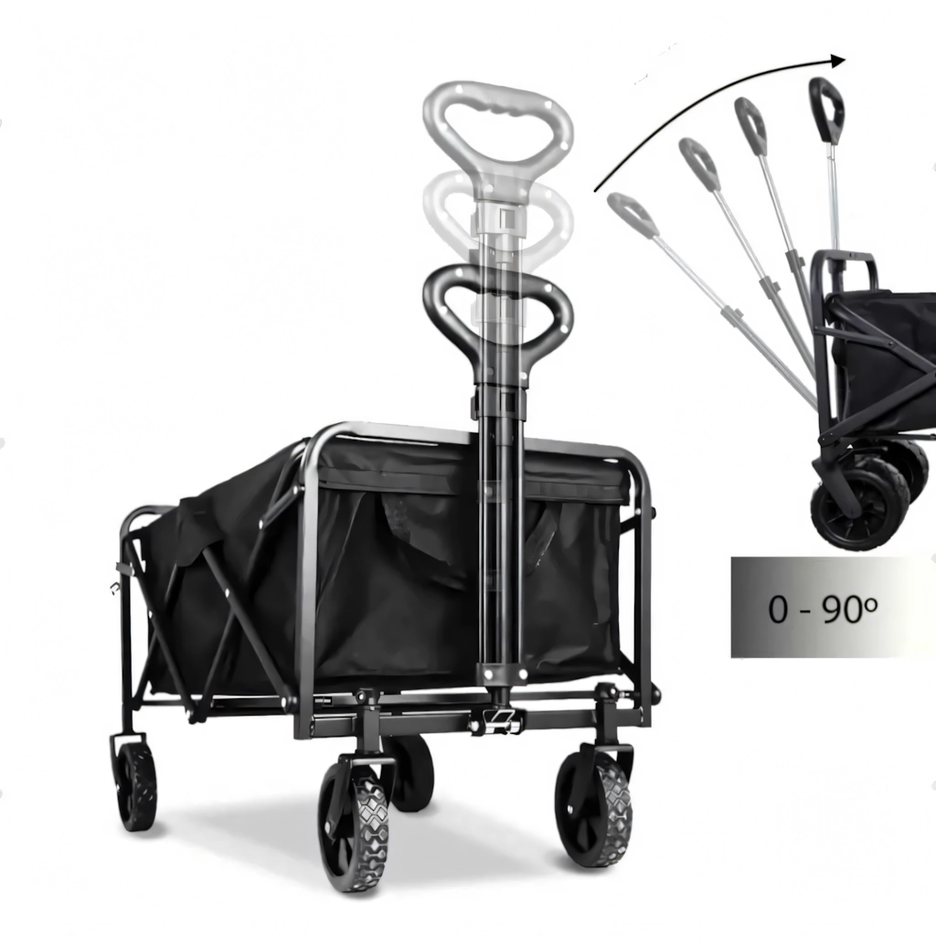 Használat után a kocsi néhány másodperc alatt kompakt méretre hajtható, és elhelyezhető az autó csomagtartójában vagy a szekrényben. A praktikus oldalzsebek kéznél tartják az apróságokat, a teleszkópos fogantyú megkönnyíti a húzást, a stabil szerkezet pedig terhelés alatt is tartja a formáját.