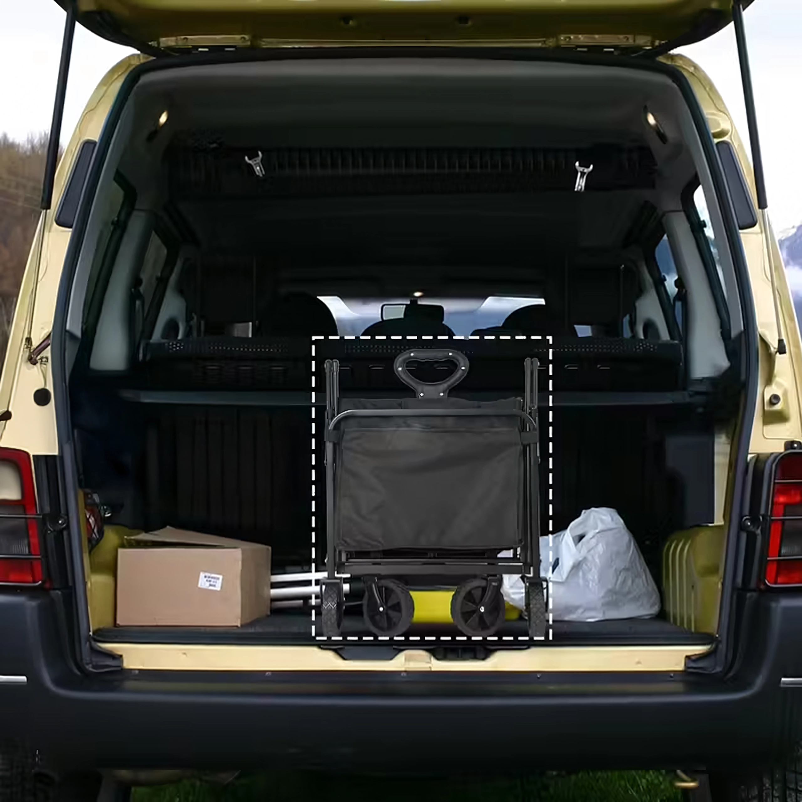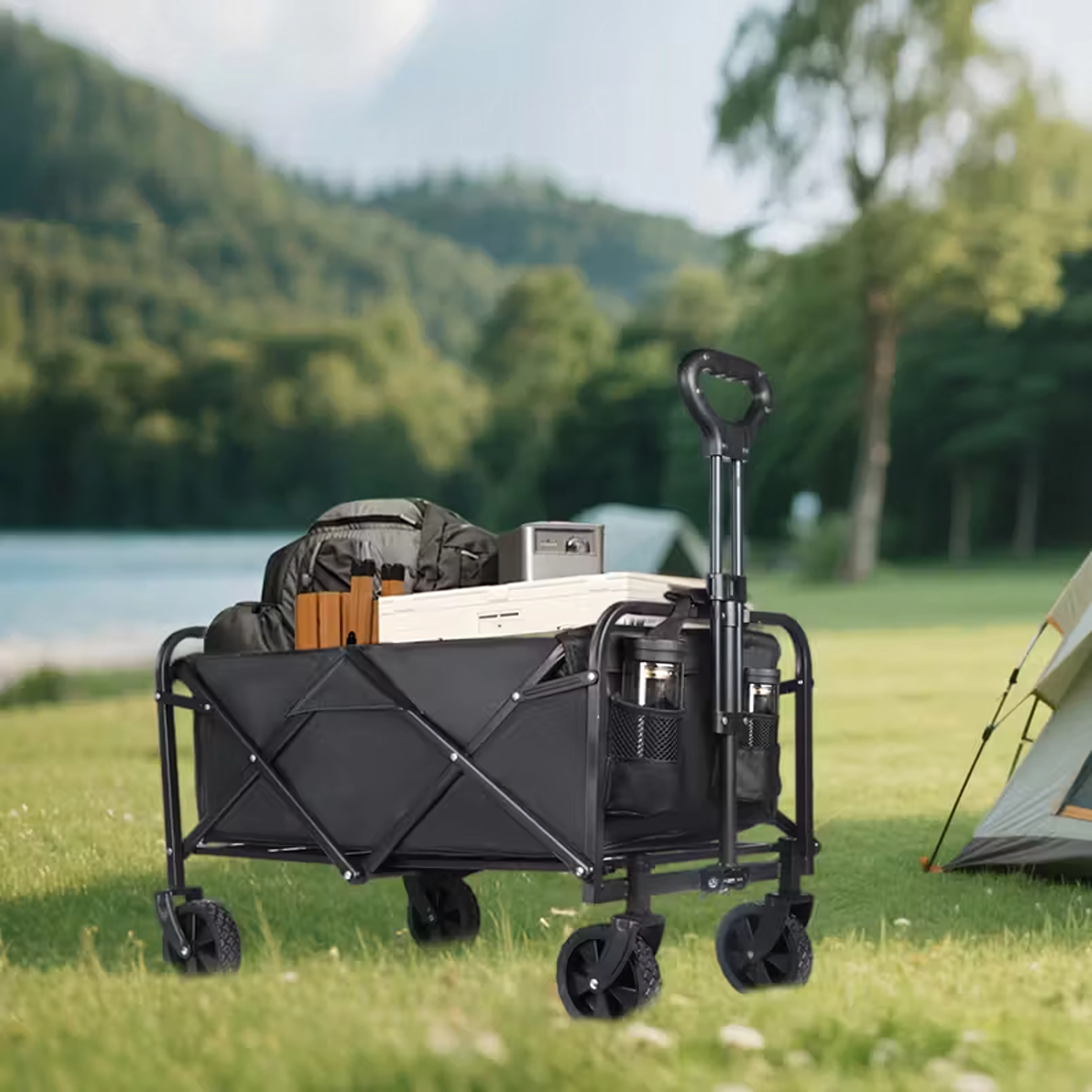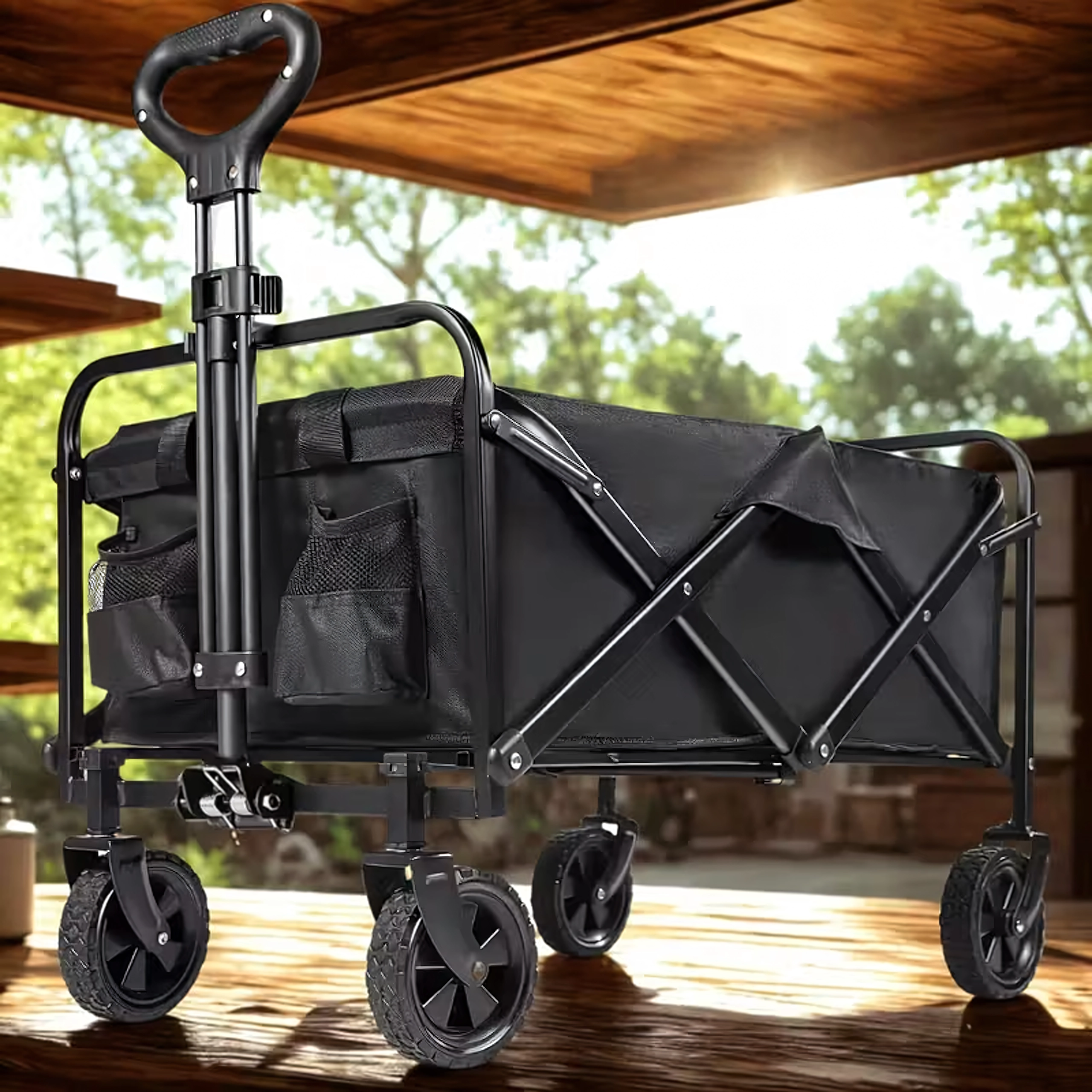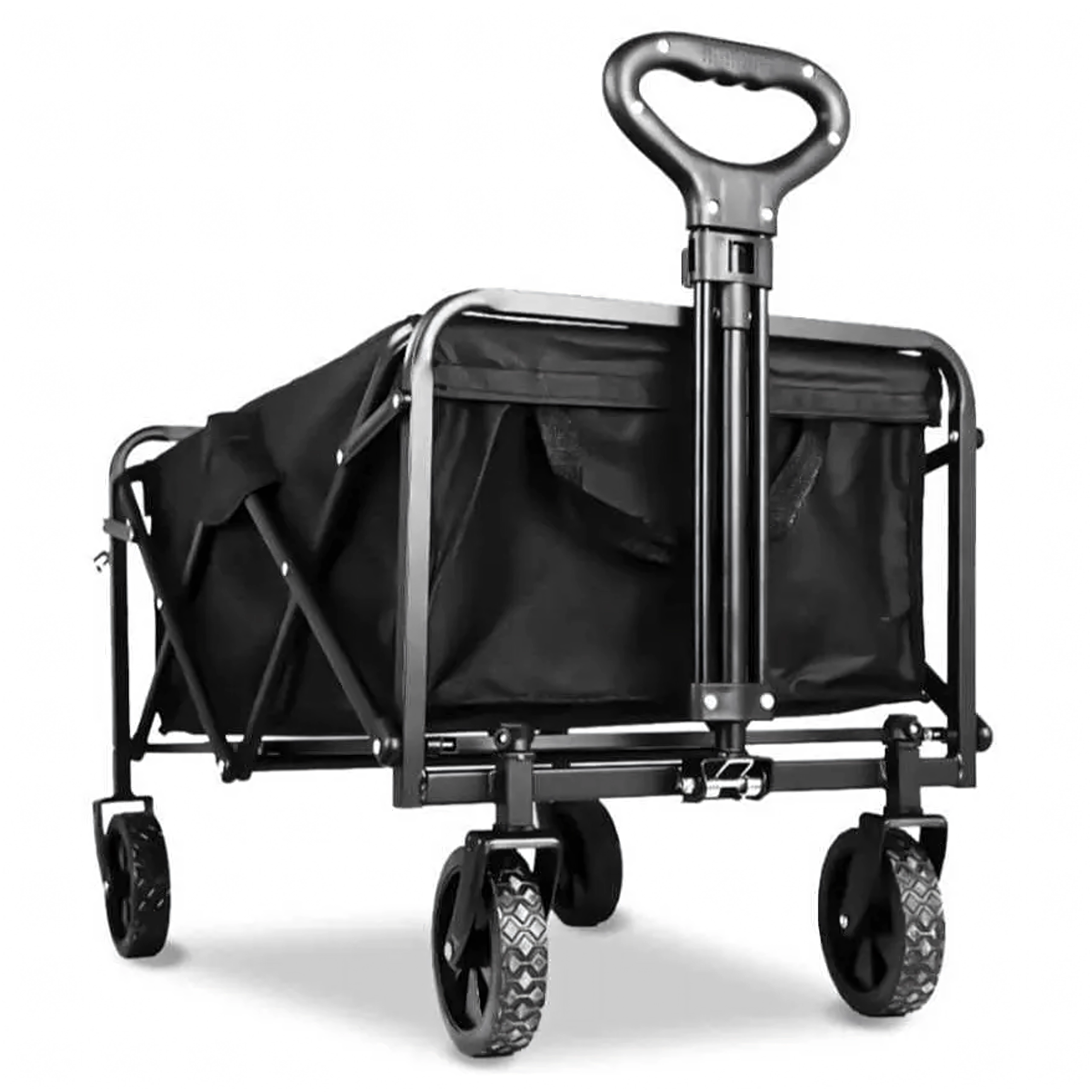 Használat után a kocsi néhány másodperc alatt kompakt méretre hajtható, és elhelyezhető az autó csomagtartójában vagy a szekrényben. A praktikus oldalzsebek kéznél tartják az apróságokat, a teleszkópos fogantyú megkönnyíti a húzást, a stabil szerkezet pedig terhelés alatt is tartja a formáját.