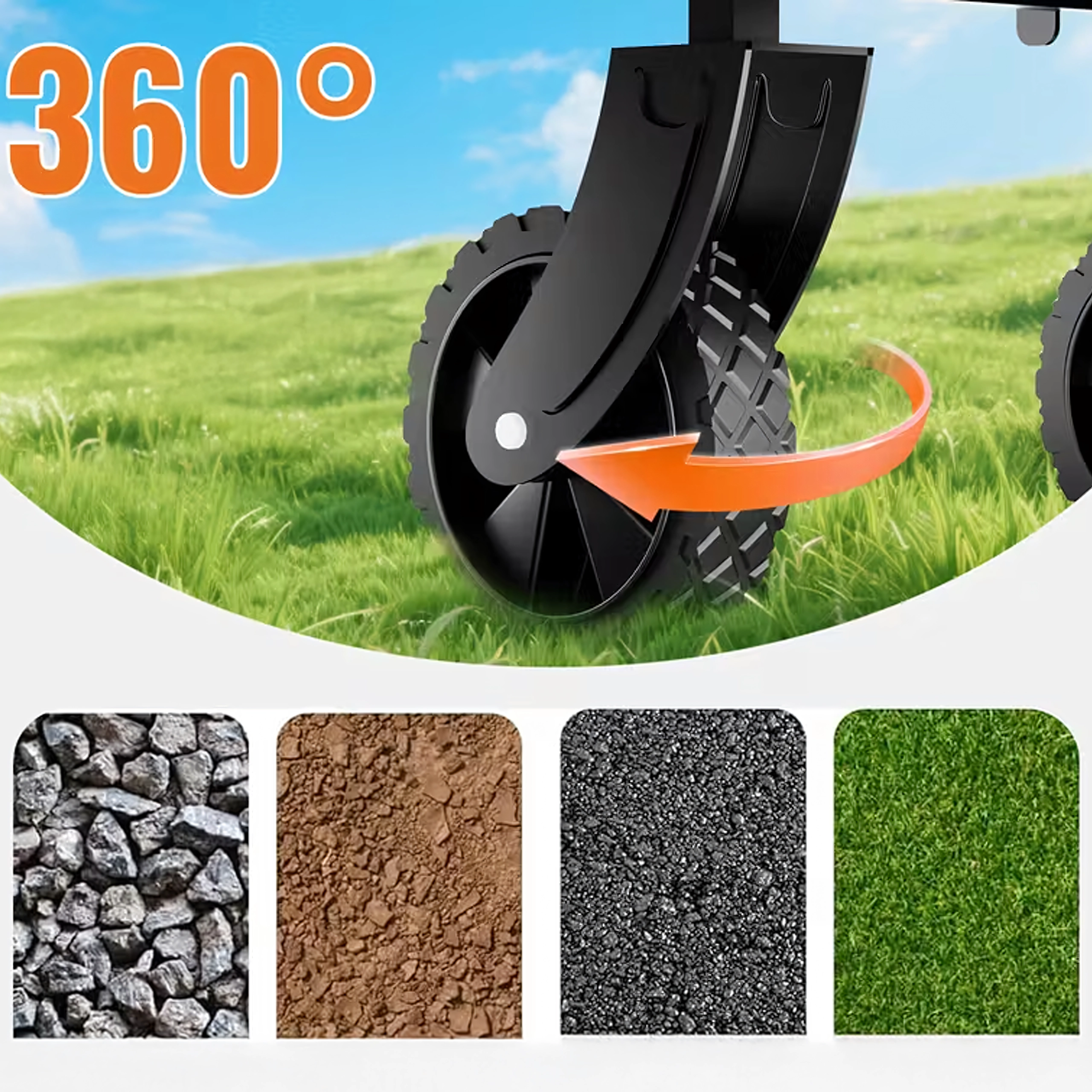 Nagy, forgó kerekek, amelyek megbirkóznak a gyepfelülettel, kaviccsal és homokkal is. A kocsi könnyen manőverezhető szűk ösvényeken és a kempingben.