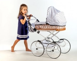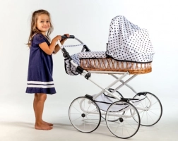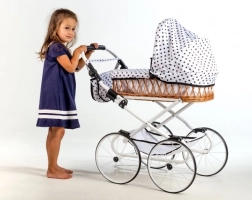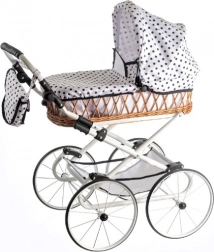 Ajándékozza meg a gyerekeket a klasszikus stílus varázsával a Monika retro babakocsival. A fonott mózeskosár fehér vázzal és játékos pöttyös mintával elegáns és időtálló megjelenést kölcsönöz. A babakocsi könnyű, stabil és átgondolt kialakítású a kényelmes, mindennapi játékhoz.