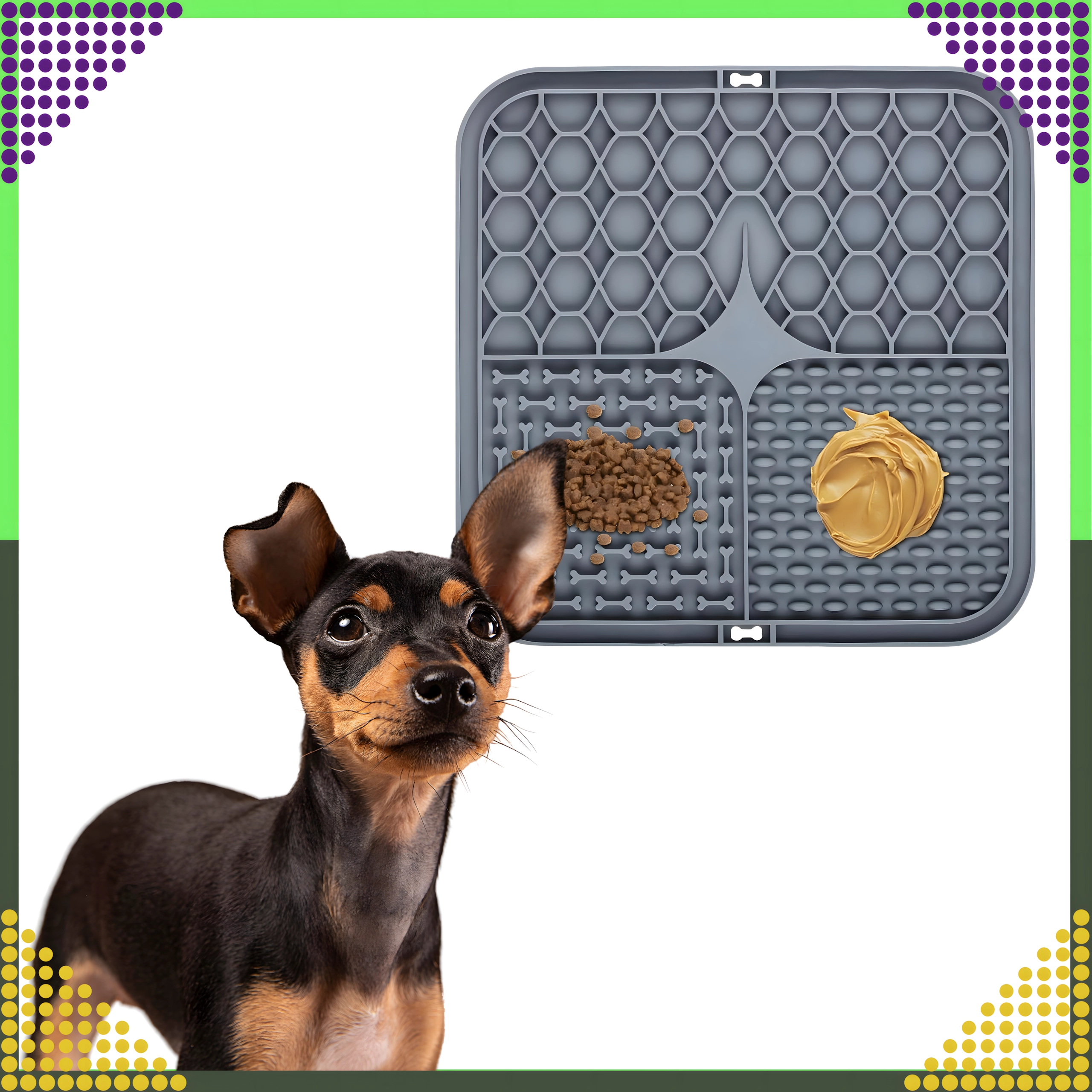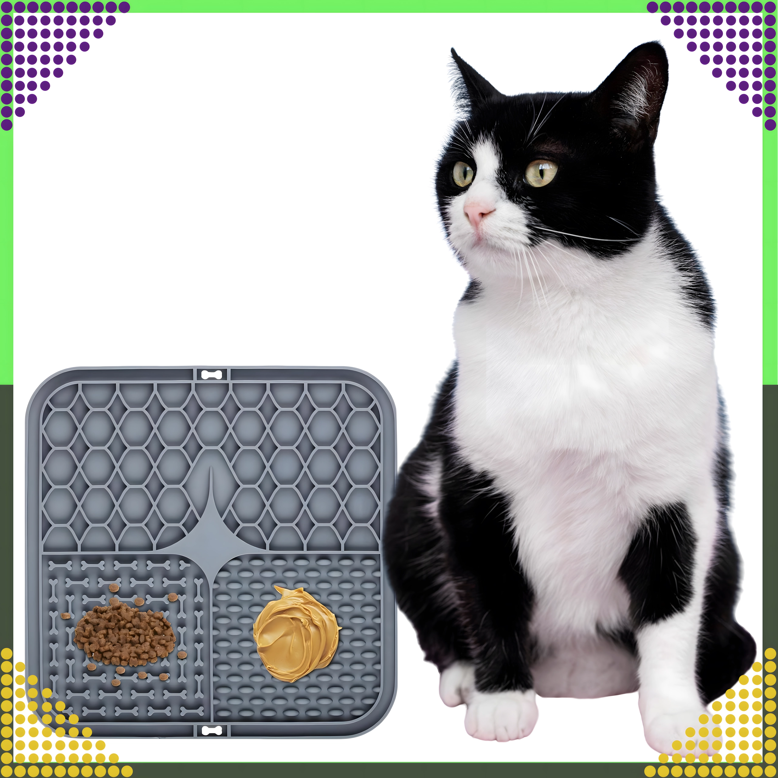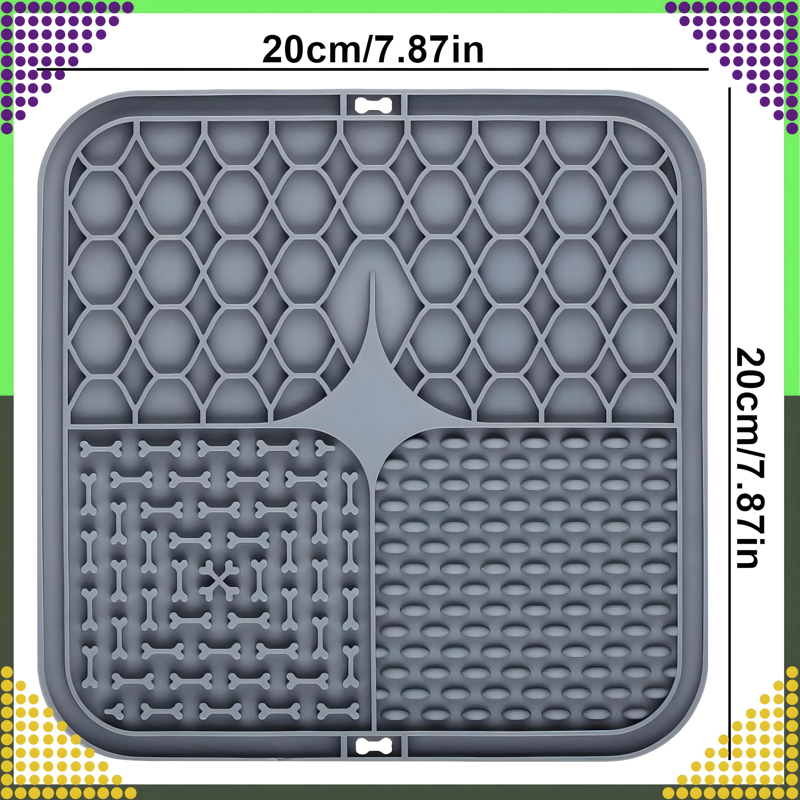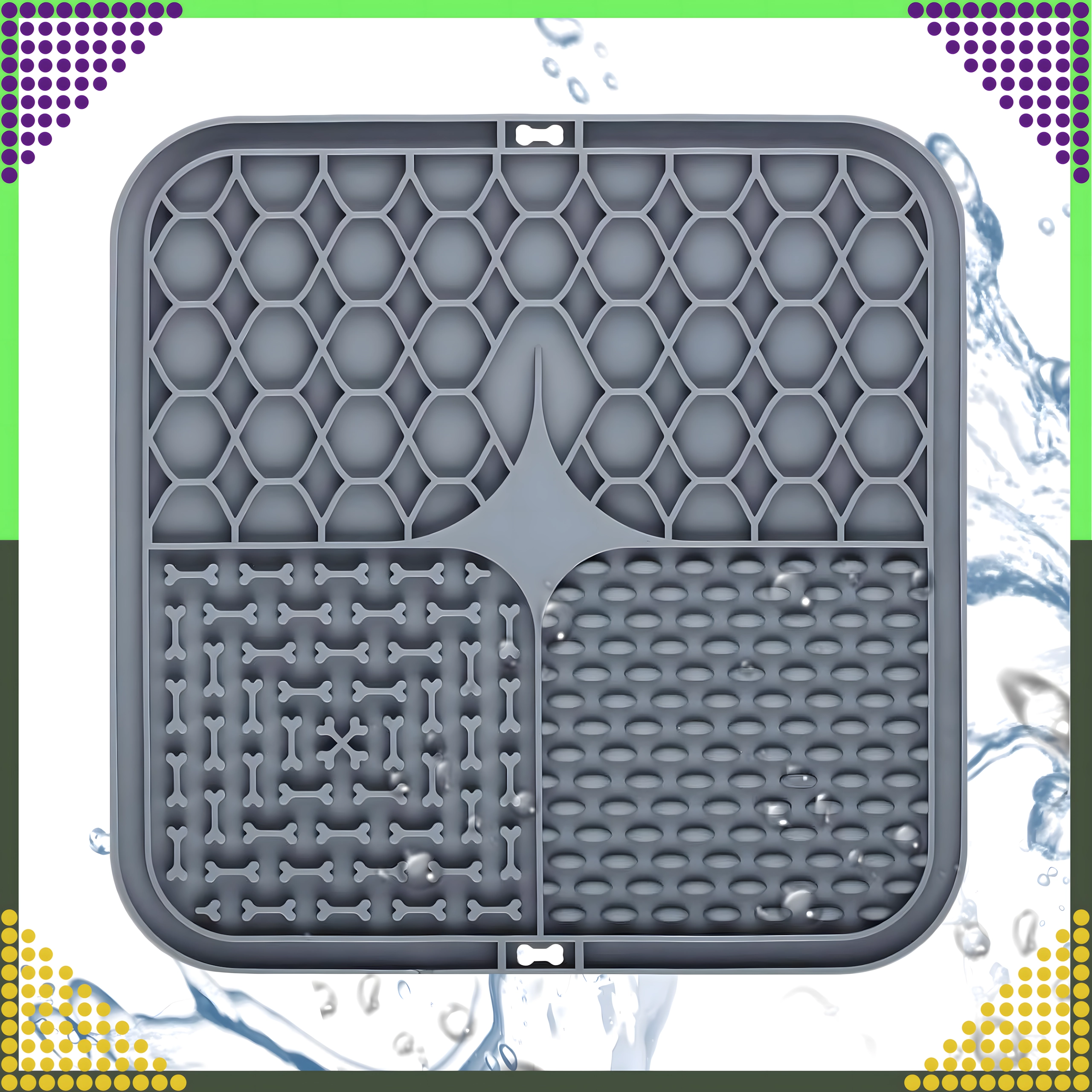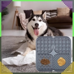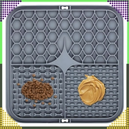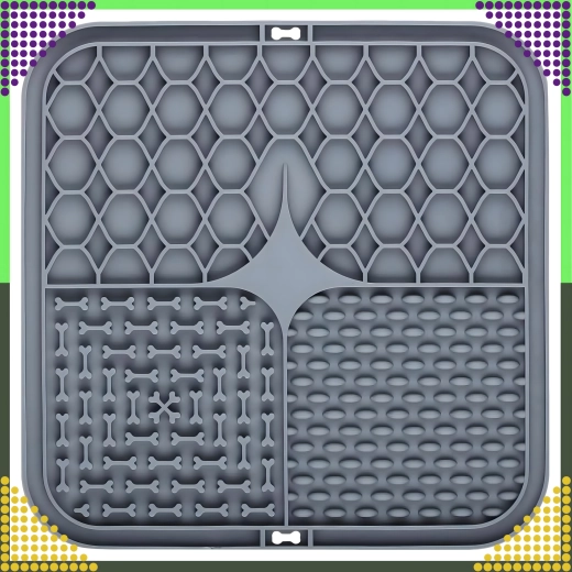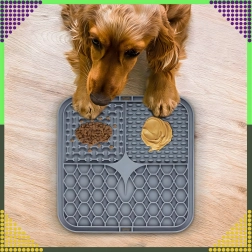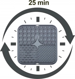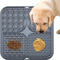 A hátoldal csúszásgátló tapadókorongjai szilárdan a helyén tartják az alátétet a padlón vagy függőleges felületen (pl. a fürdőszobában fürdetéskor). Az alátét puha, könnyen tisztítható szilikonból készül, ideális az etetés lassítására, valamint figyelemelterelésre szőrápoláskor vagy állatorvosi látogatáskor.