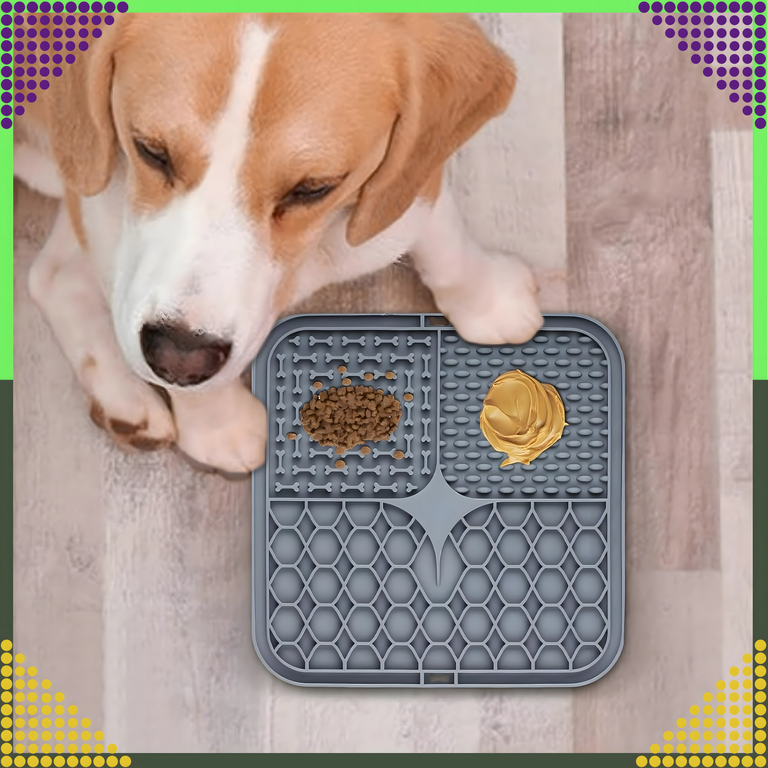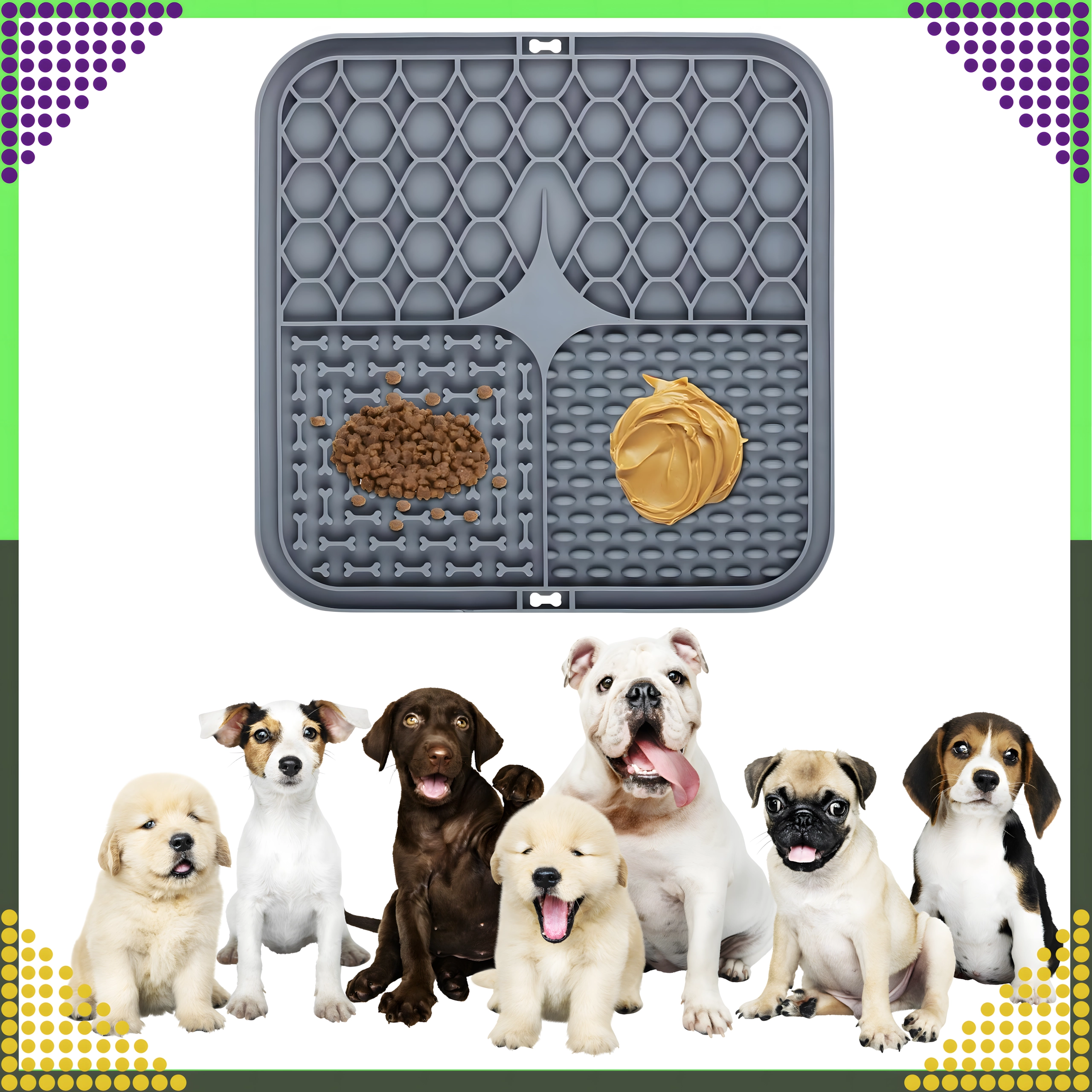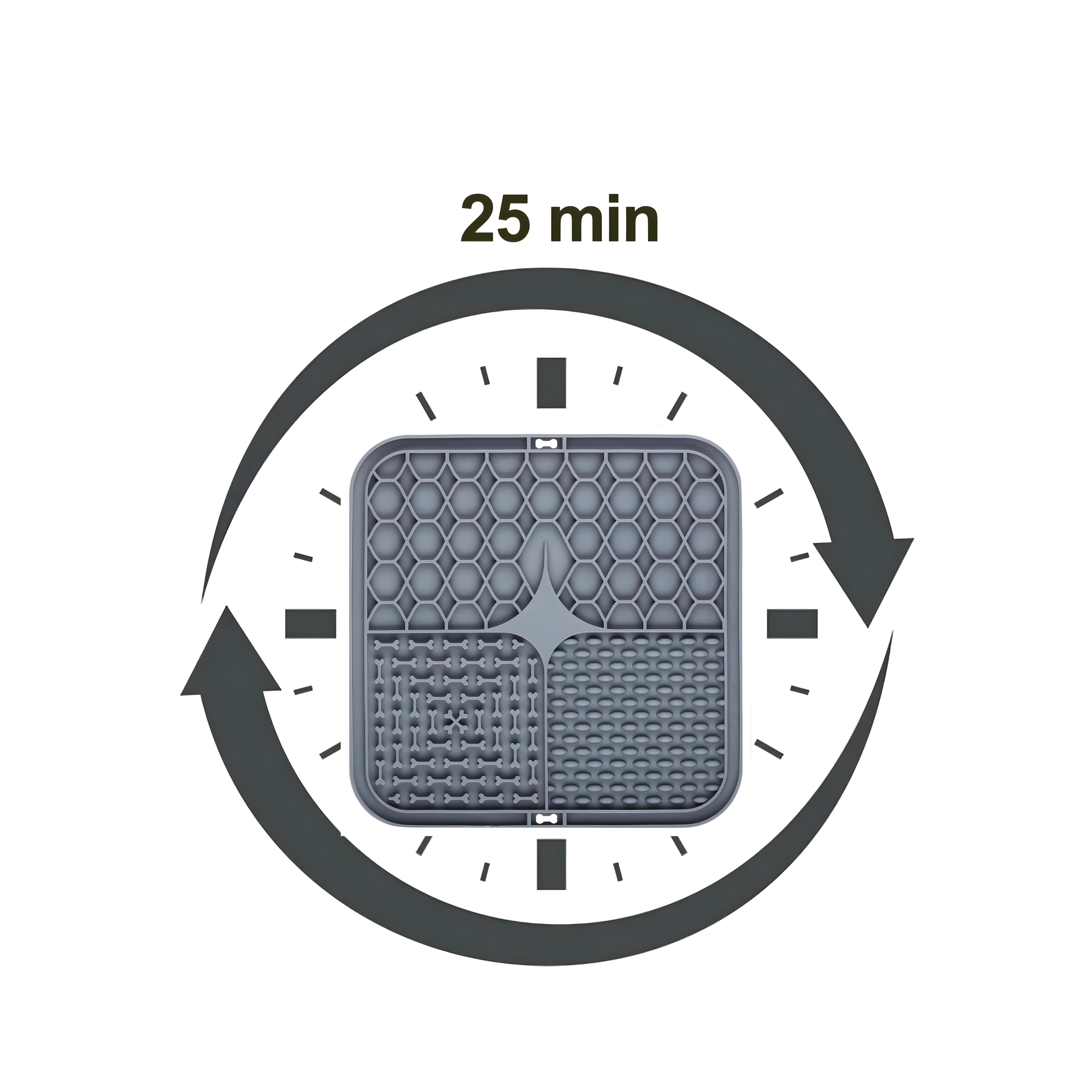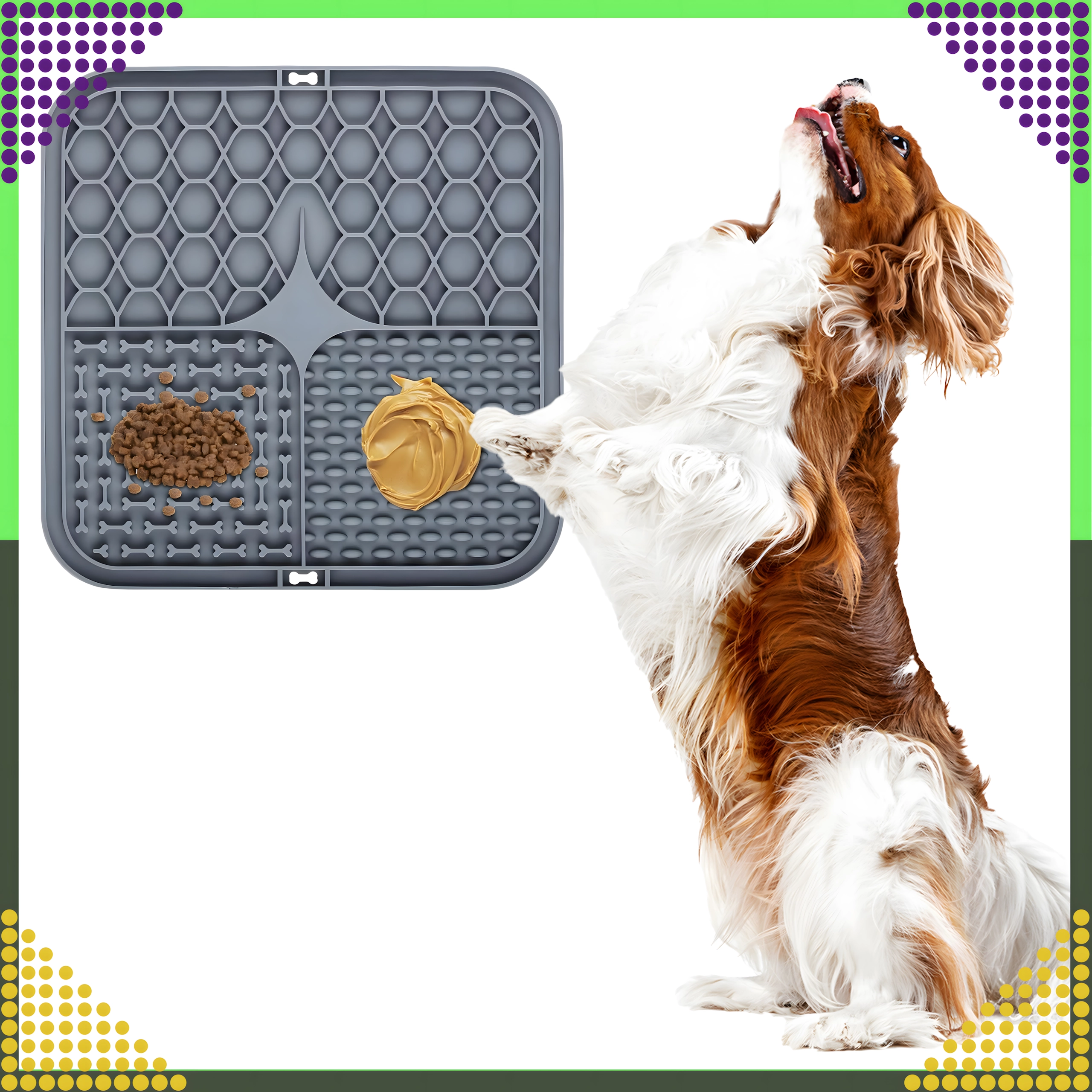 A hátoldal csúszásgátló tapadókorongjai szilárdan a helyén tartják az alátétet a padlón vagy függőleges felületen (pl. a fürdőszobában fürdetéskor). Az alátét puha, könnyen tisztítható szilikonból készül, ideális az etetés lassítására, valamint figyelemelterelésre szőrápoláskor vagy állatorvosi látogatáskor.