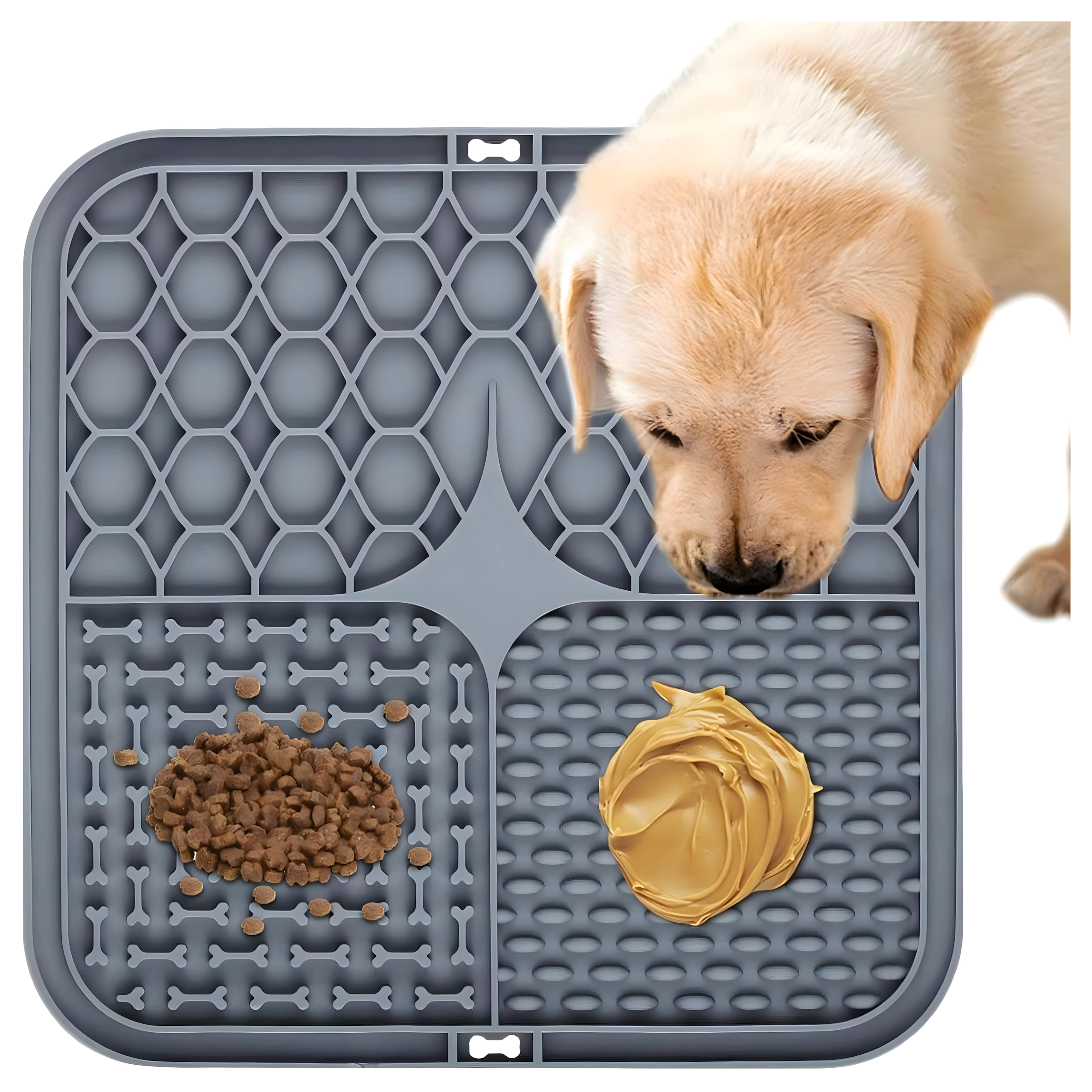 Ez a stresszcsökkentő nyalogató alátét lehetővé teszi a nedves eledel, pástétom vagy mogyoróvaj elkenését úgy, hogy a kedvenc fokozatosan nyalogassa le. A különböző dombornyomott zónák serkentik a természetes nyalogatási ösztönt, így megnyugtatnak, és egyben támogatják a szájhigiéniát a nyelv kíméletes tisztításával.