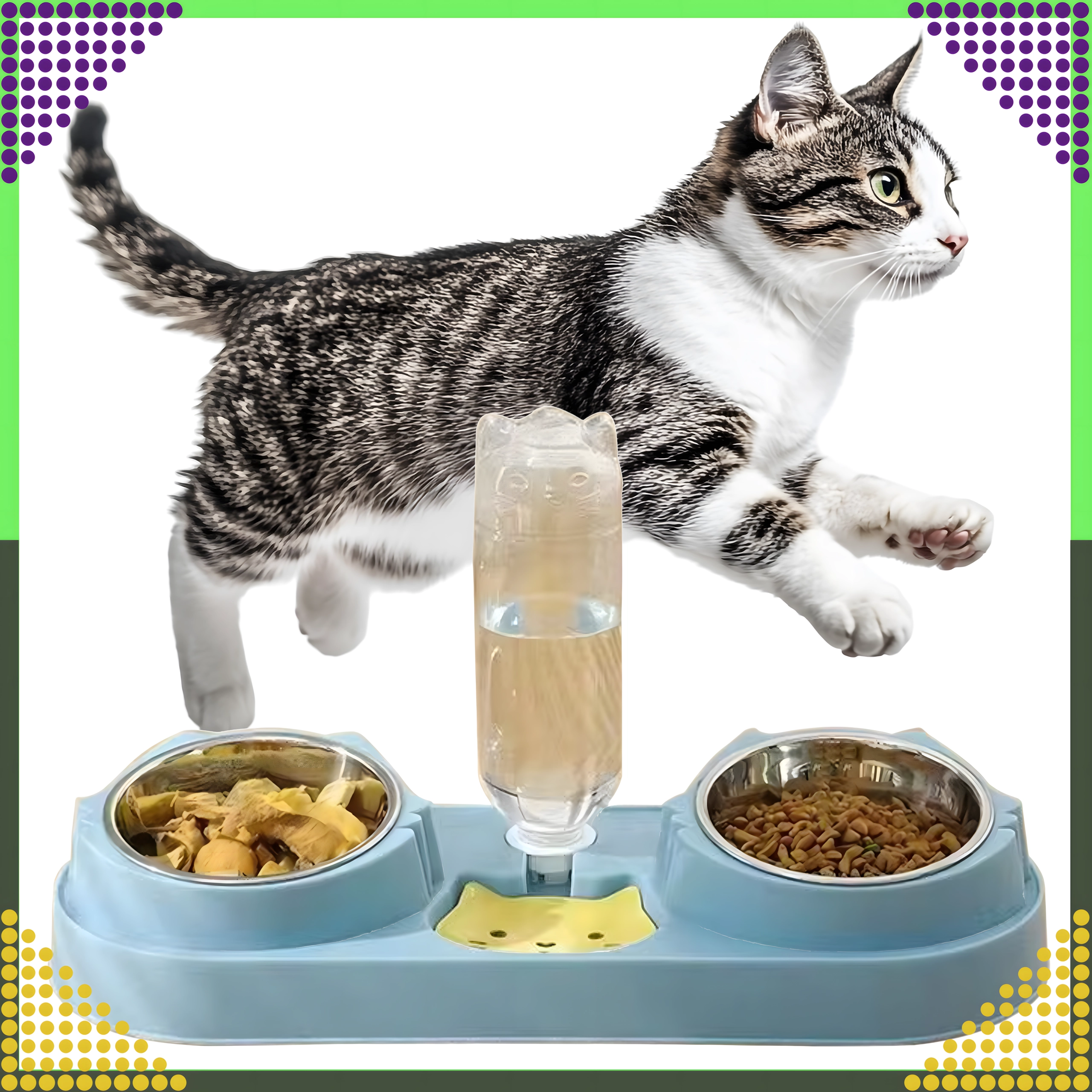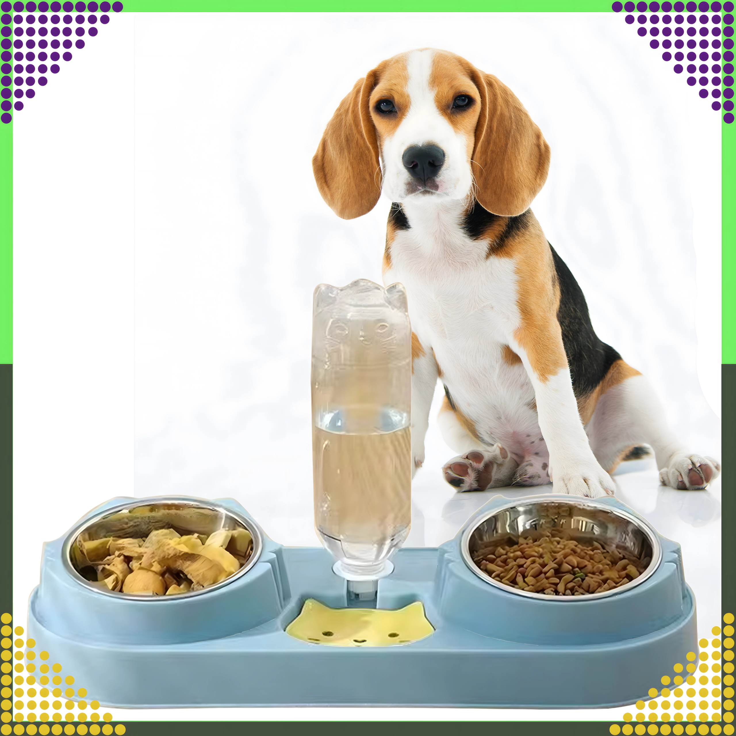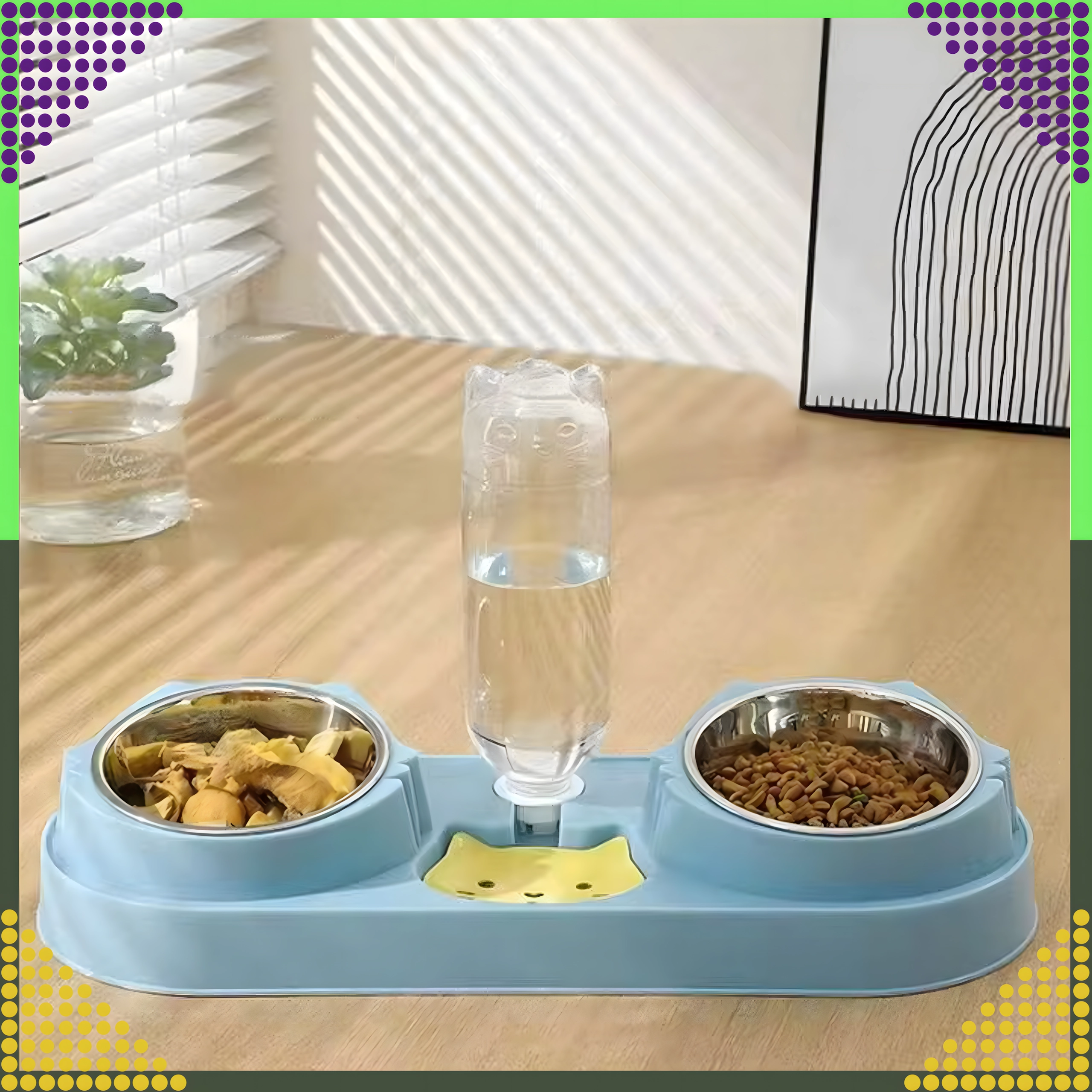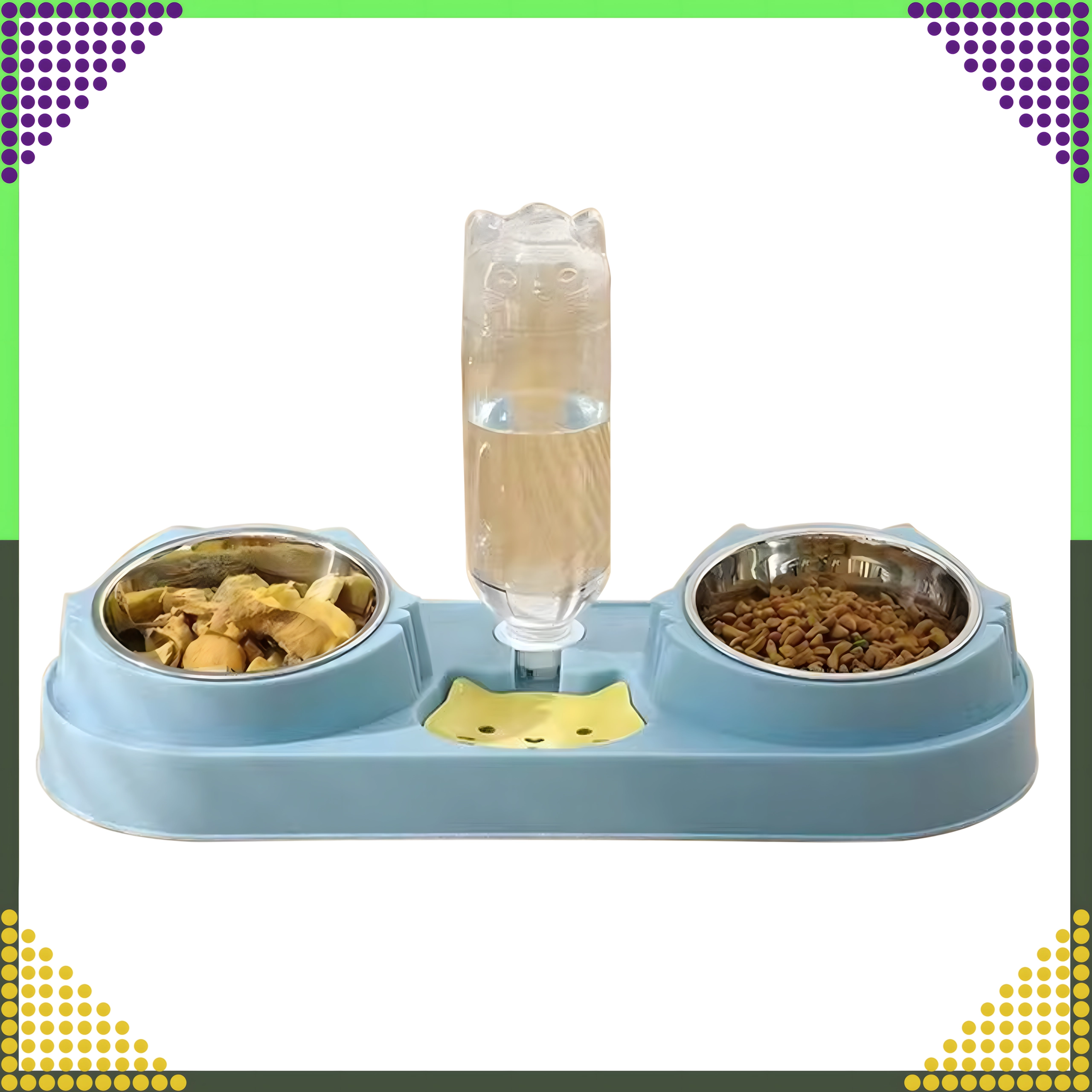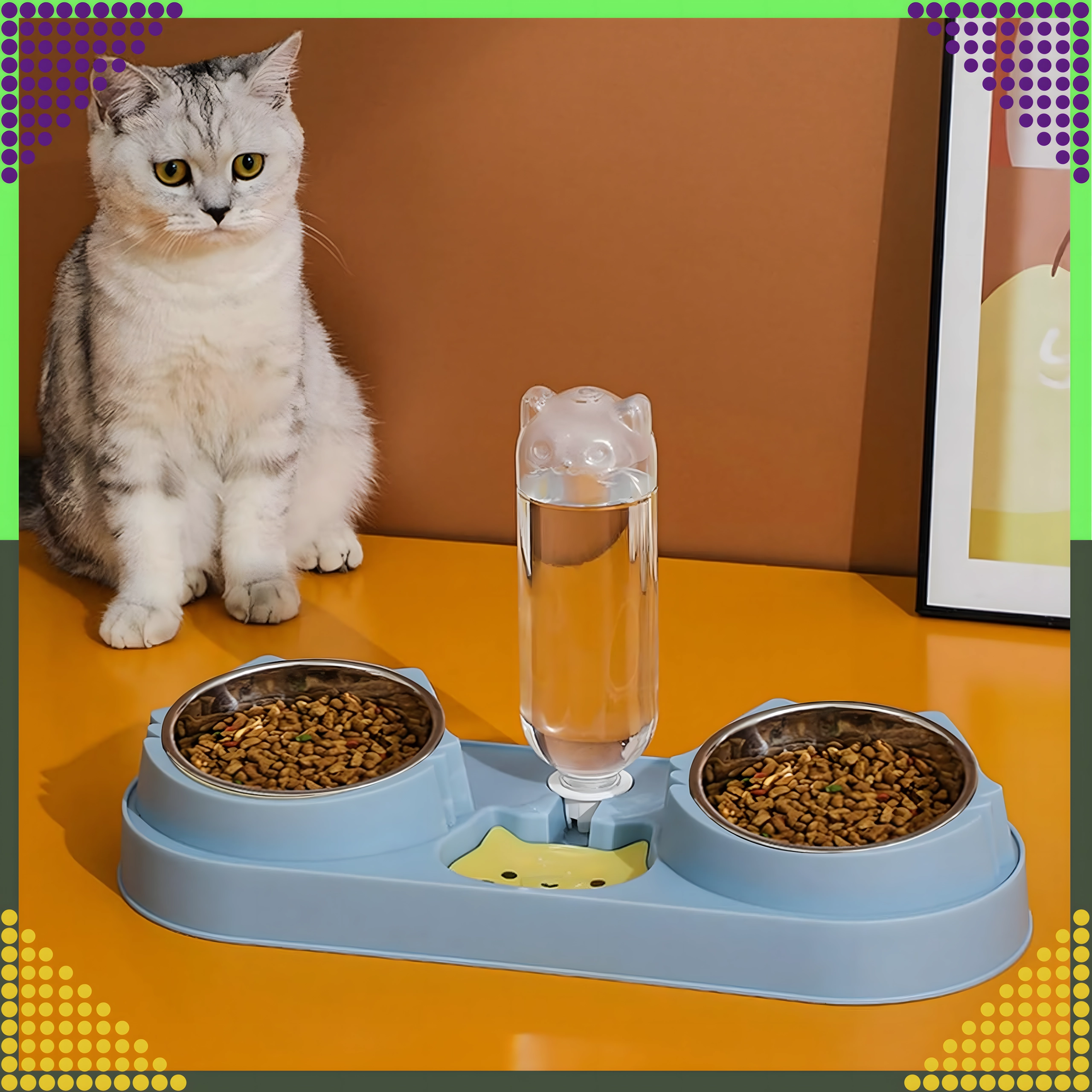 Praktikus kettős etetőtál házi kedvenceknek, integrált vízadagolóval, amely biztosítja az egyszerre történő etetést és friss vízellátást. A kivehető rozsdamentes tálak megkönnyítik a gyors tisztítást, a stabil alap megakadályozza a felborulást, a gravitációs itató pedig tisztán és elérhetően tartja a vizet távollétedben is.