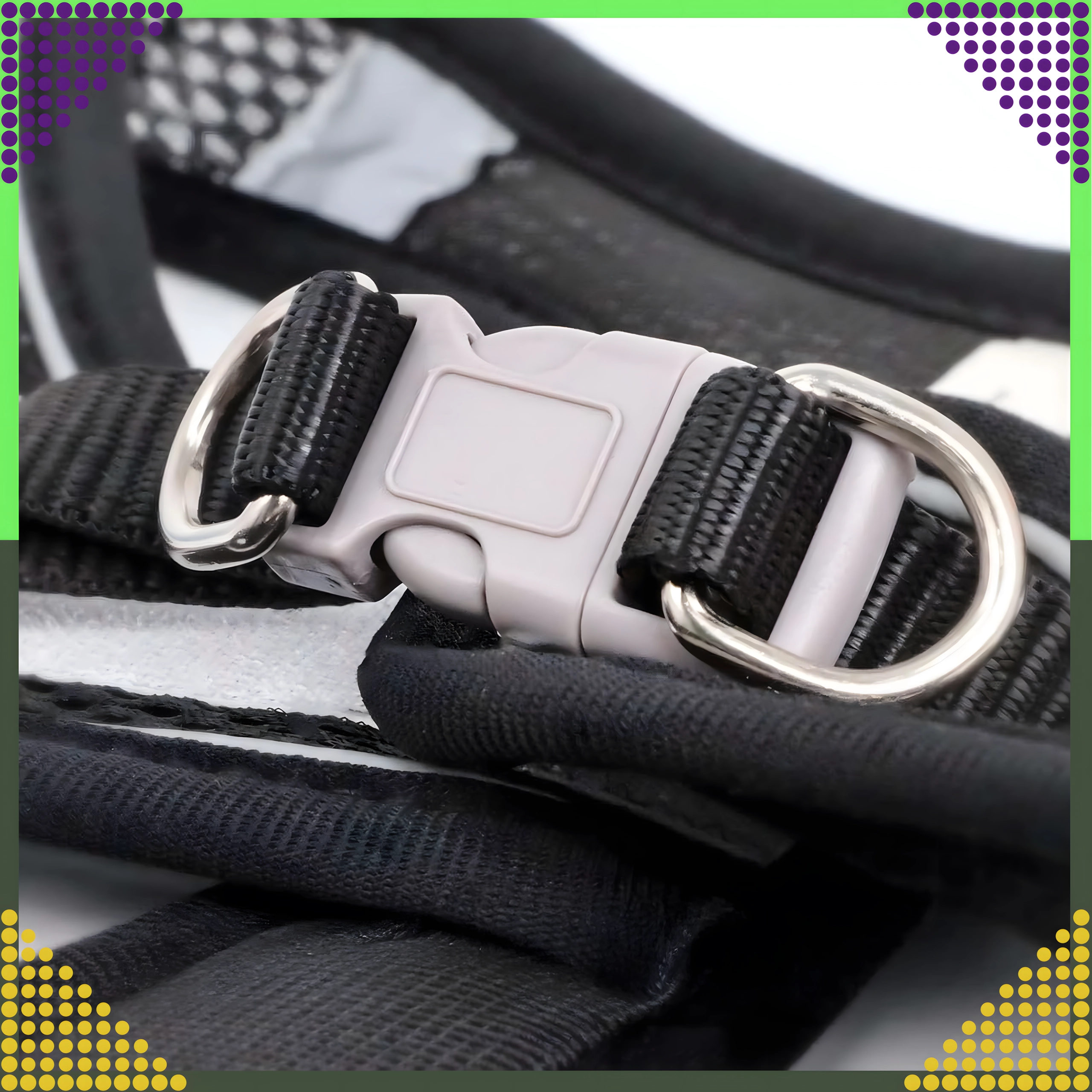 A dupla fém D-gyűrűk és a csatokkal ellátott állítható pántok stabilan a helyén tartják a hámot, és megkönnyítik a méret személyre szabását.