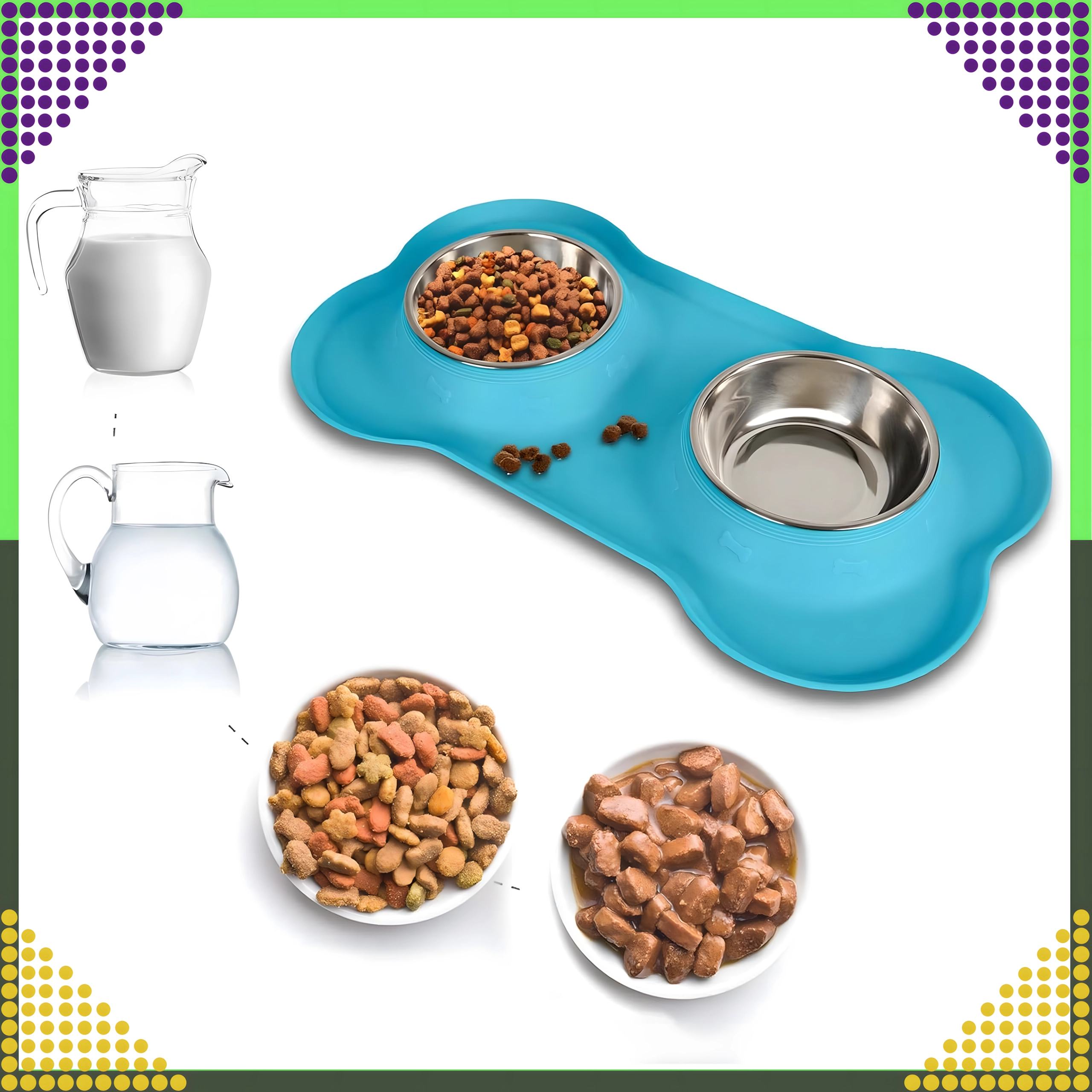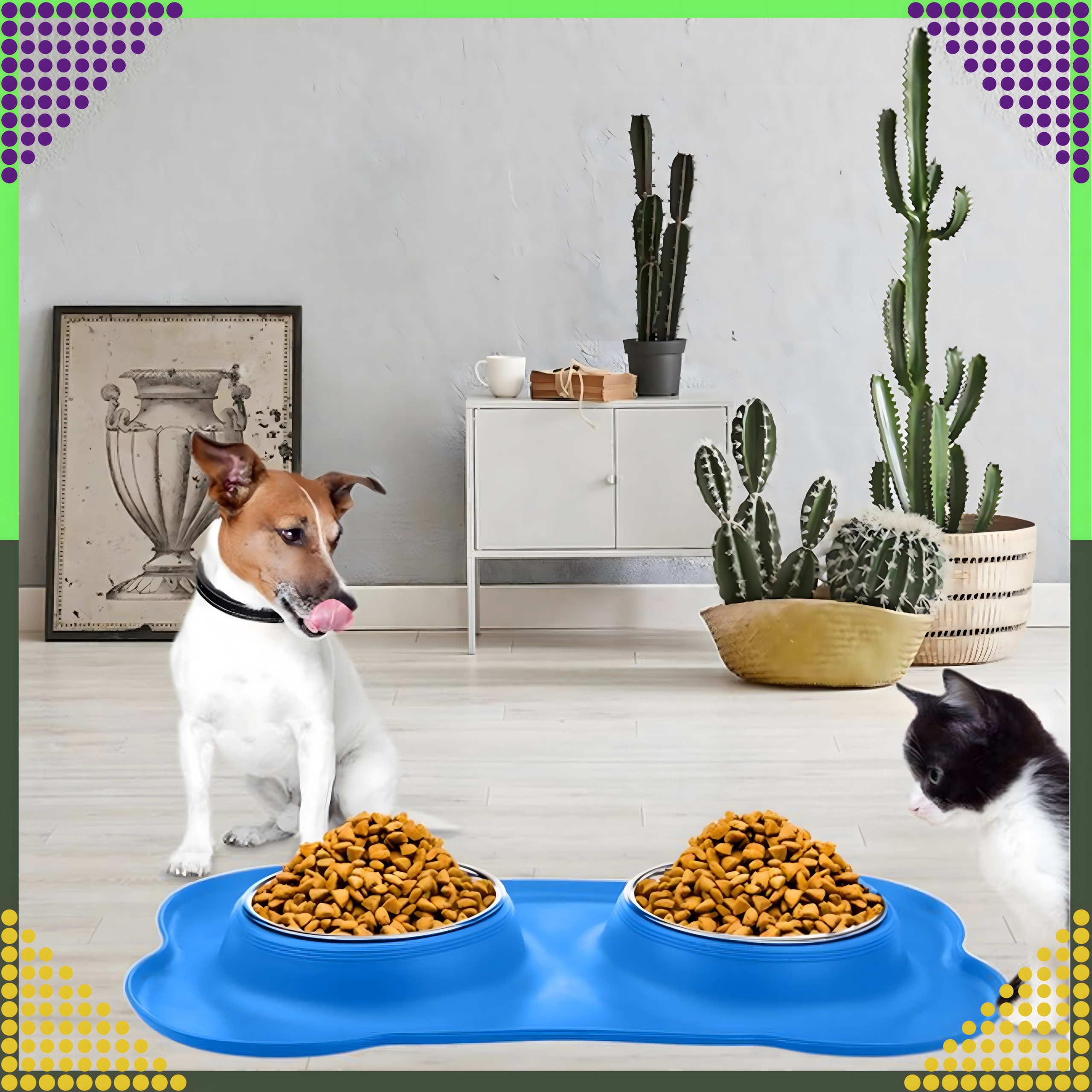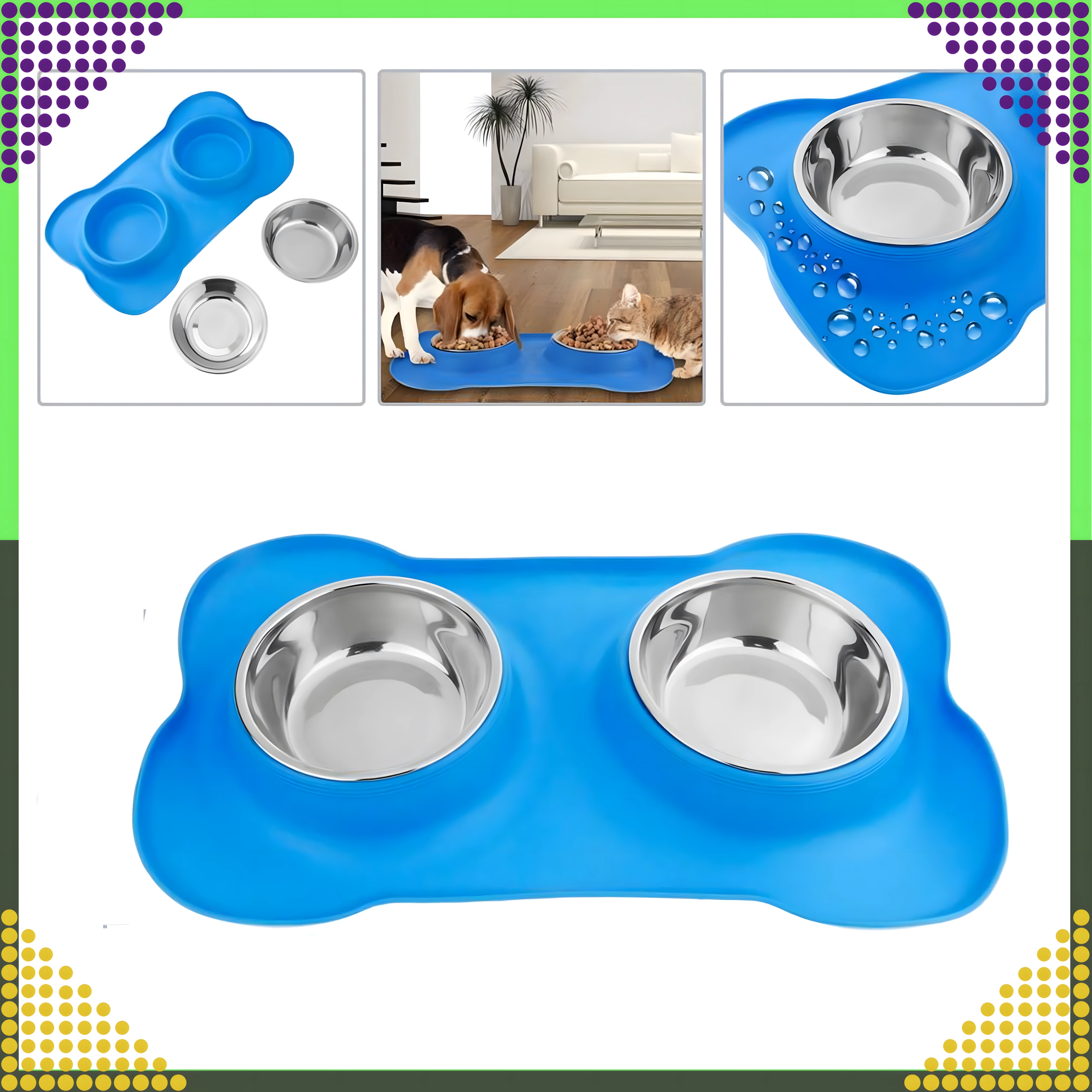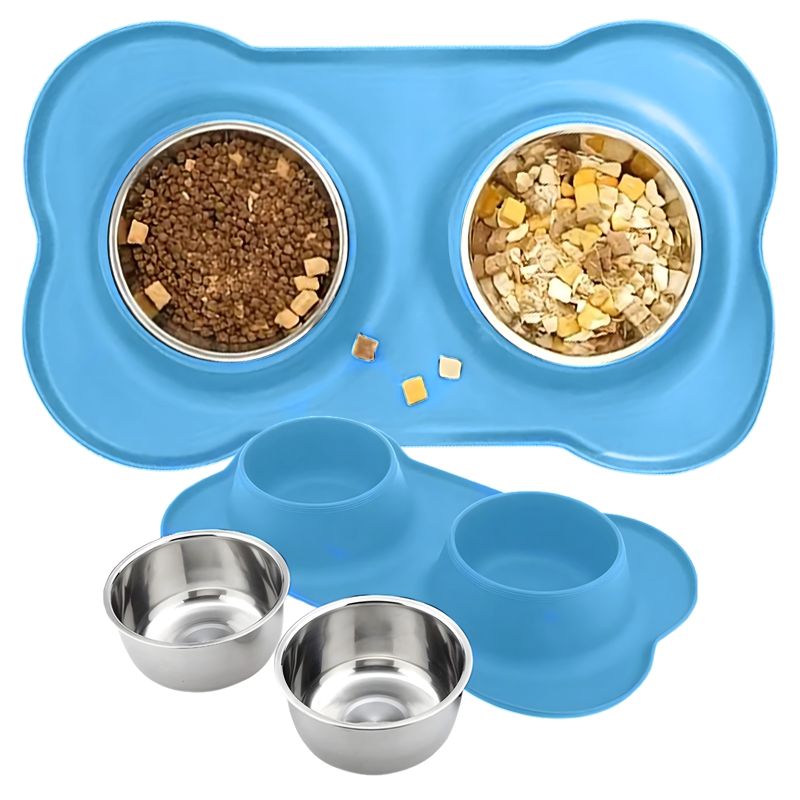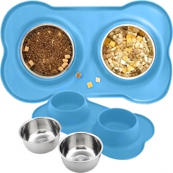 Praktikus, dupla etetőtál kutyáknak és macskáknak, amely kombinálja a két rozsdamentes acél tálat 2 × 450 ml és a csont alakú csúszásgátló szilikon alátétet. Ideális eledelhez és vízhez, könnyű tisztítással és kevesebb rendetlenséggel az etetés körül.