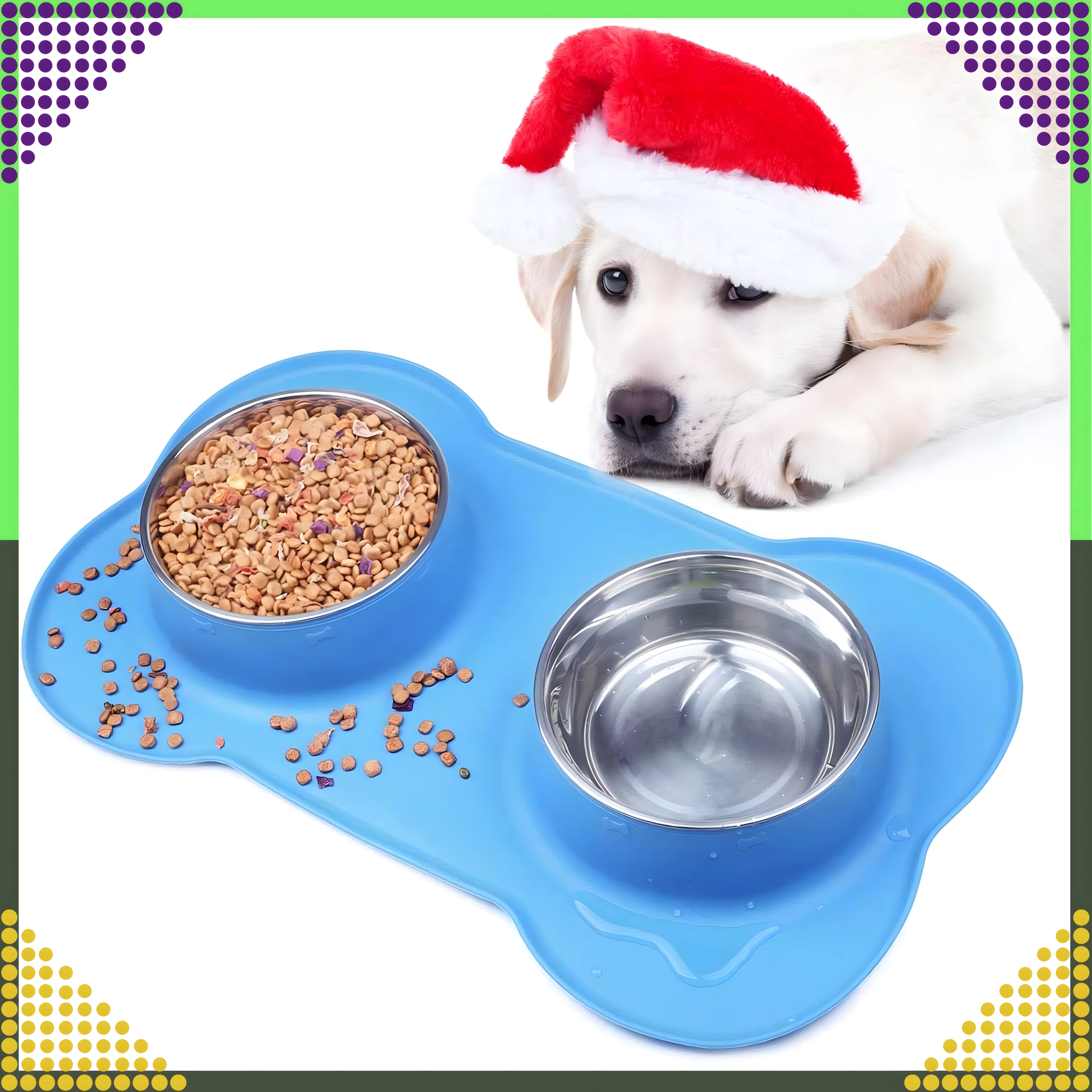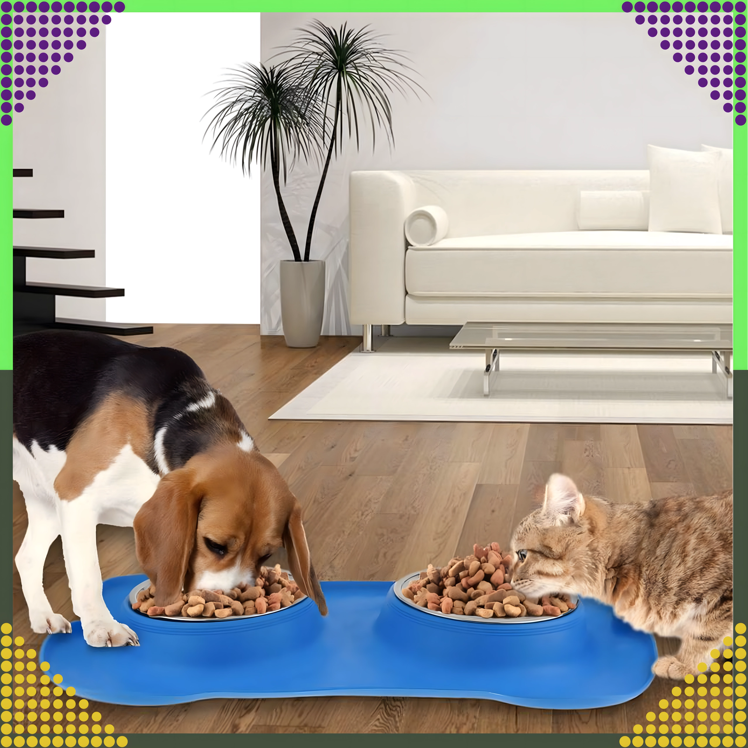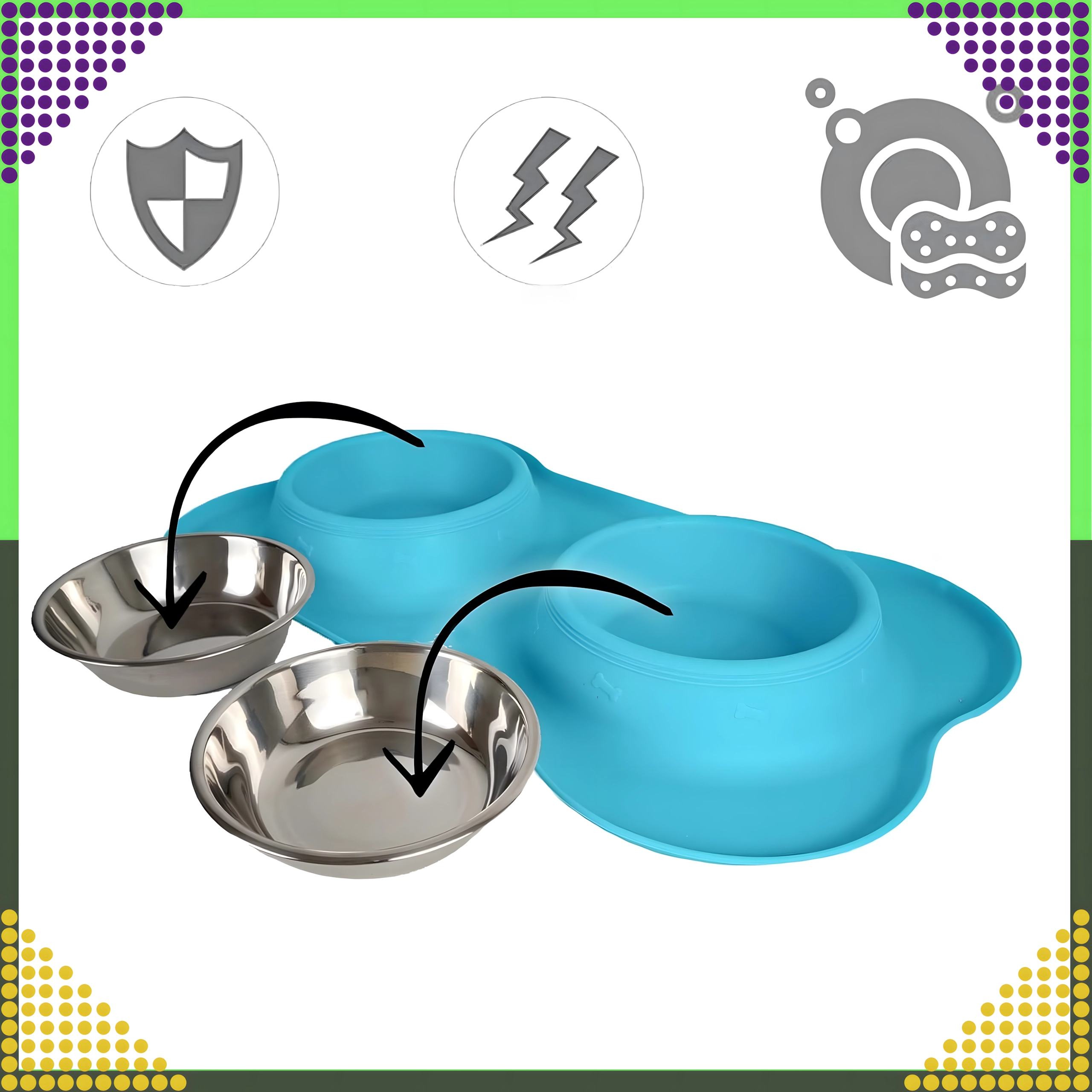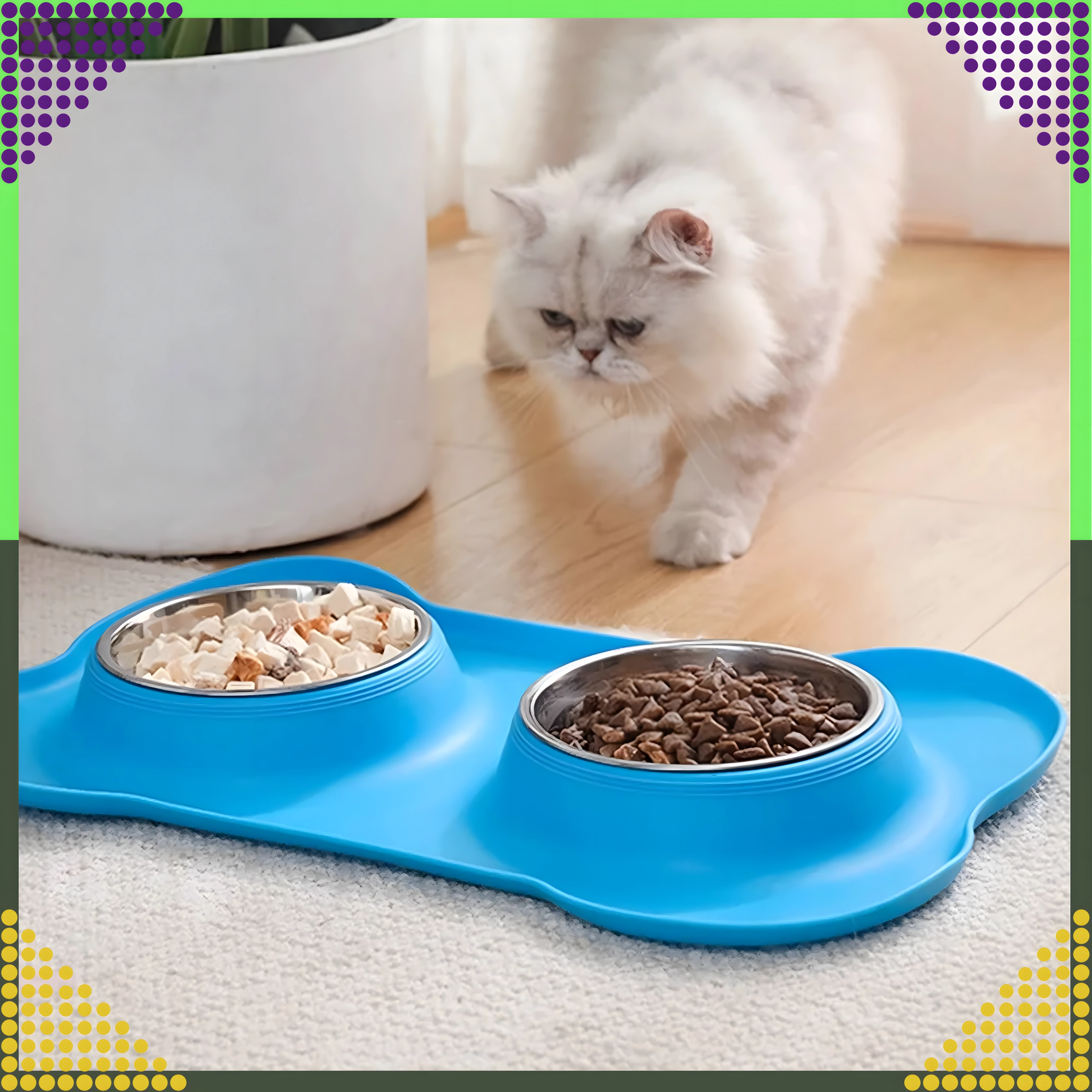 Praktikus, dupla etetőtál kutyáknak és macskáknak, amely kombinálja a két rozsdamentes acél tálat 2 × 450 ml és a csont alakú csúszásgátló szilikon alátétet. Ideális eledelhez és vízhez, könnyű tisztítással és kevesebb rendetlenséggel az etetés körül.