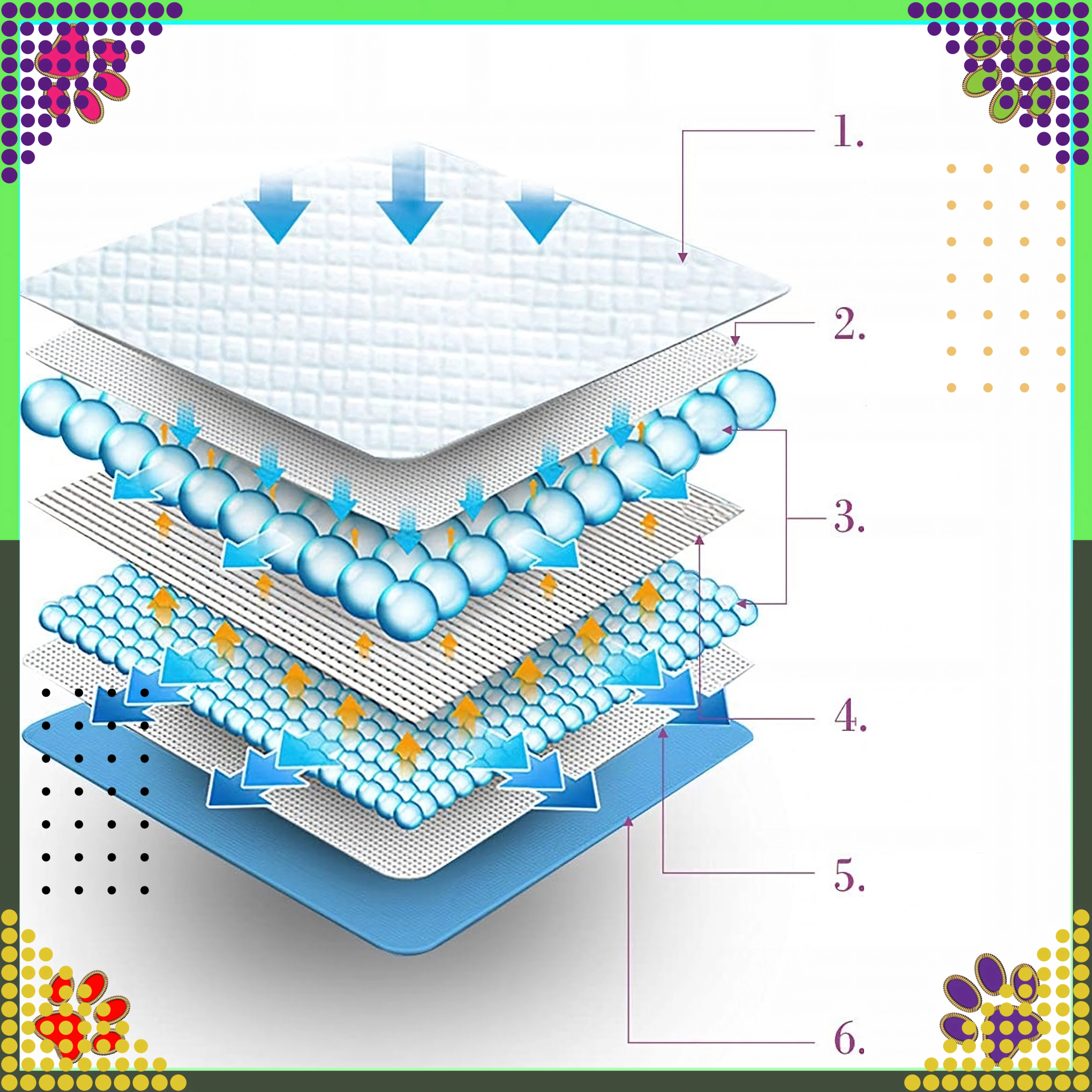 A többrétegű mag hatékonyan eloszlatja a folyadékot és azonnal felszívja azt. Az alsó vízhatlan fólia megbízhatóan megakadályozza az átszivárgást, miközben a puha felület kíméletes a mancsokhoz. Az alátétek nem rétegeződnek szét, kényelmesek, és használat után egyszerűen kidobhatók.