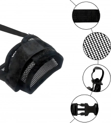 A praktikus hálós szájkosár megakadályozza a harapást és a nem kívánt felcsipegetést, ugyanakkor lehetővé teszi a szabad légzést és az enyhe hűtést. Az állítható pánt gyorscsatos zárral a helyén tartja a szájkosarat kellemetlen nyomás nélkül.