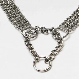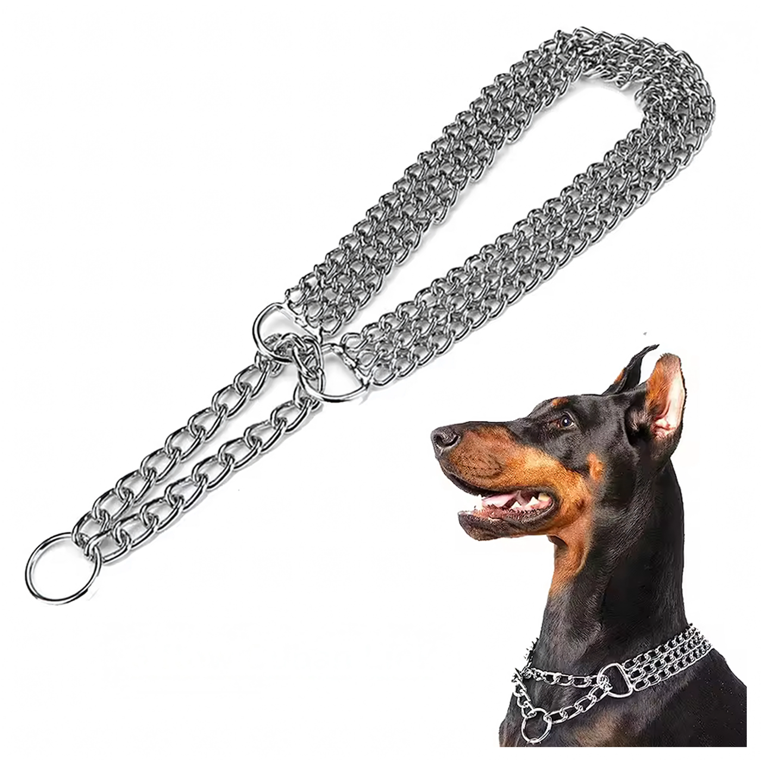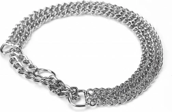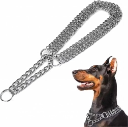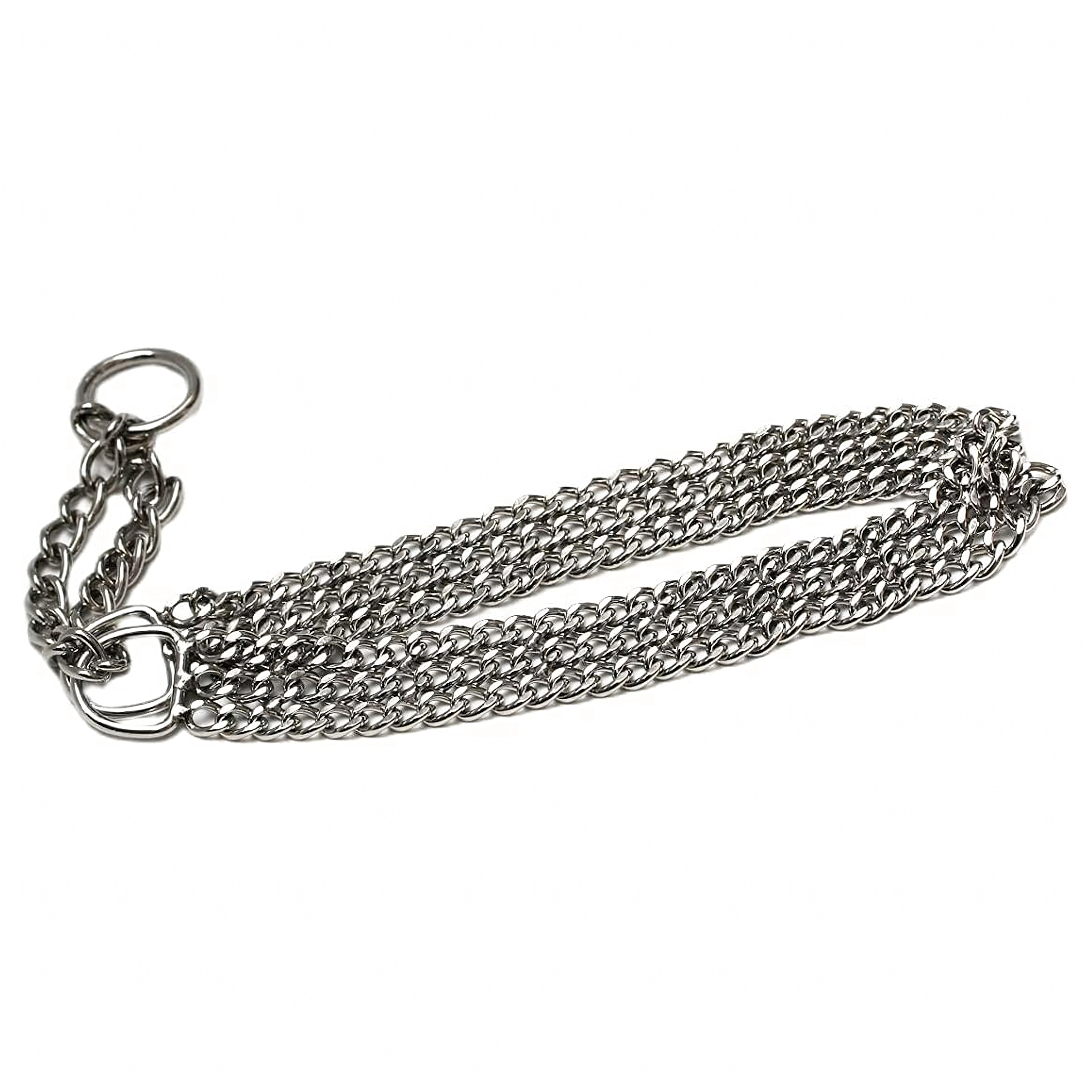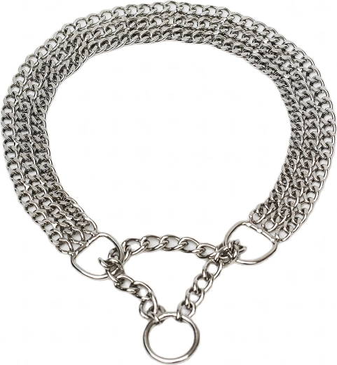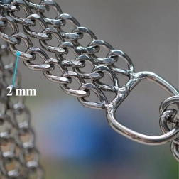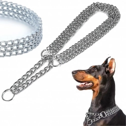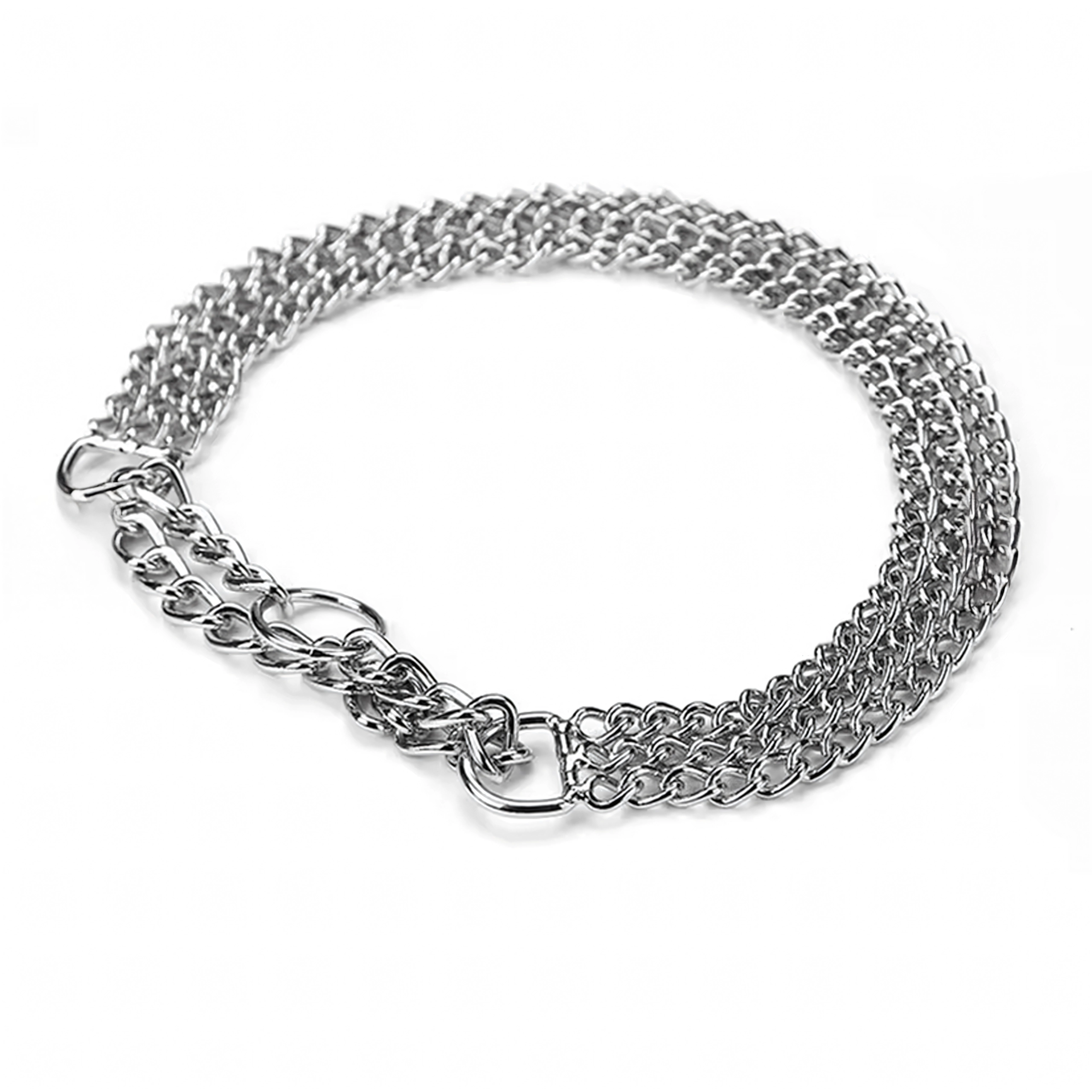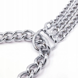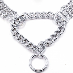 Ez a szűkítő láncos nyakörv minőségi krómozott acélból készült, amely magas szilárdságáról, korrózióállóságáról és a kutya kényelmét szolgáló sima felületéről ismert. A hármas lánc egyenletesen osztja el a nyomást, és pontos, érzékeny irányítást biztosít a kiképzés során.
