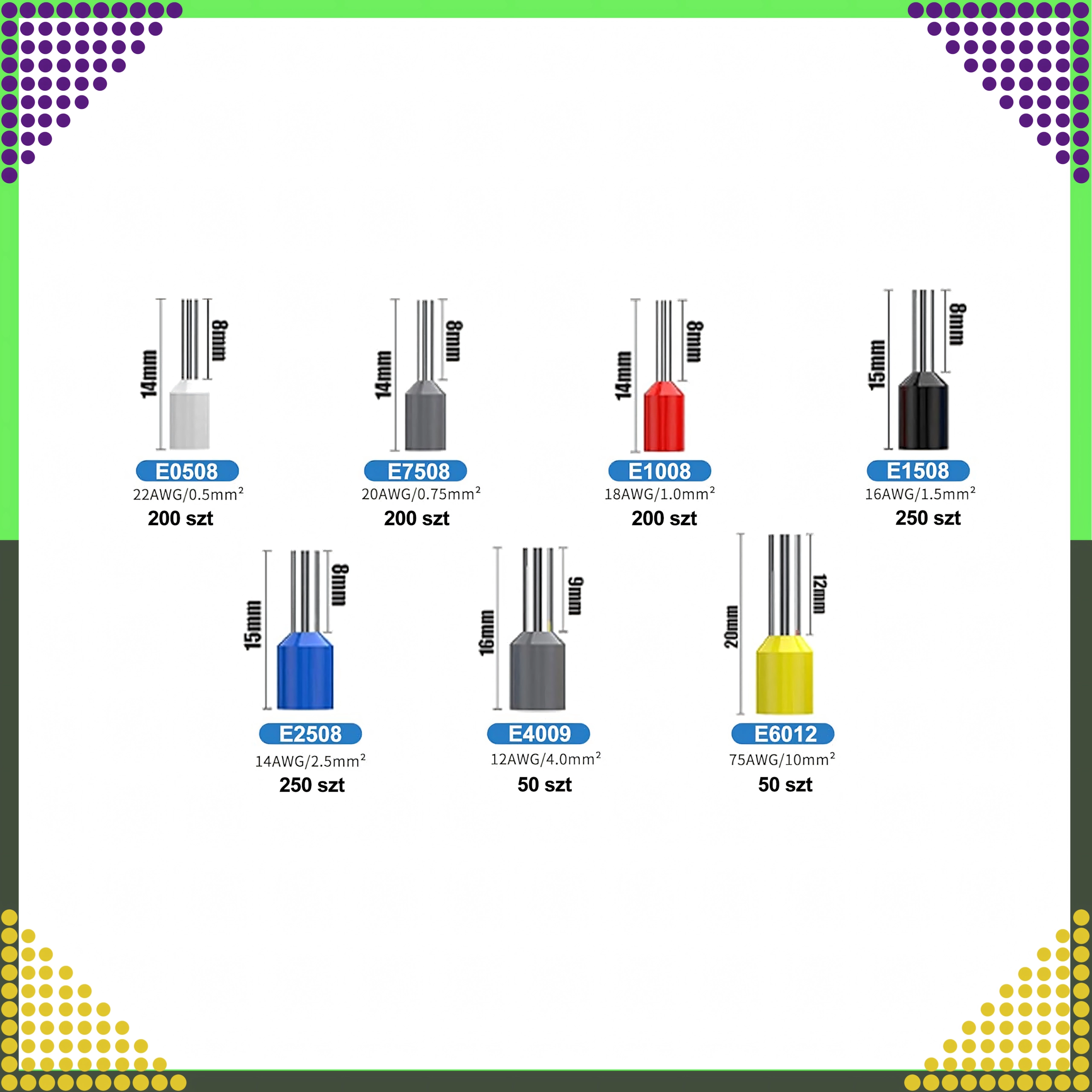 Ez a praktikus szett szigetelt érvégekből a sodrott (többszálú) vezetékek biztonságos és tiszta lezárására készült. Az érvégek összefogják és rögzítik az egyes szálakat, ezáltal rendet teremtenek az elosztószekrényben, megakadályozzák a vezeték kicsúszását, és minimalizálják a zárlat kockázatát. A színkódolásnak köszönhetően gyorsan kiválasztható a megfelelő méret az adott keresztmetszethez.