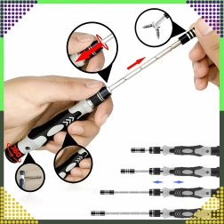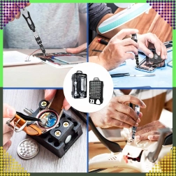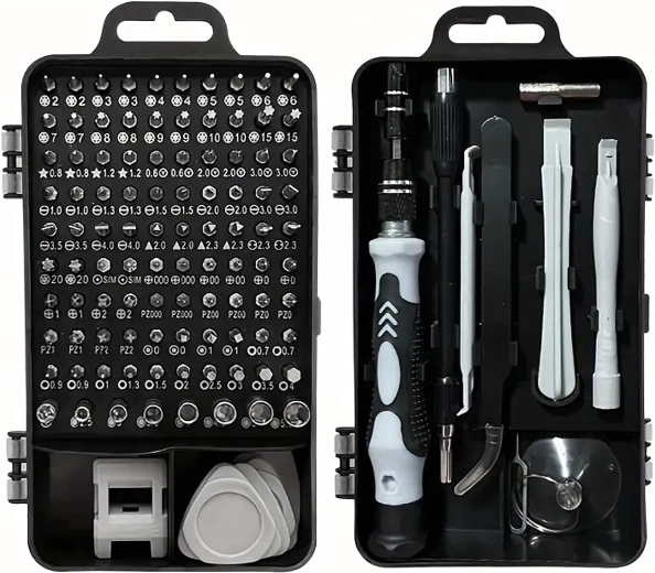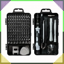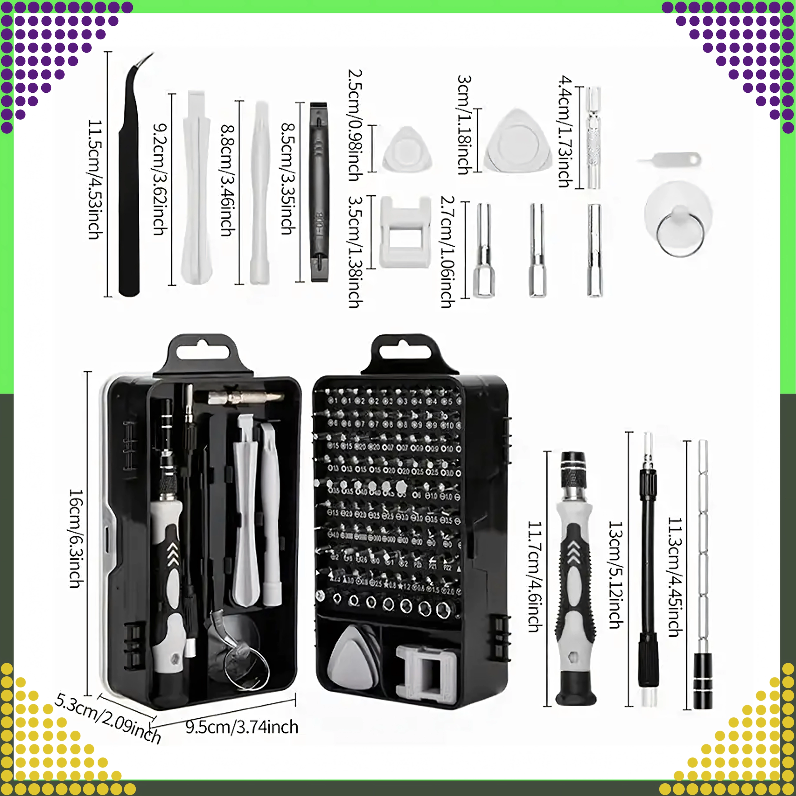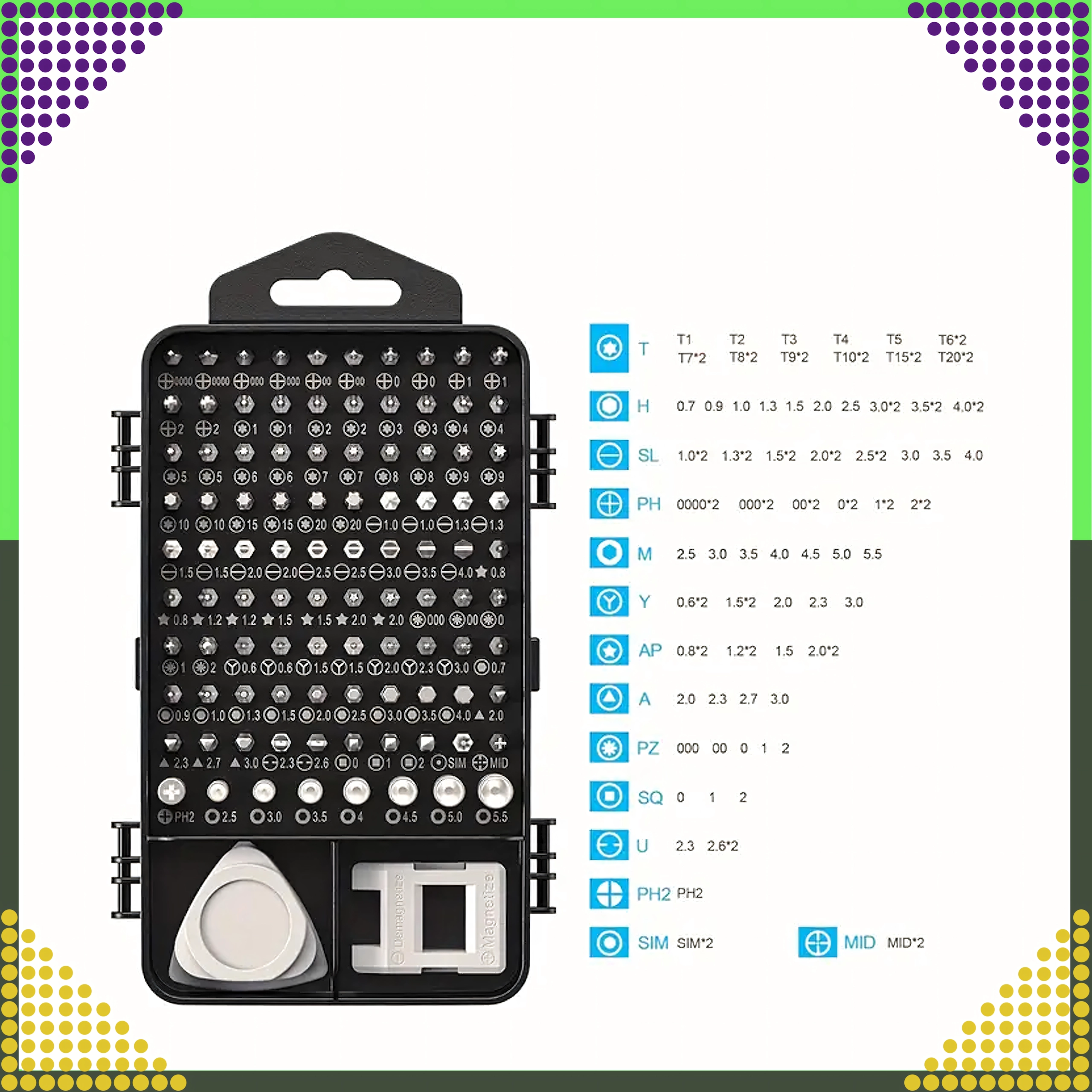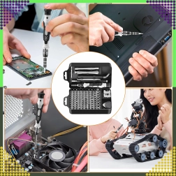 Talál benne 100 mágneses bitet hosszabb szárakkal a jobb elérésért, nyélhez való hosszabbítót, csipeszt, tapadókorongot, bontóeszközöket és háromszög nyitókat, valamint mágnesesítőt/demagnetizálót. A készlet ideális telefonok, laptopok, PC-k, órák, szemüvegek, fényképezőgépek és apró modellek javításához.