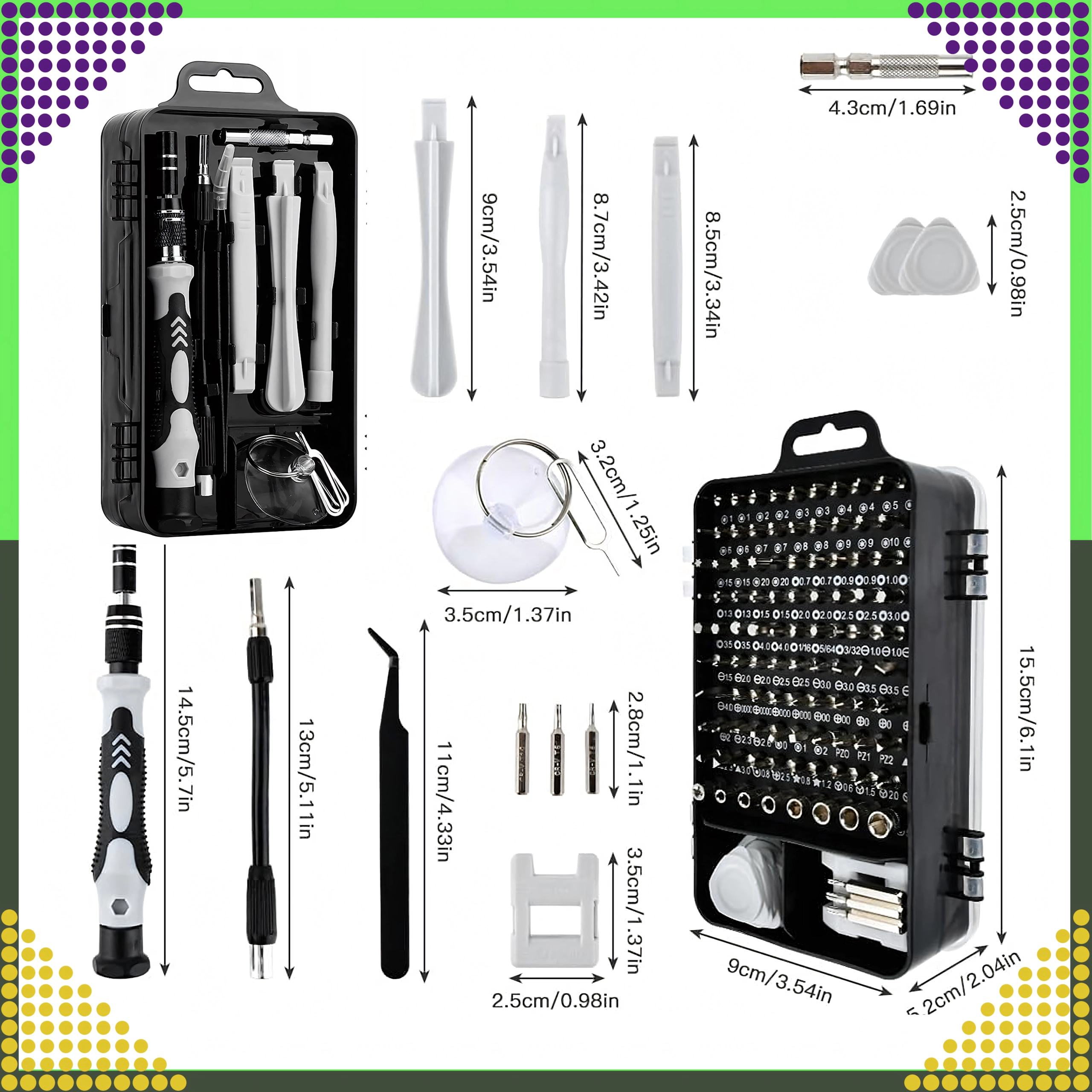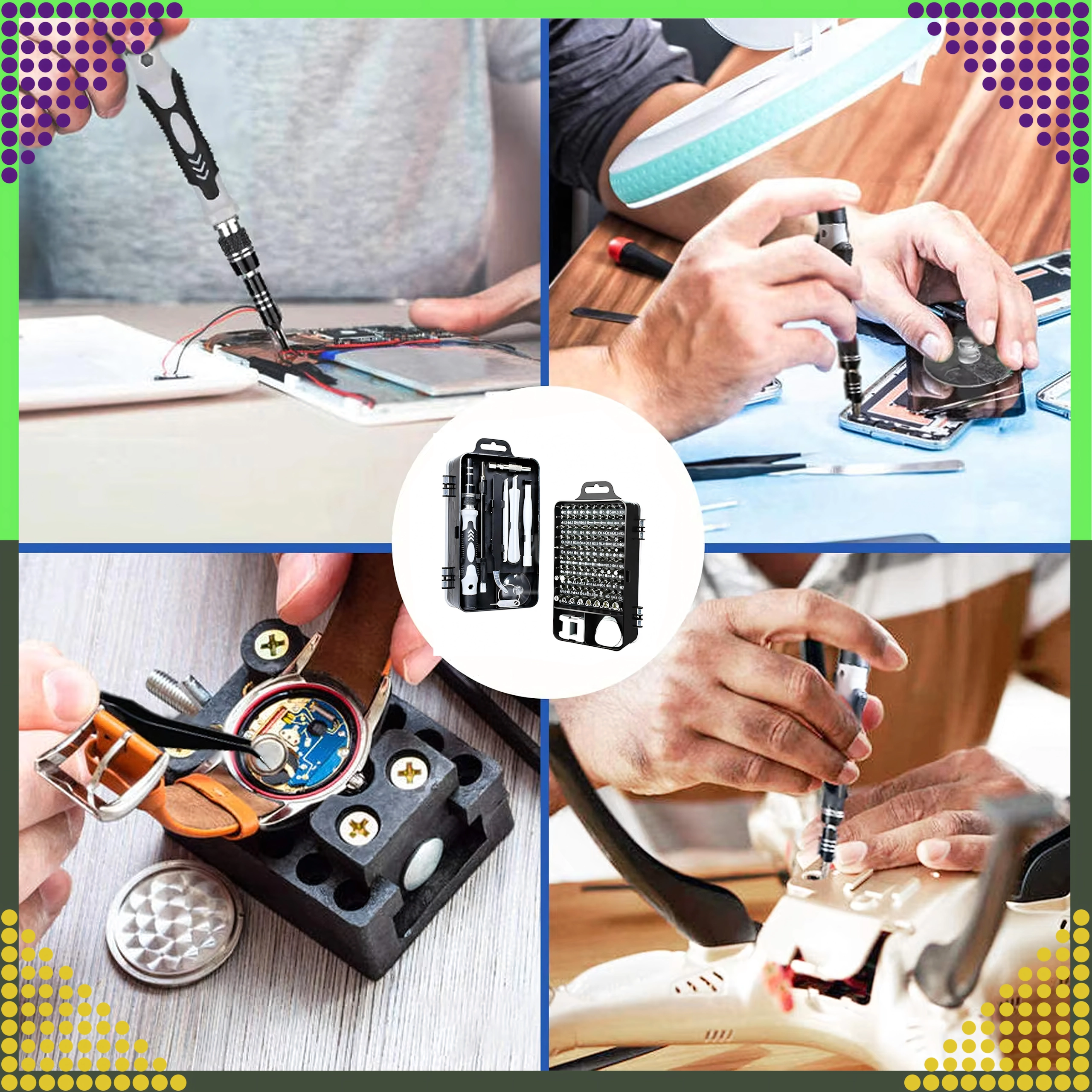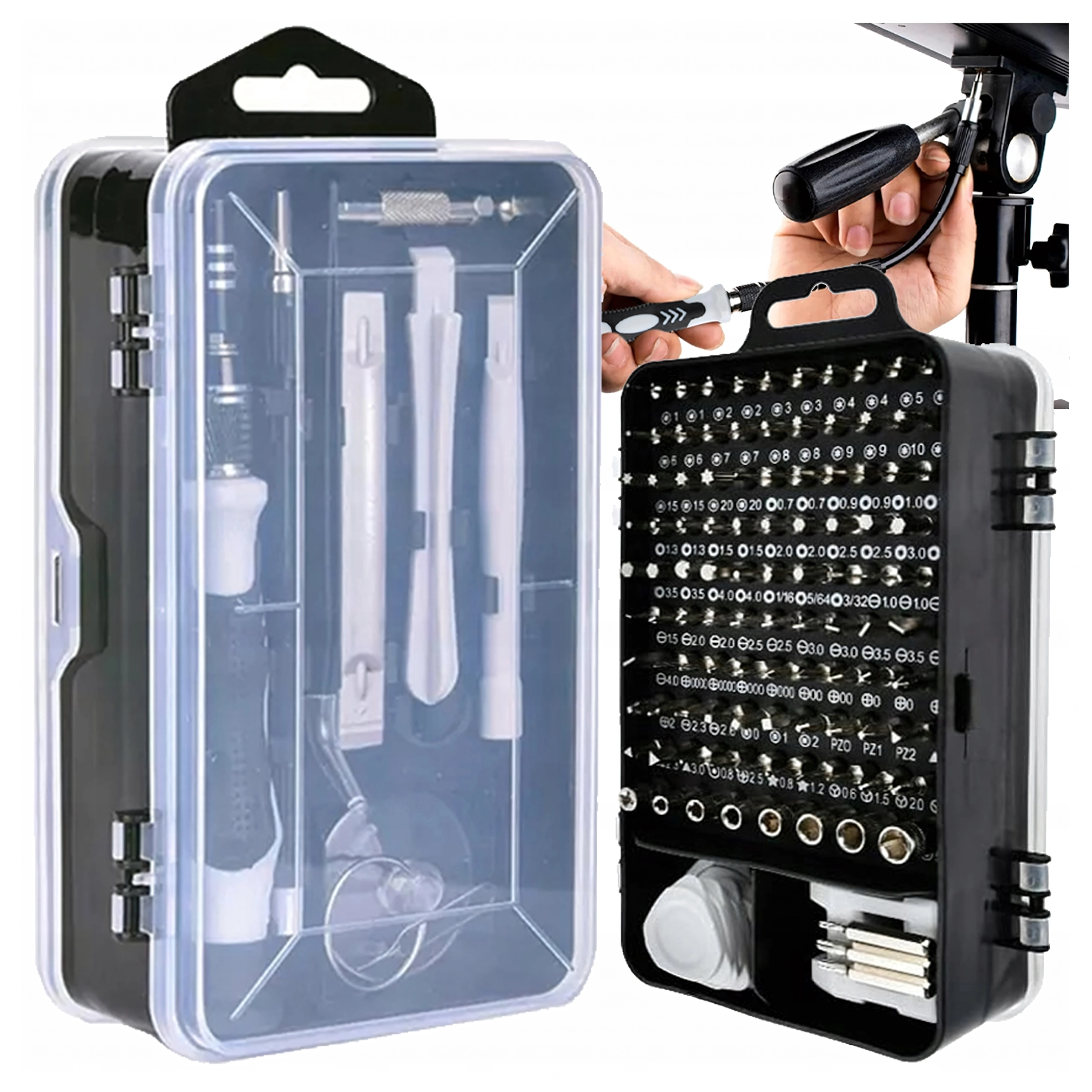 Teljes készlet finommechanikai javításokhoz és szereléshez: precíziós csavarhúzók és akár 118 elem cserélhető bitekkel, köztük TORX, Philips és lapos. A mágneses hegyeknek, az ergonomikus markolatnak és a kompakt toknak köszönhetően gyorsan végezhet elektronikai eszközökön, órákon, szemüvegen és PC-n anélkül, hogy elveszítené az apró csavarokat.