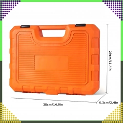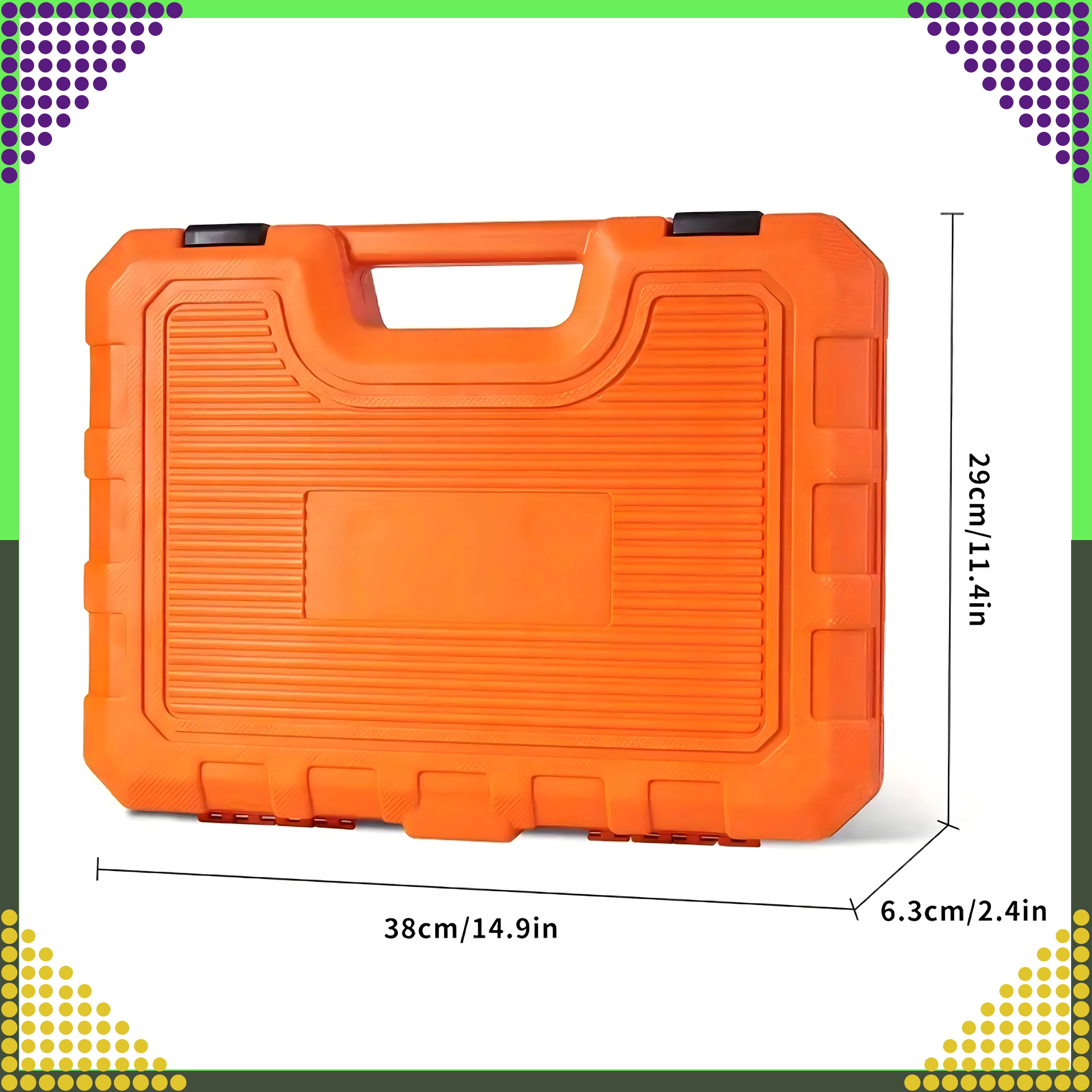 Átláthatóan elrendezett metrikus és SAE dugókulcsok, racsni, hosszabbítók és adapterek a strapabíró narancssárga kofferben az egyszerű szállításhoz.