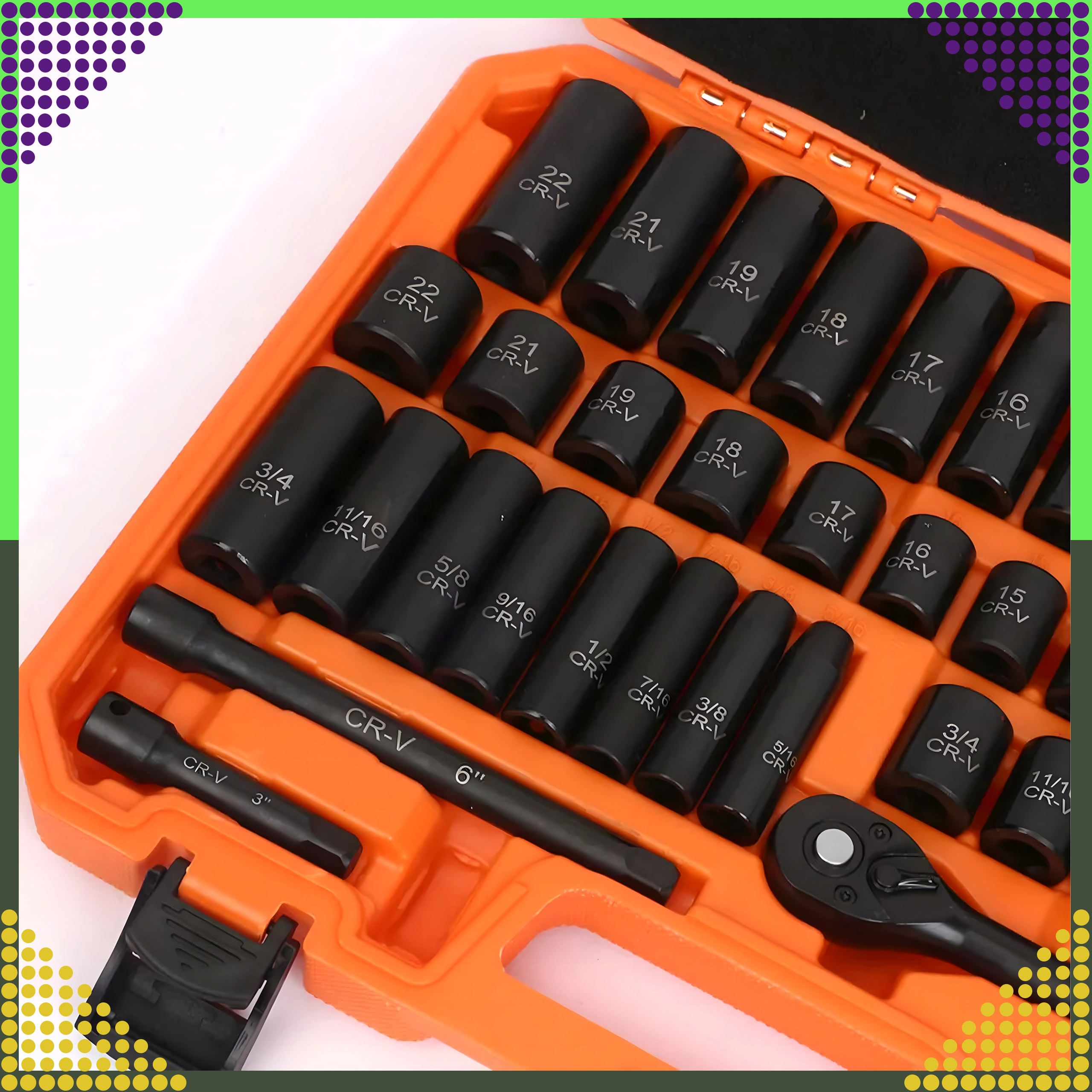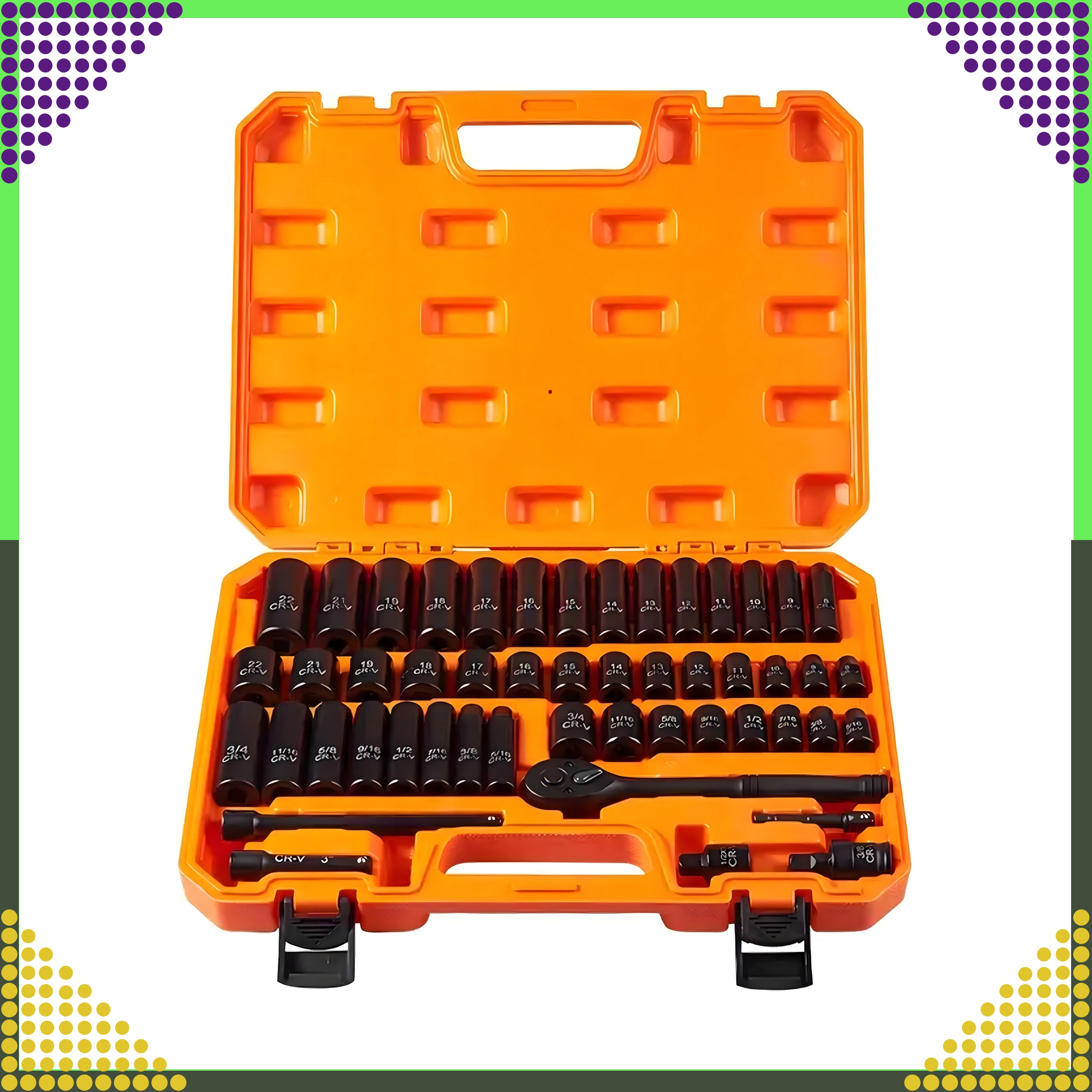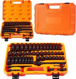 Professzionális 3/8'' meghajtású ütvecsavarozó készlet, akár 50 darabbal metrikus és SAE méretekben. Hatszög profilú dugókulcsok a biztos fogásért, 3/8'' racsni, hosszabbítók és univerzális csukló. Tartós Cr-V acélból készül, és masszív hordtáskában kerül szállításra a tökéletes rendszerezéshez.