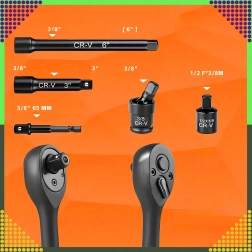 A precíz racsni ergonomikus markolattal gyorsítja a munkát, a hosszabbítók és a csukló pedig jobb hozzáférést adnak szűk helyeken. A tartós króm-vanádium acél (Cr‑V) nagy élettartamot és megbízhatóságot kínál ütőigénybevétel mellett, míg a masszív koffer mindent áttekinthetően és hordozásra készen tart.