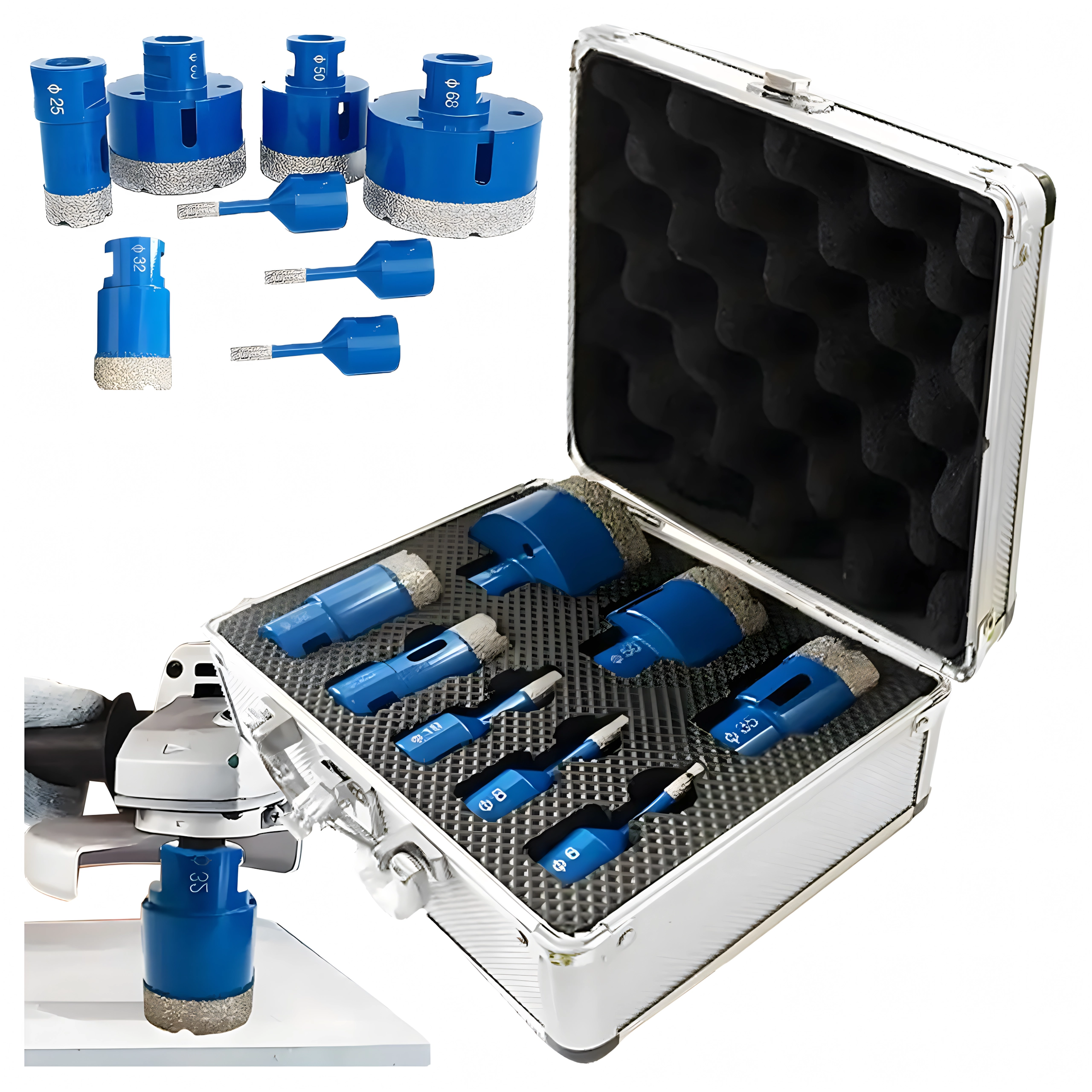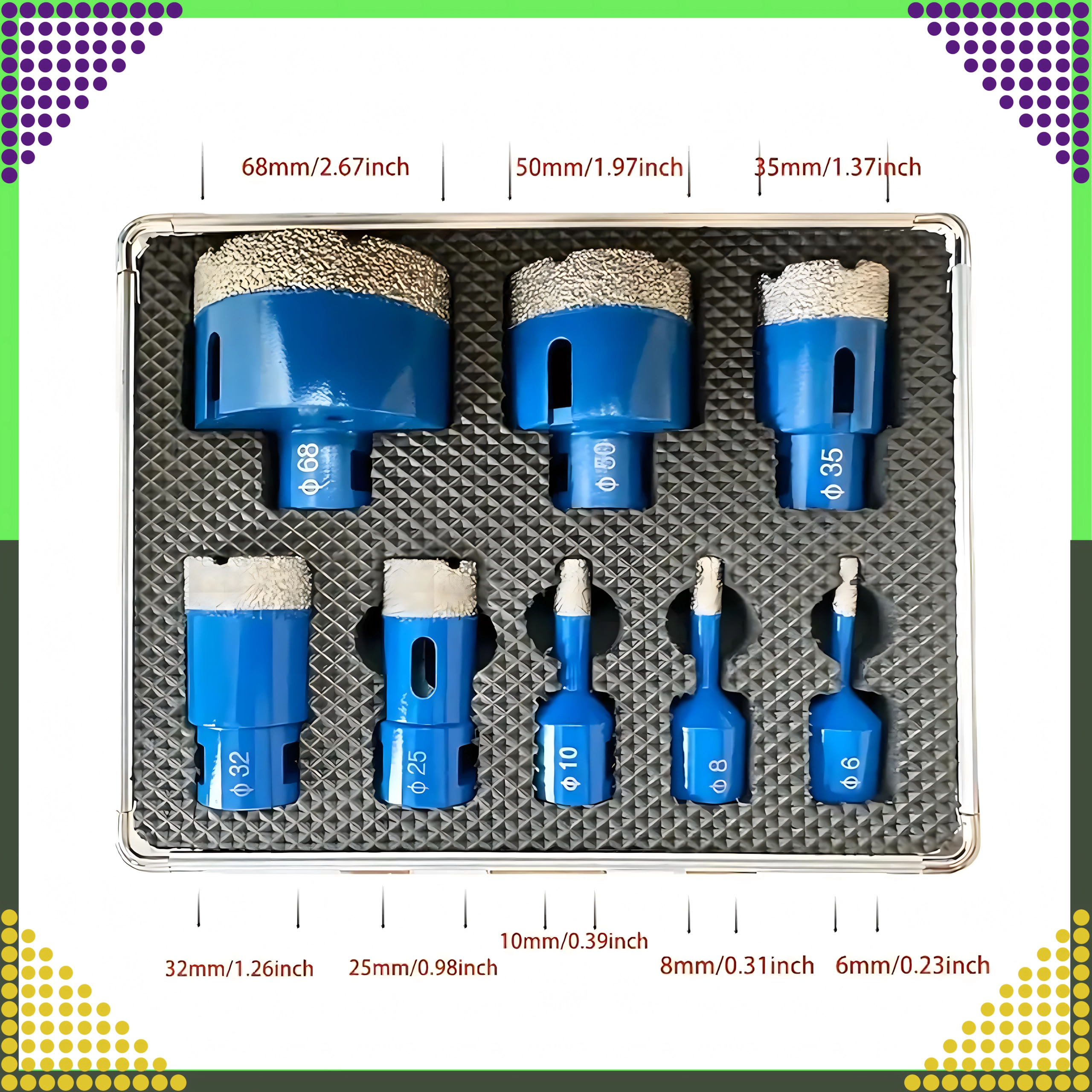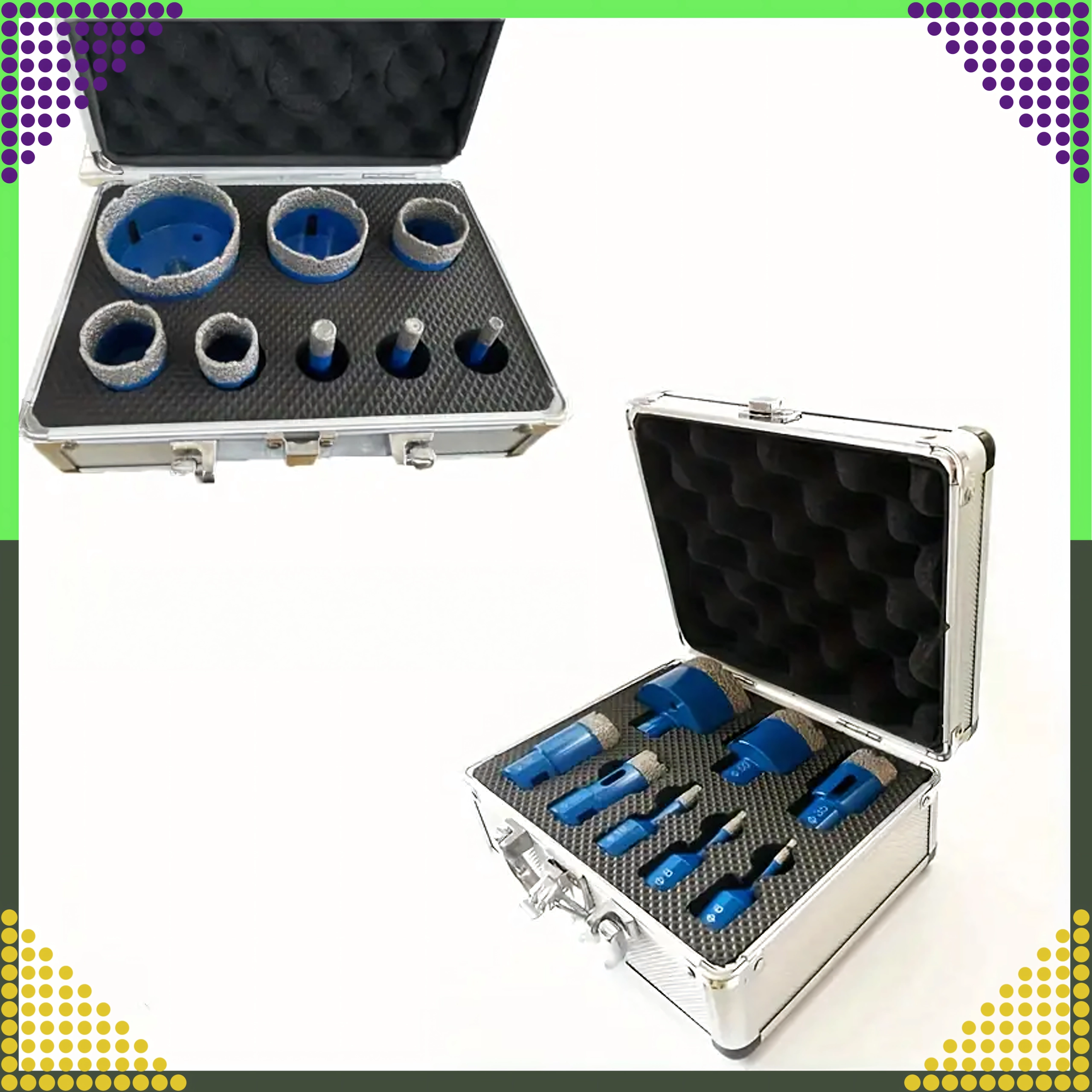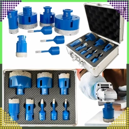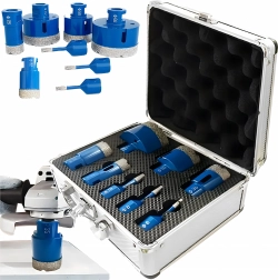 Univerzális gyémánt koronafúró-készlet precíz fúráshoz greszben, csempében, betonban, téglában és gránitban. Tartalmaz 8 méretet (6, 8, 10, 25, 32, 35, 50, 68 mm) széles felhasználásra. A tartós gyémántréteg hosszú élettartamot és sima furatéleket biztosít. Mindez egy praktikus alumínium kofferben a biztonságos szállításhoz és tároláshoz.